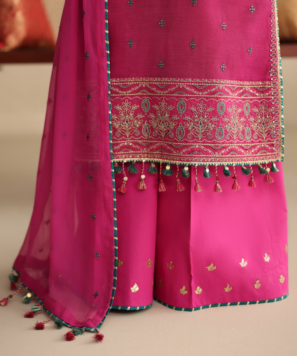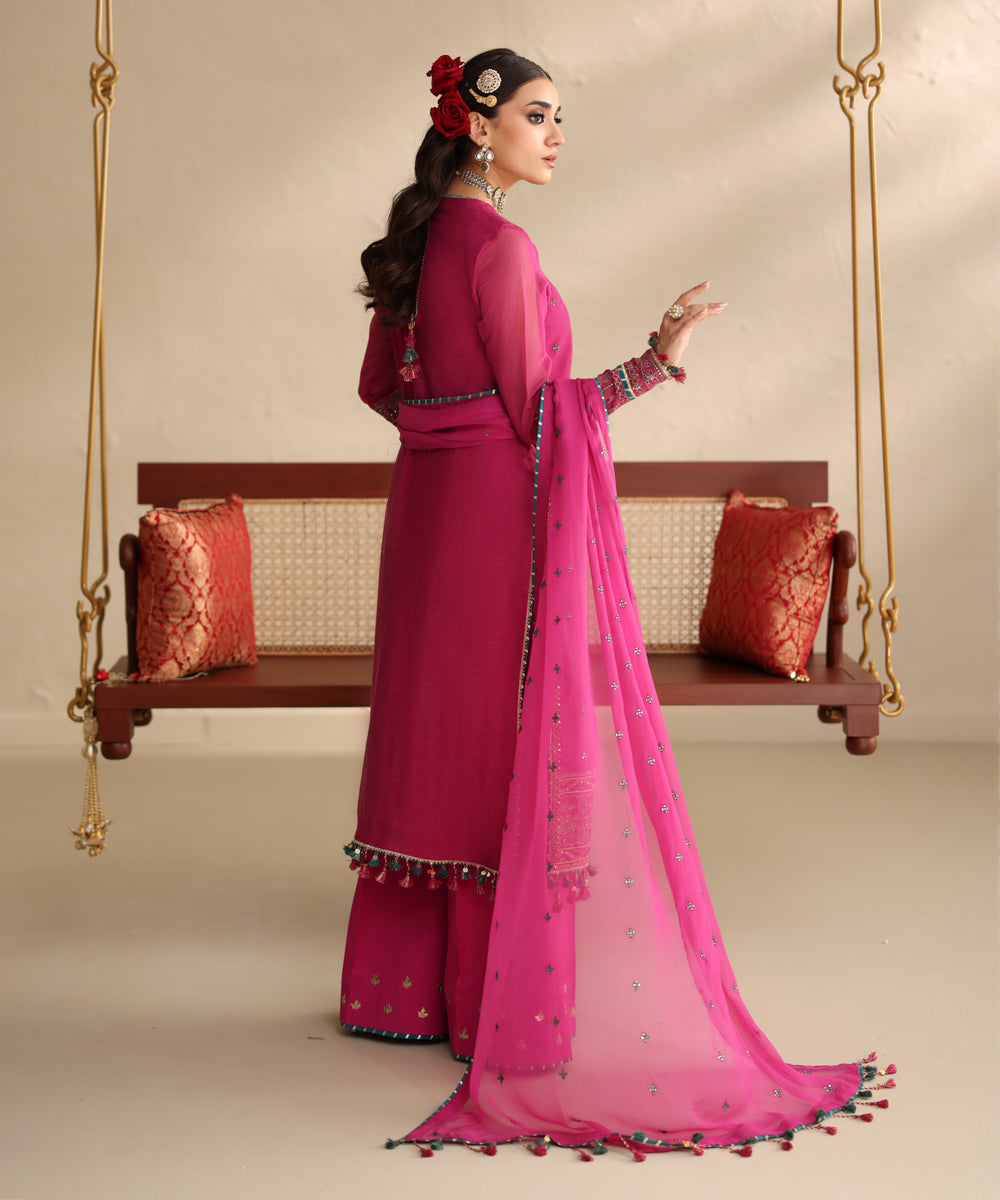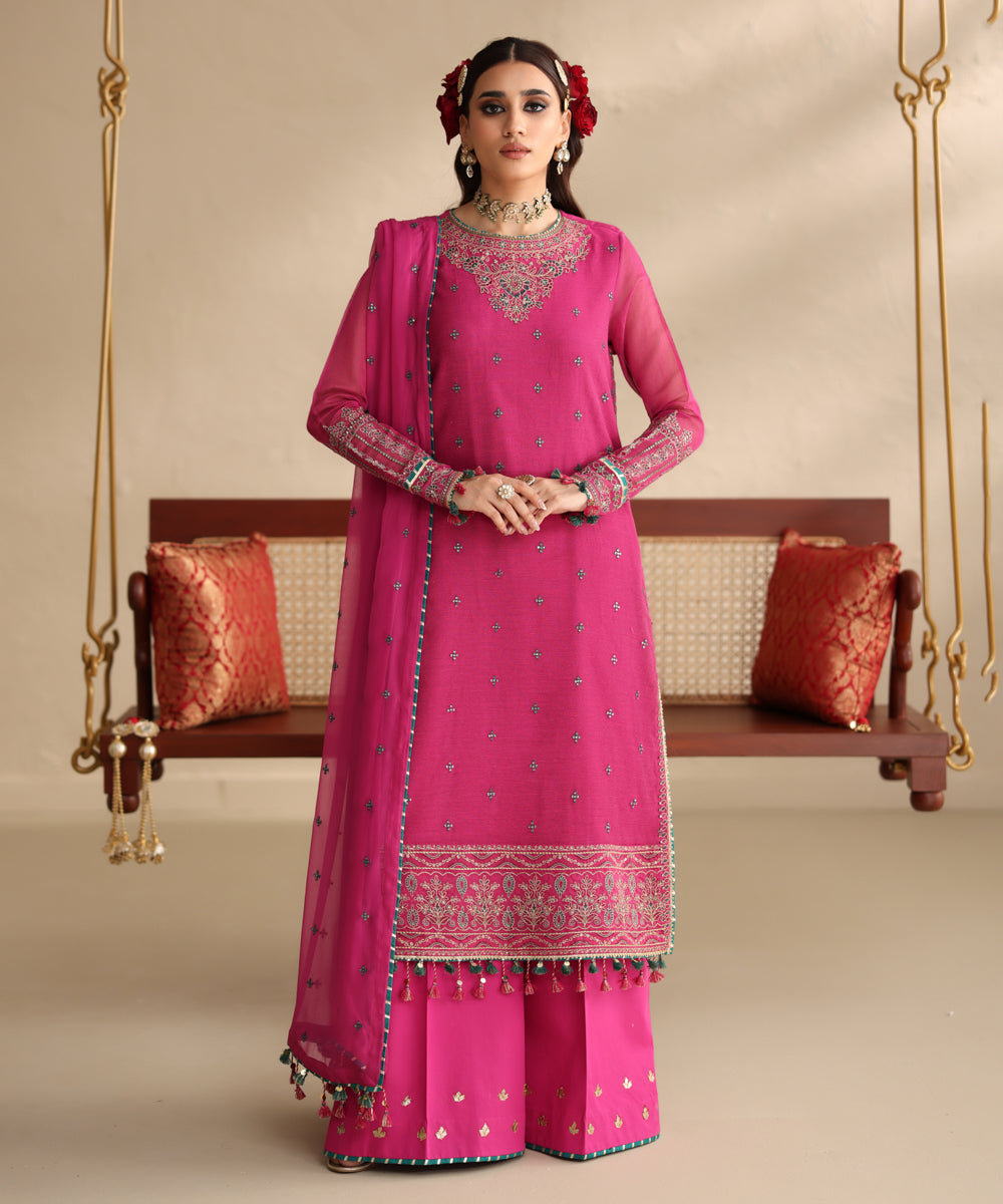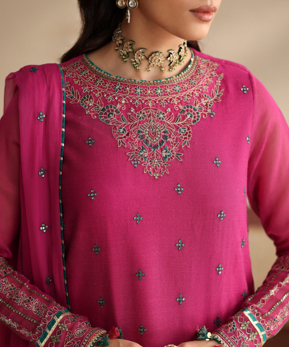 Make a festive statement in our embroidered pink blended viscose khaddi net shirt and viscose raw silk trousers paired with a crinkle chiffon dupatta.
