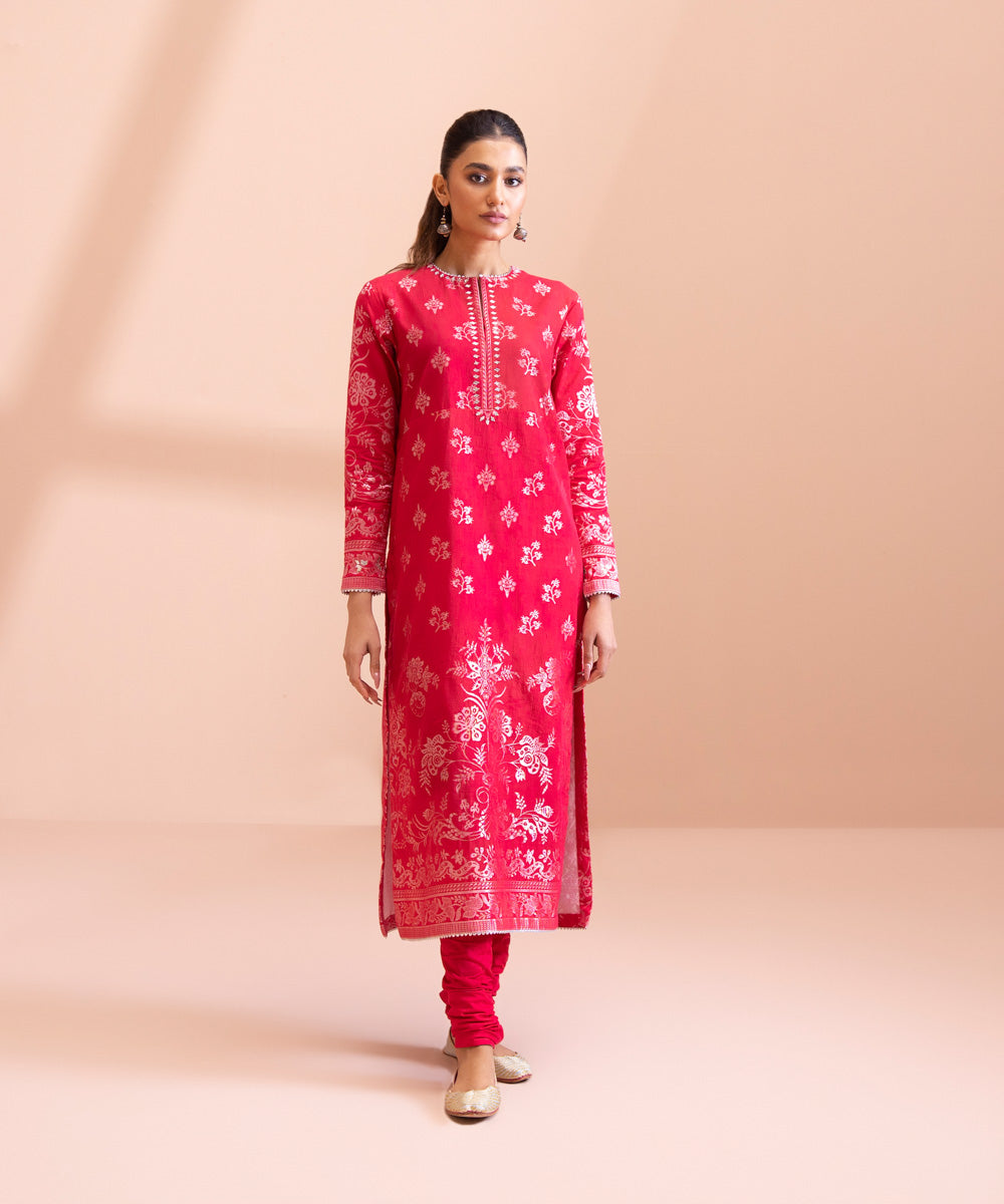 Indulge in a ruby affair with this extra weft jacquard two-piece ensemble.