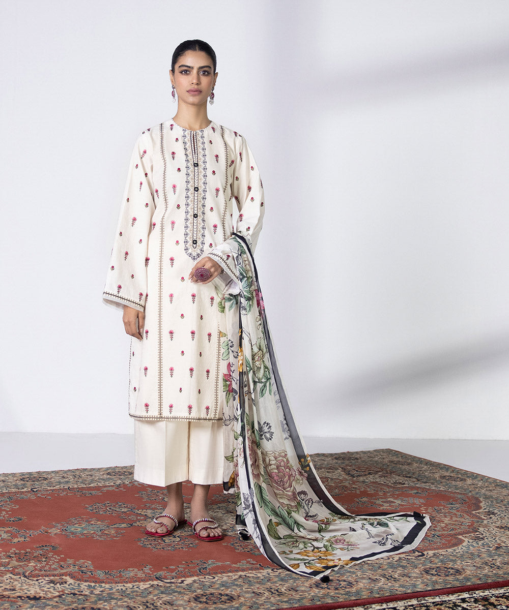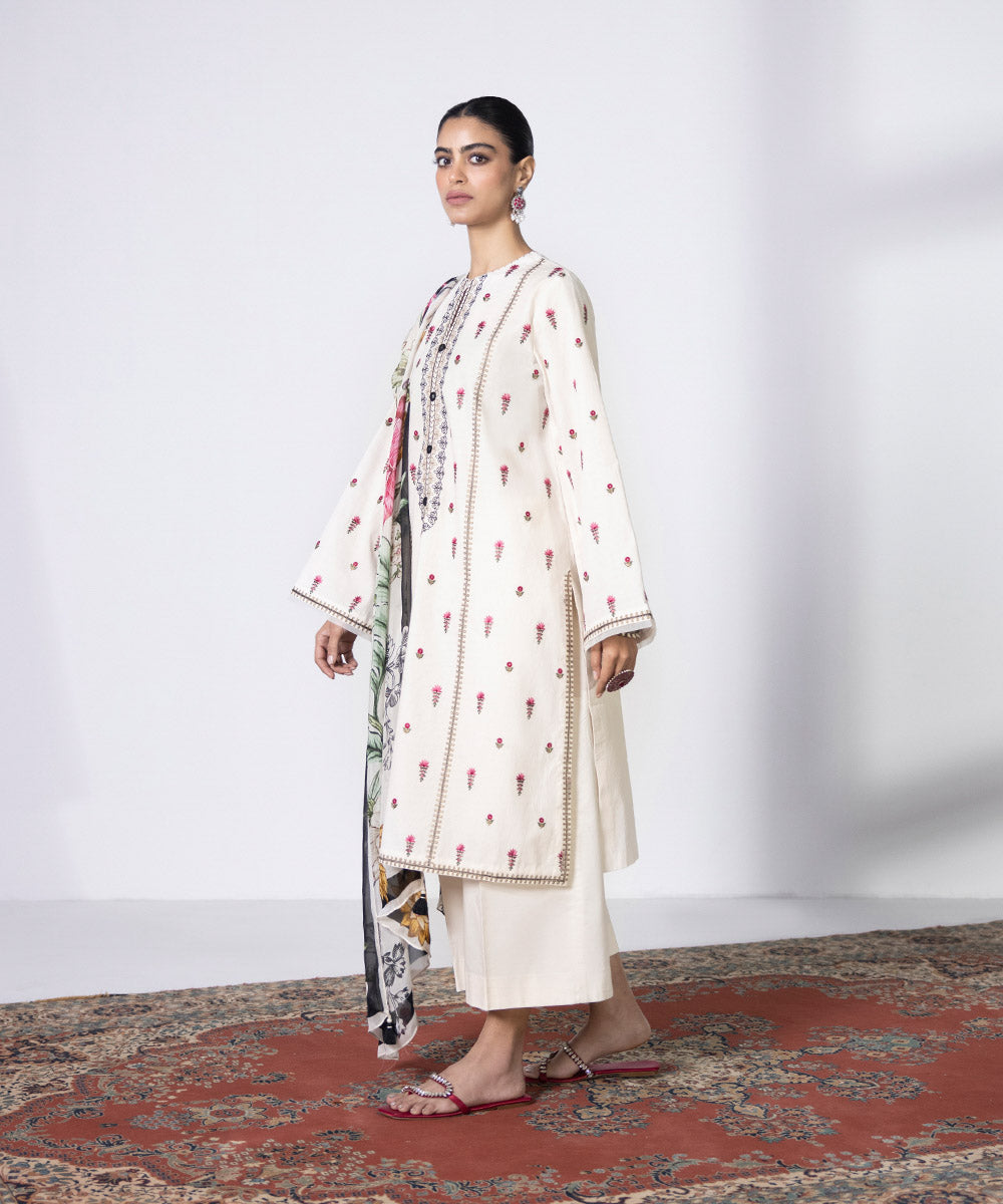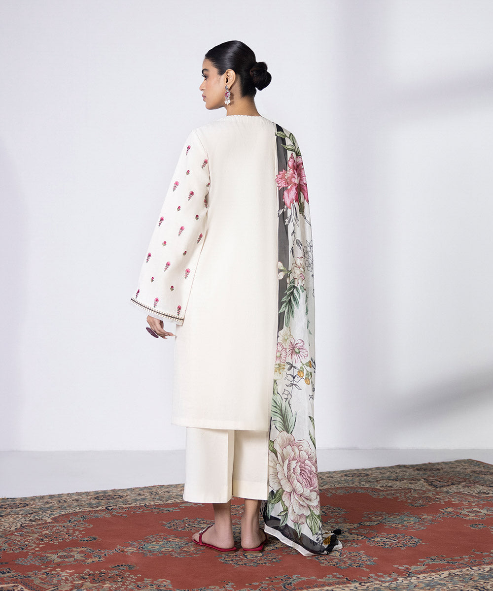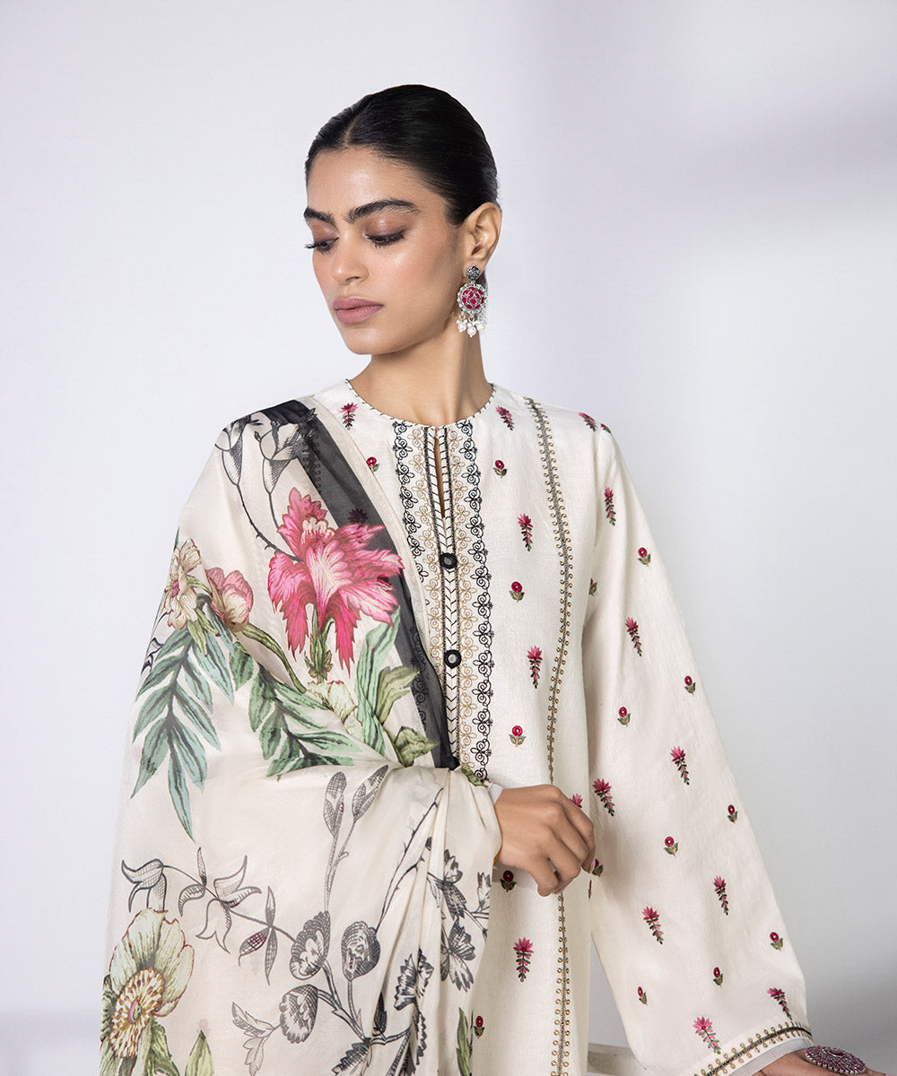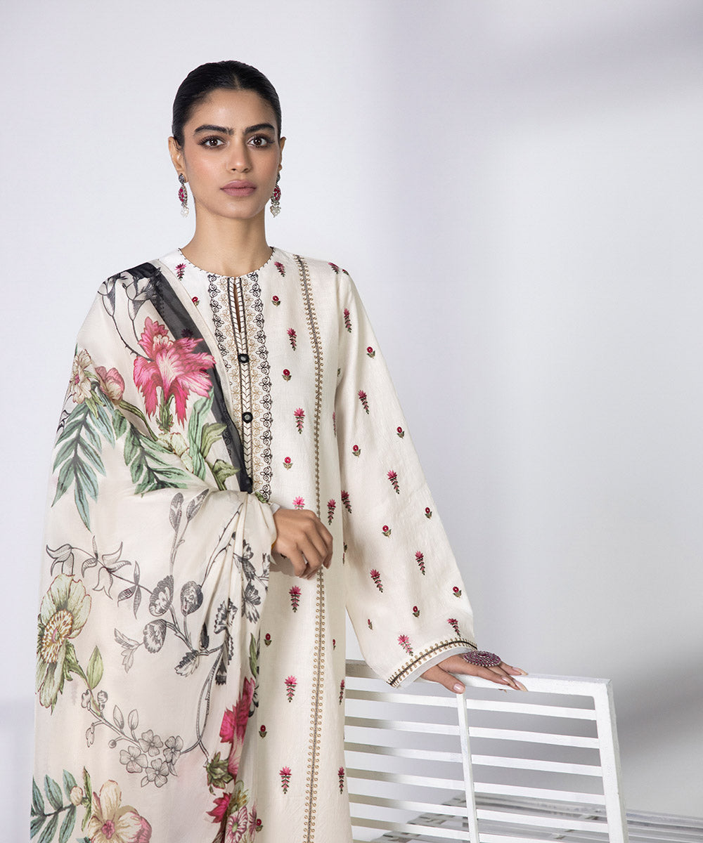 Enliven your look with floral illustrations with this off white cambric embroidered ensemble paired with a tissue dupatta.