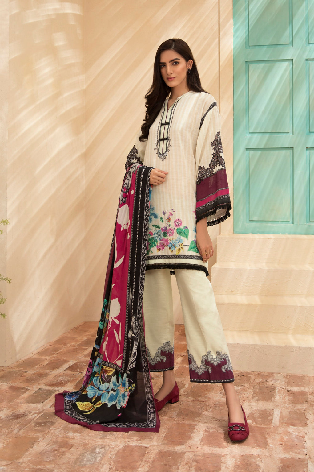 Digitally printed unstitched khaddar ensemble encrusted in jewel-toned hues and eye-catching floral print.