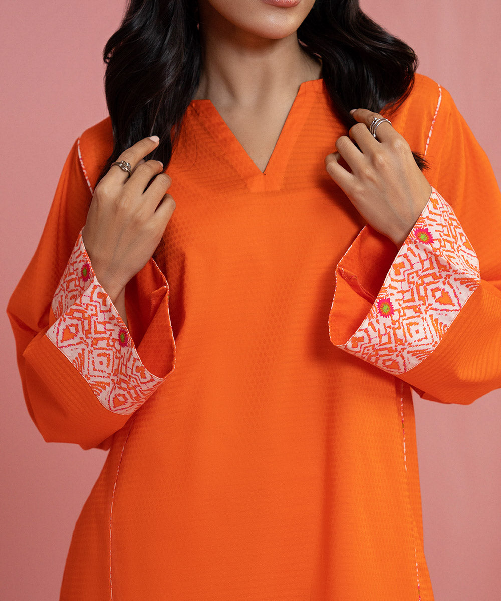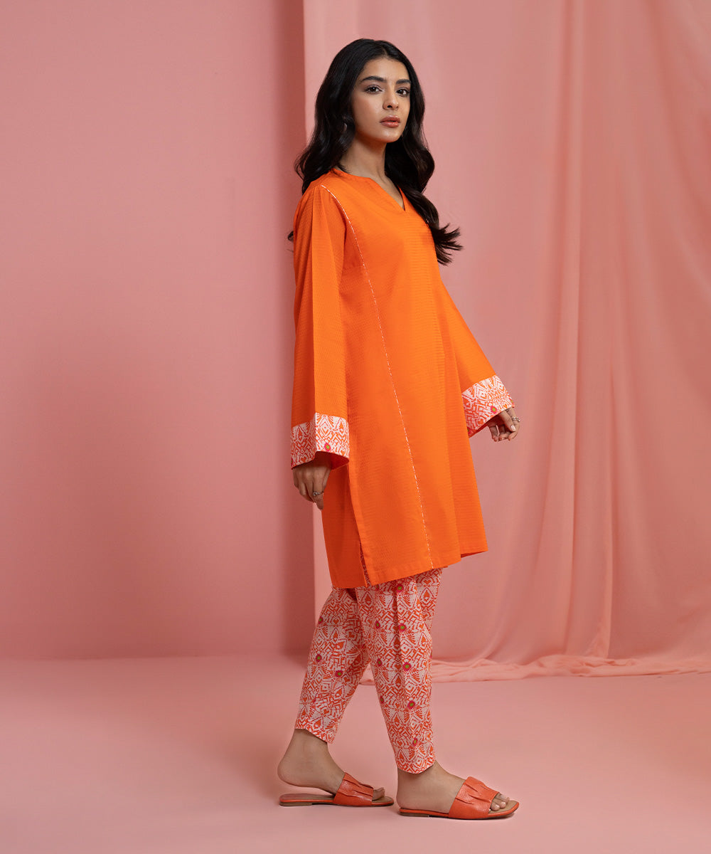 Look vibrant in this orange A-line silhouette paired with an intricately patterned off white shalwar.