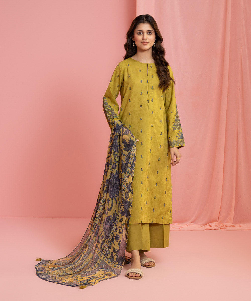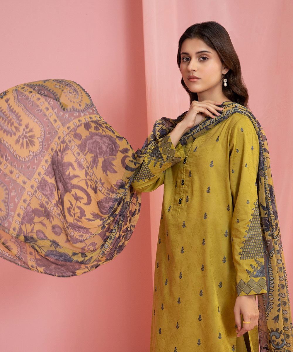 For a refreshing statement adorn olive A-line silhouette paired with a chiffon dupatta.