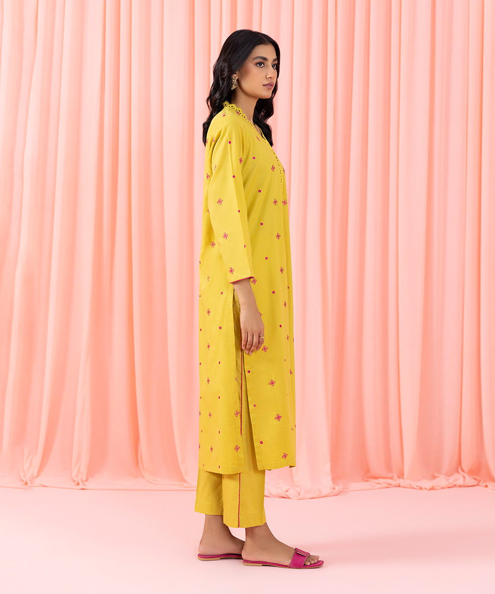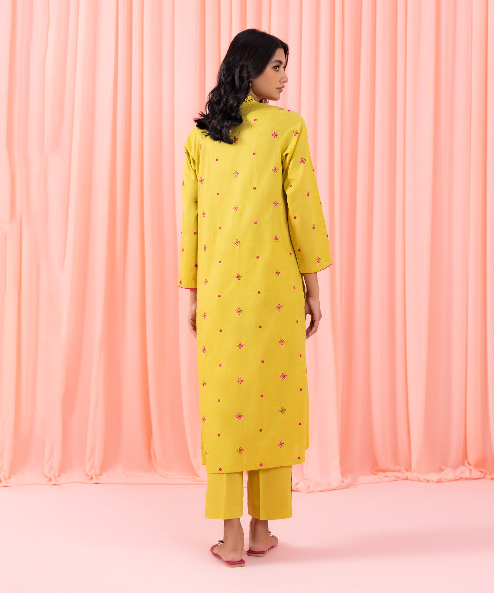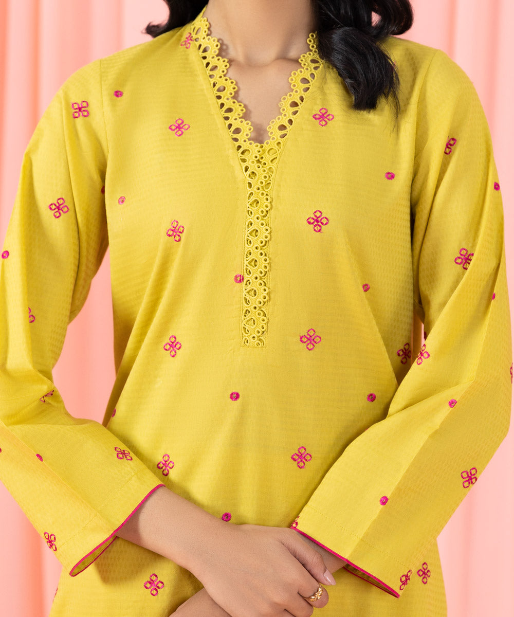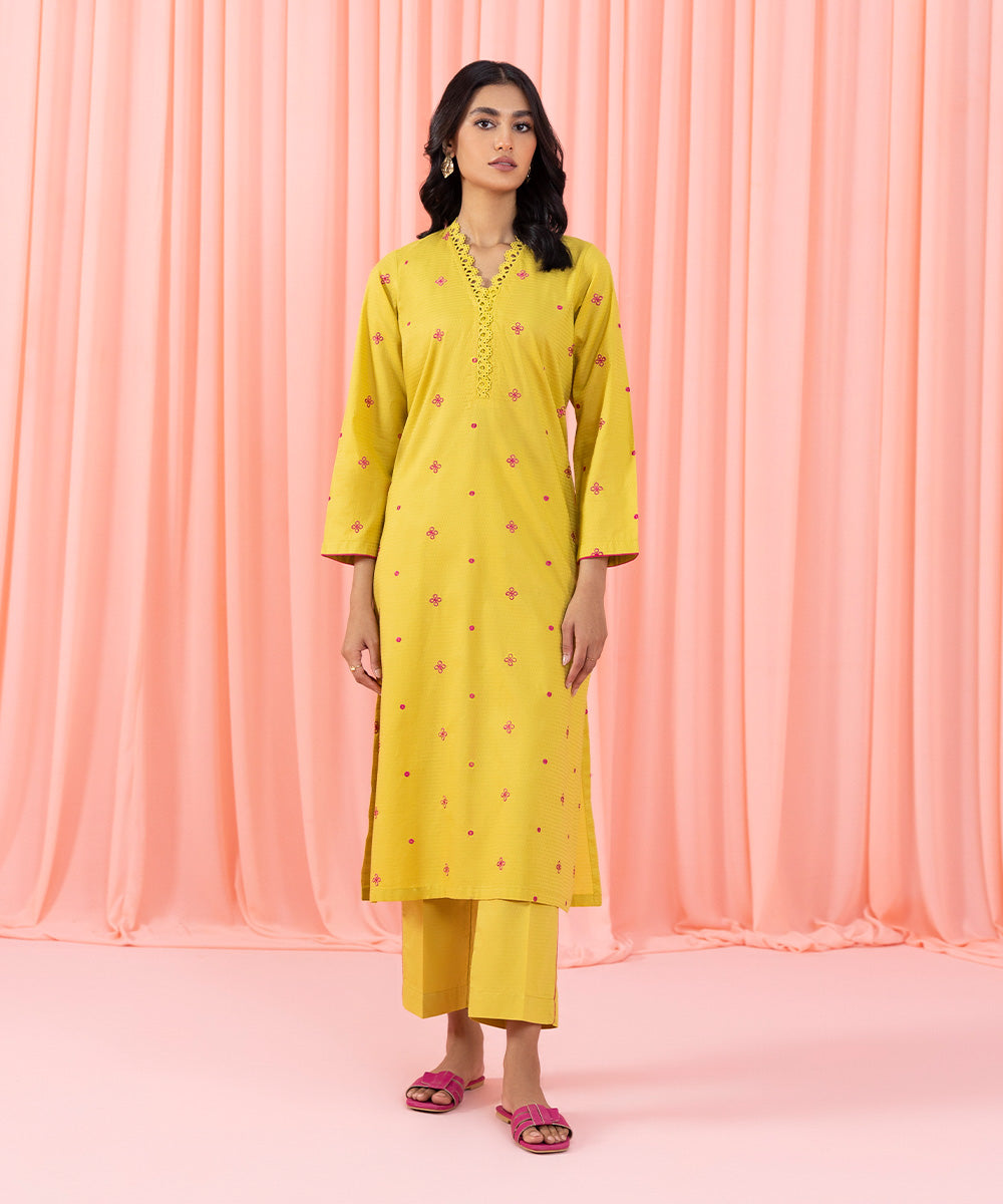 Refresh your wardrobe with this delicate lime yellow A-line featuring intricate embroidery patterns paired with straight pants.