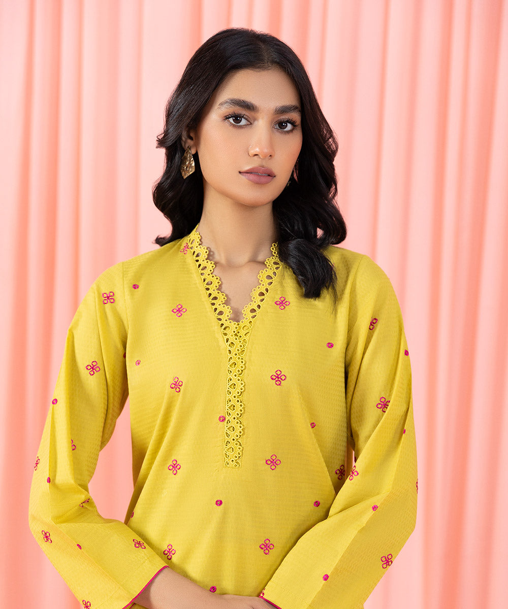 Plain Front With Embroidery, Plain Back, Full Embroidered Sleeves, Round Neckline With Slit