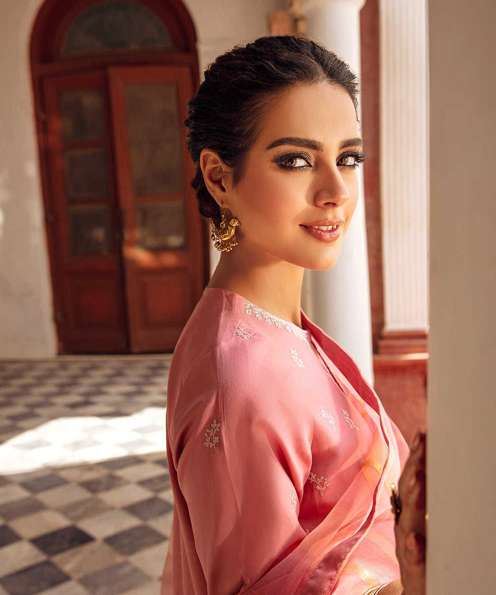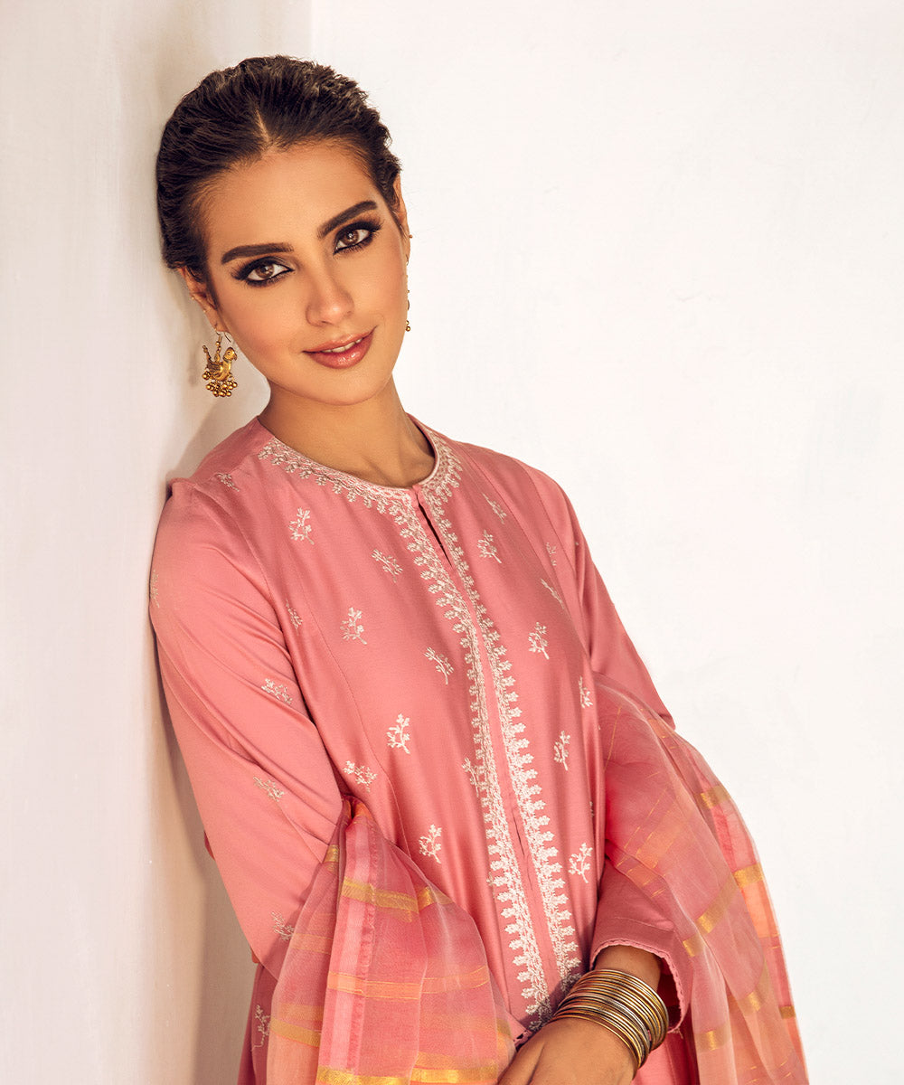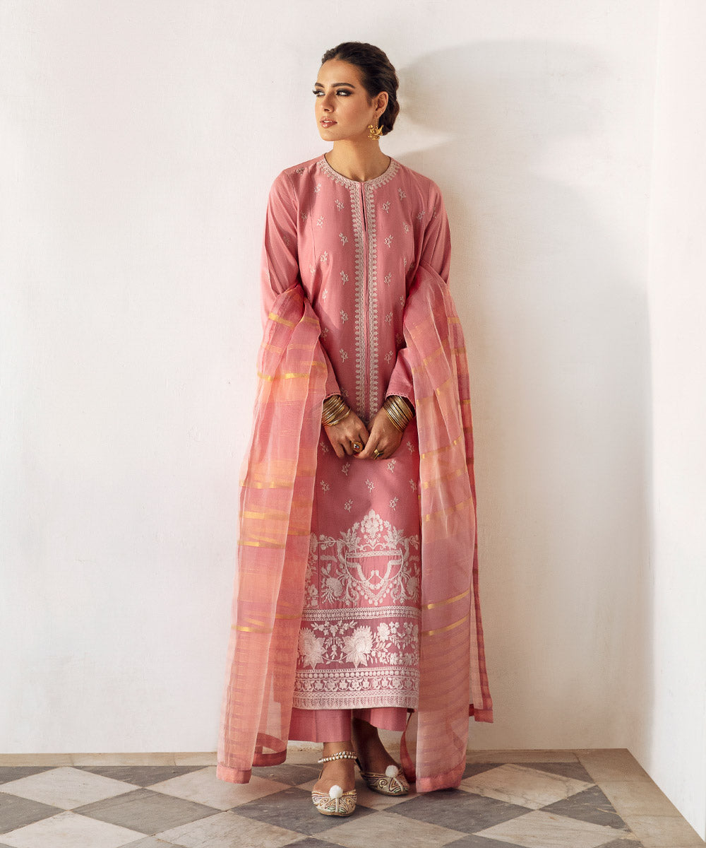 For a picturesque look this Eid, adorn intricate embroidered pink straight embroidered silhouette paired with organza dupatta.