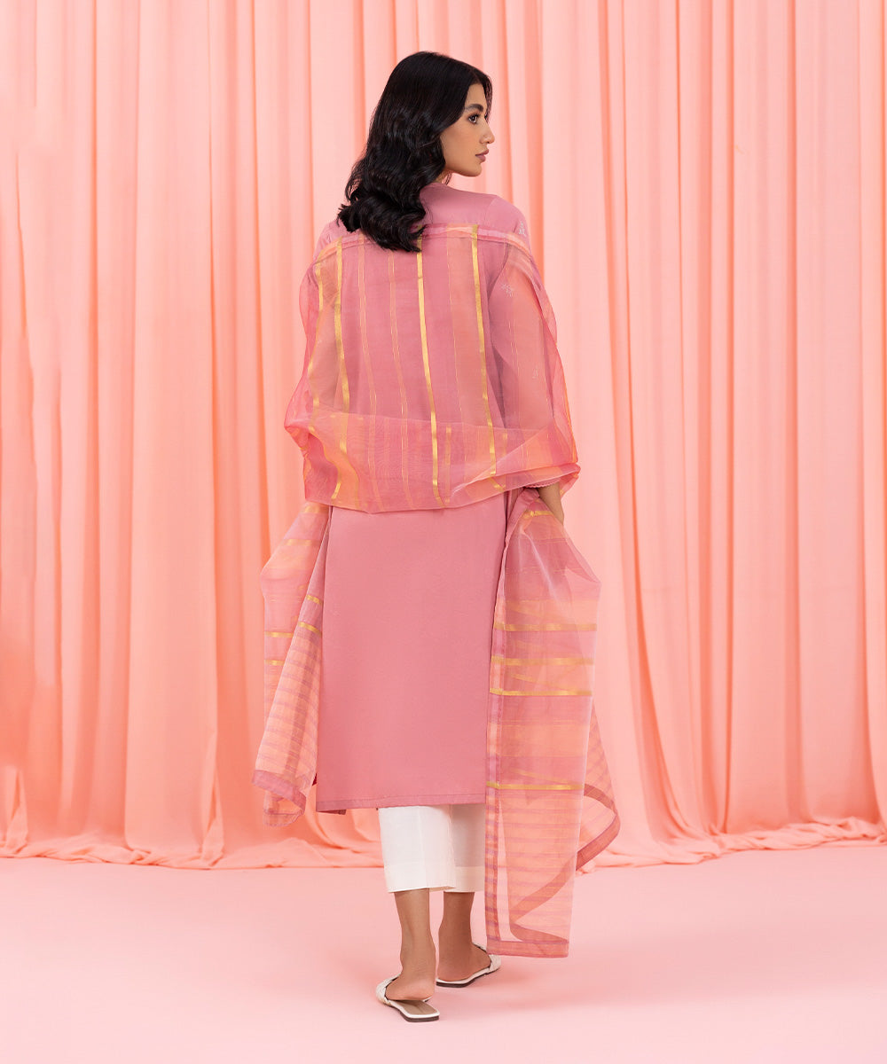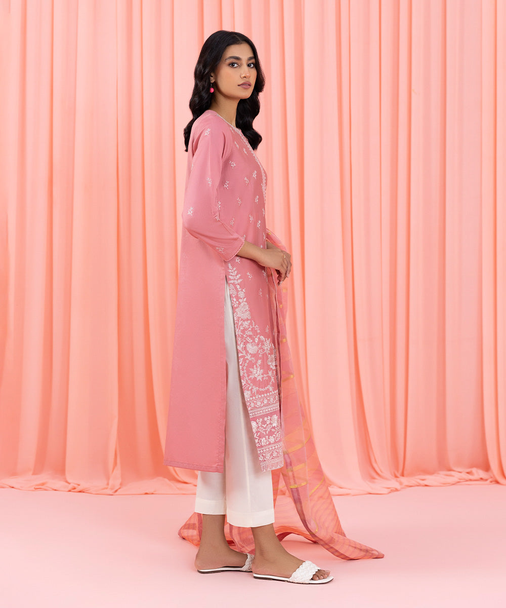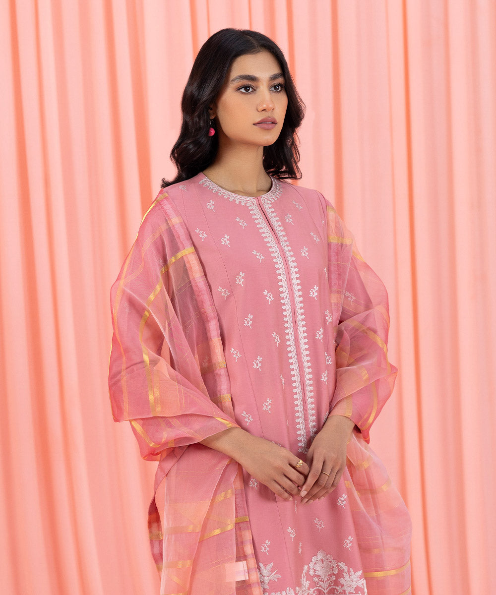 For a picturesque look this Eid, adorn intricate embroidered pink straight embroidered silhouette paired with organza dupatta.