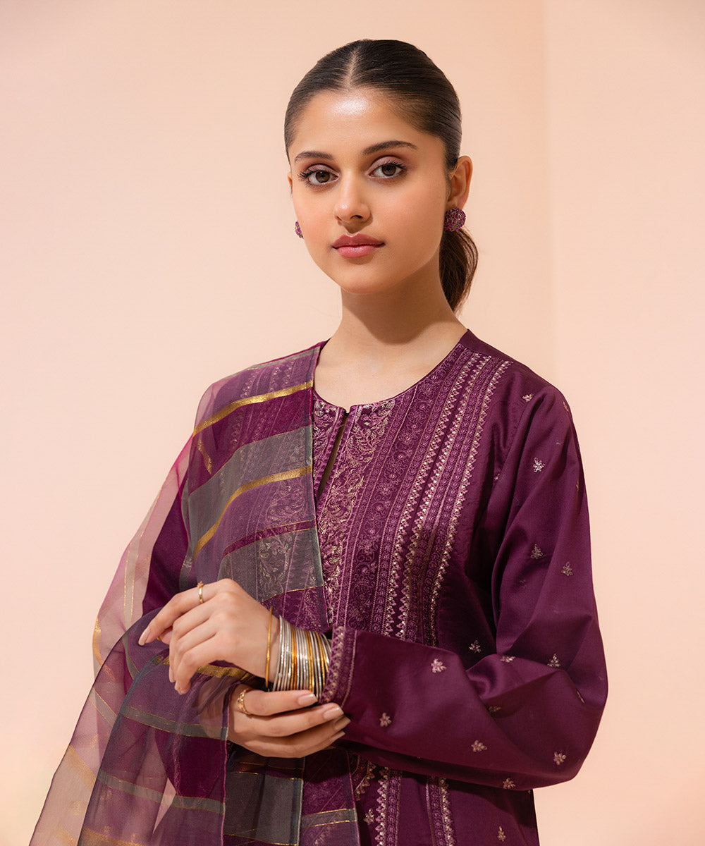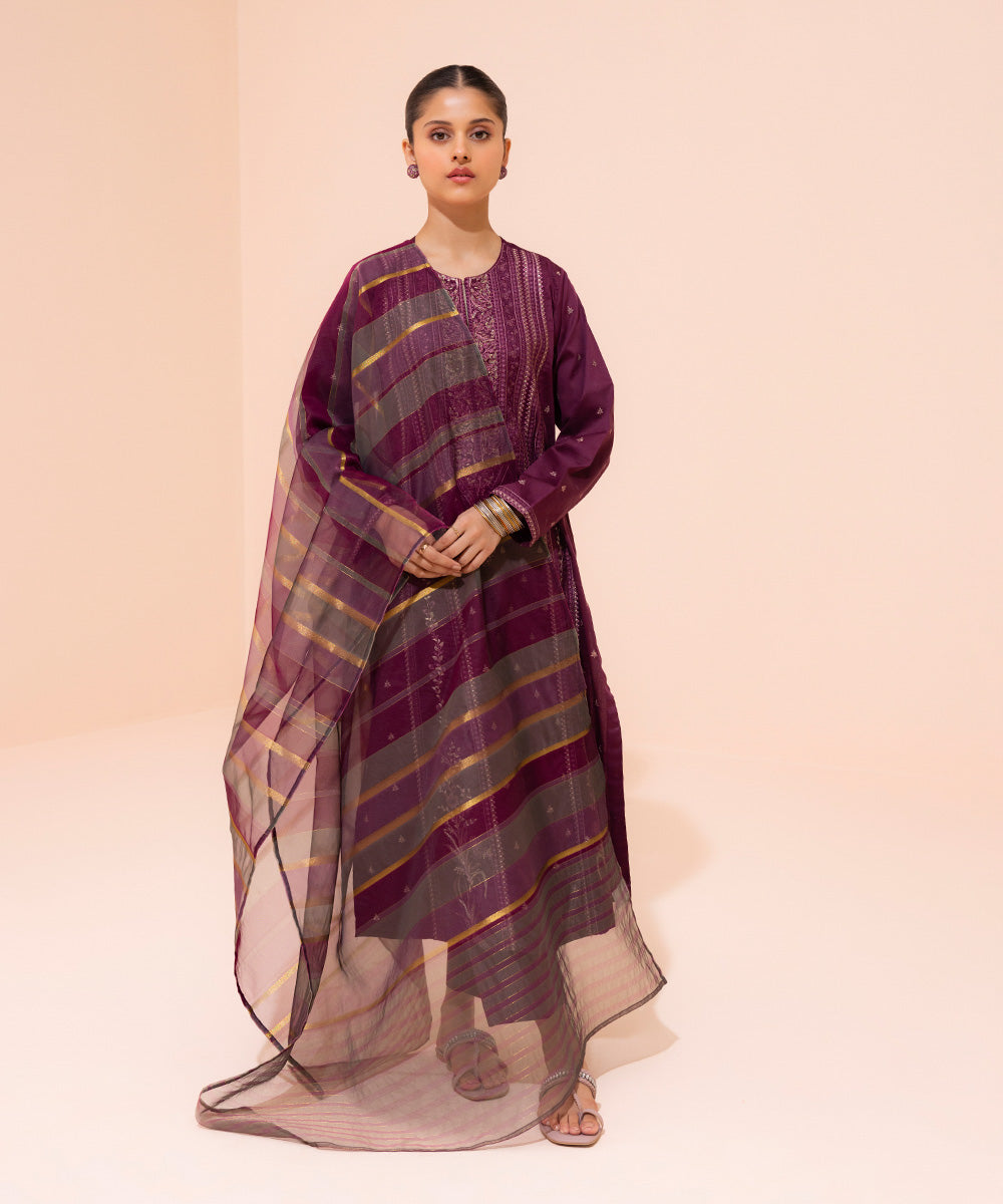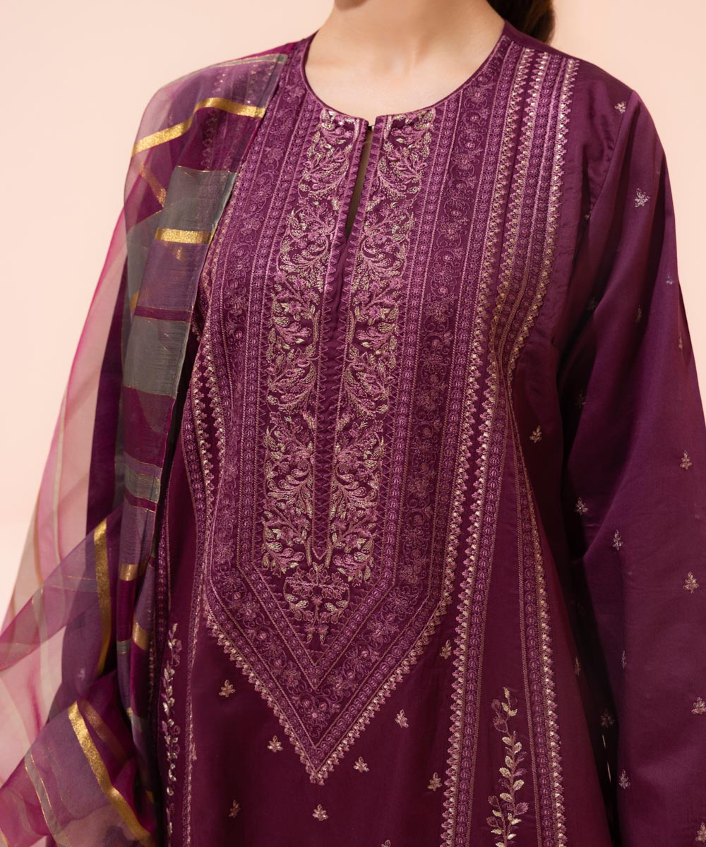 Transform your Eid celebrations into unforgettable moments of elegance with our extraordinary assortment of ethnic printed A-line silhouette in purple. Indulge in the rich tapestry of embroidered motifs, as we present to you a harmonious blend of cotton satin shirt paired with a multicoloured organza dupatta. This ensemble exudes an enduring charm, destined to elevate your festive wardrobe.