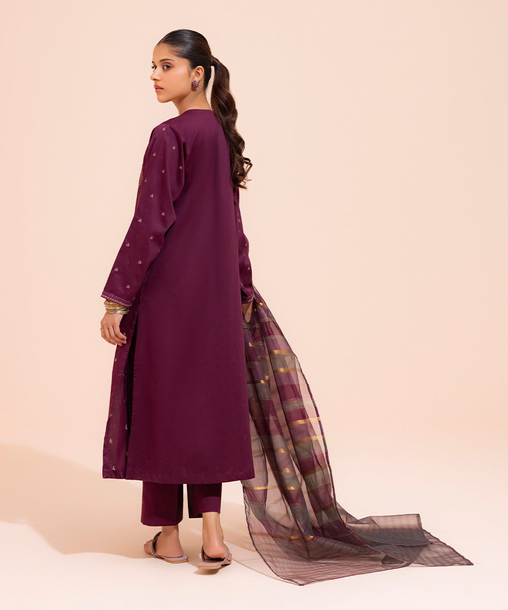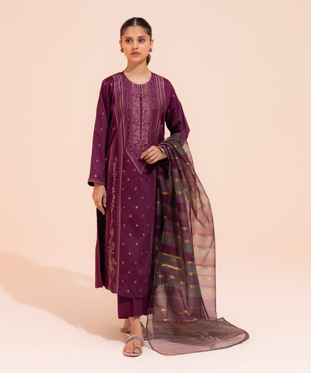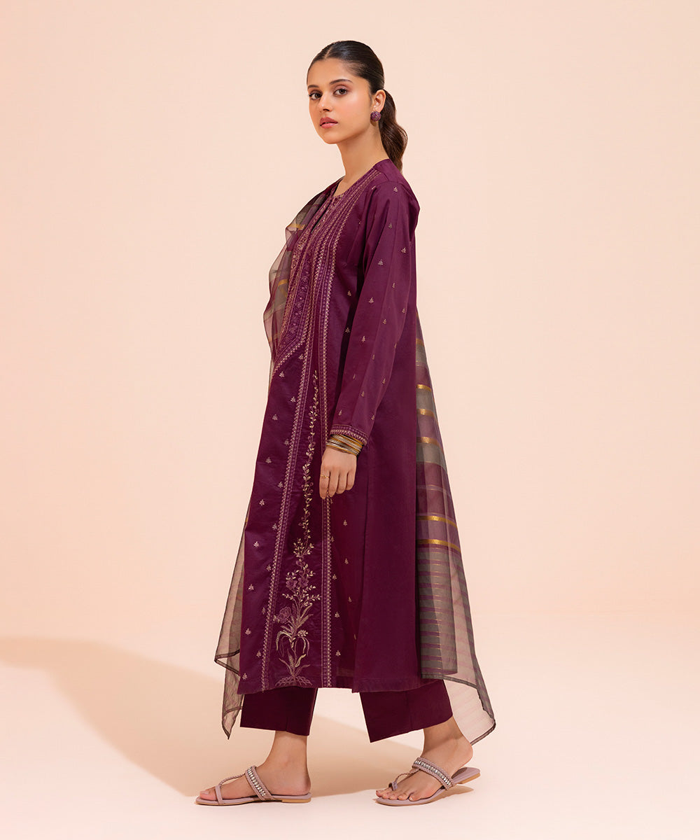 Transform your Eid celebrations into unforgettable moments of elegance with our extraordinary assortment of ethnic printed A-line silhouette in purple. Indulge in the rich tapestry of embroidered motifs, as we present to you a harmonious blend of cotton satin shirt paired with a multicoloured organza dupatta. This ensemble exudes an enduring charm, destined to elevate your festive wardrobe.