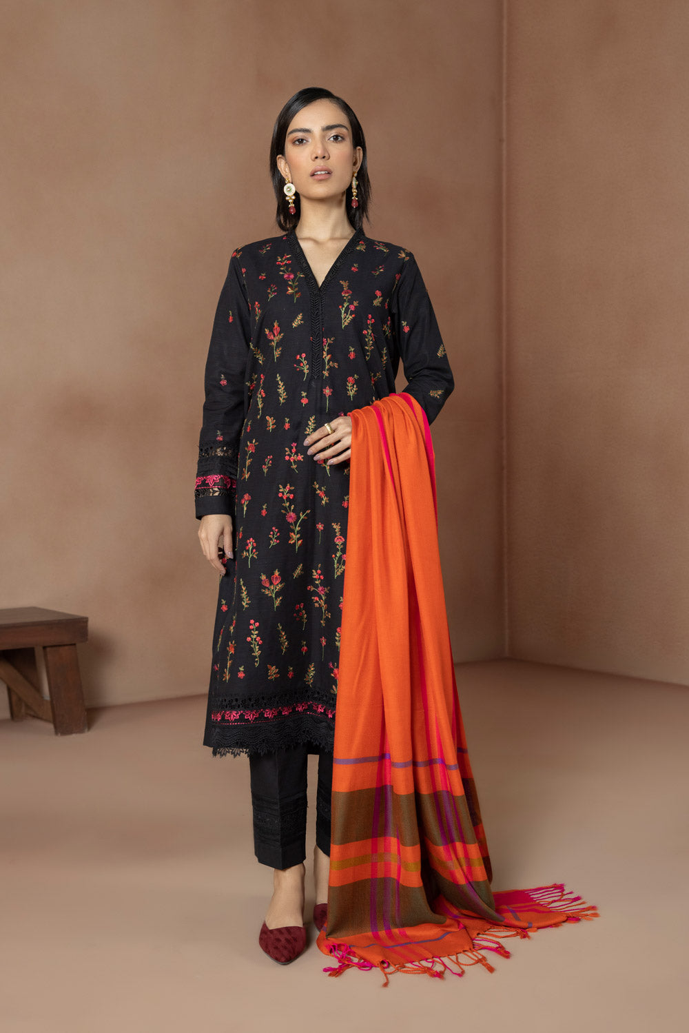 Look regal with this black-hued embroidered khaddar two-piece suit.
