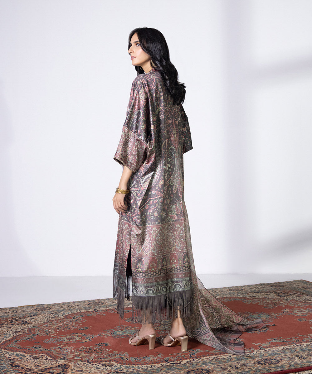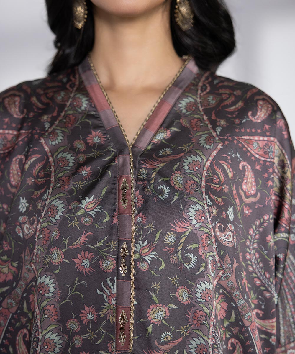 Immerse yourself in delicate illustrations in a brown satin ensemble featuring one piece shirt