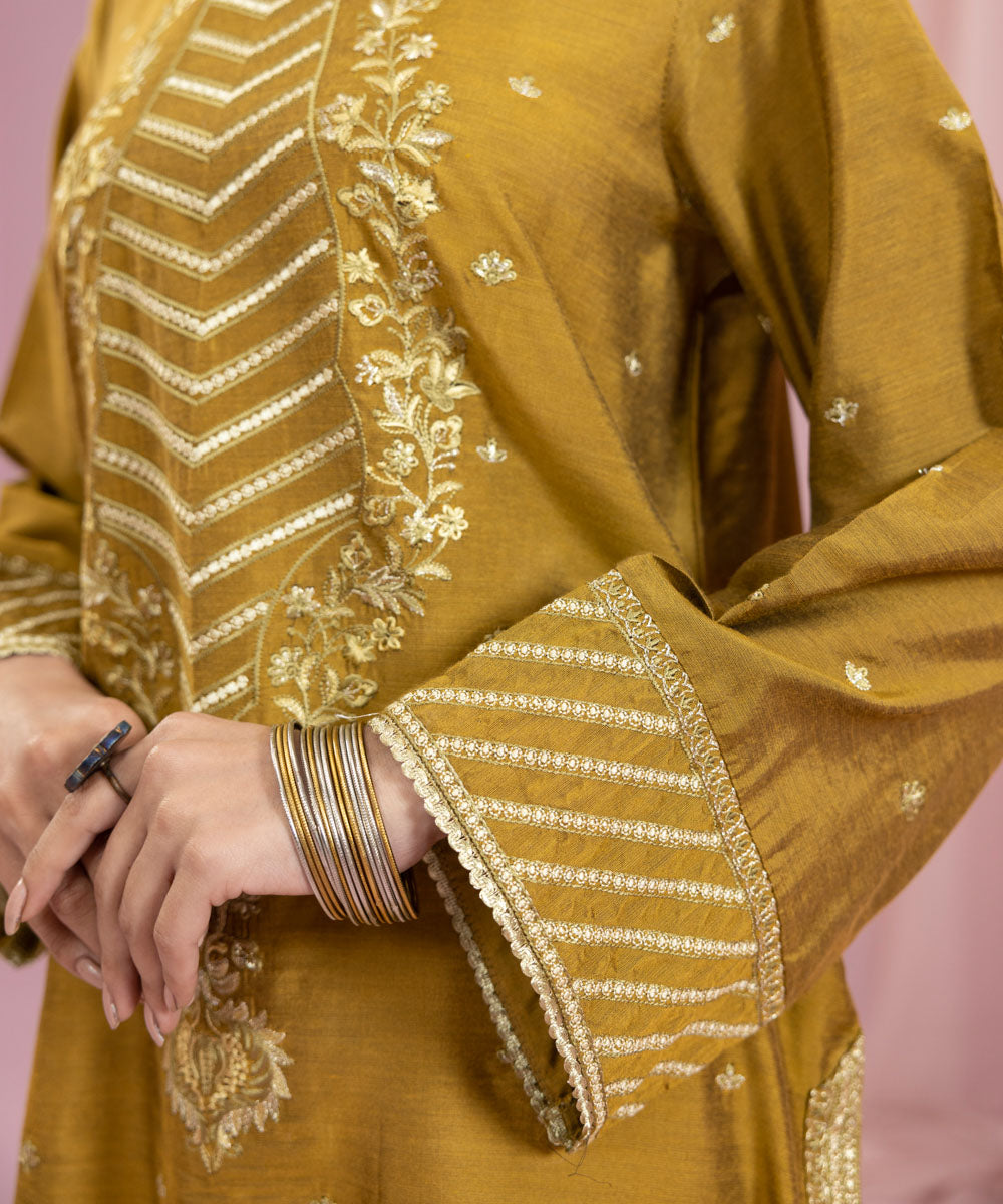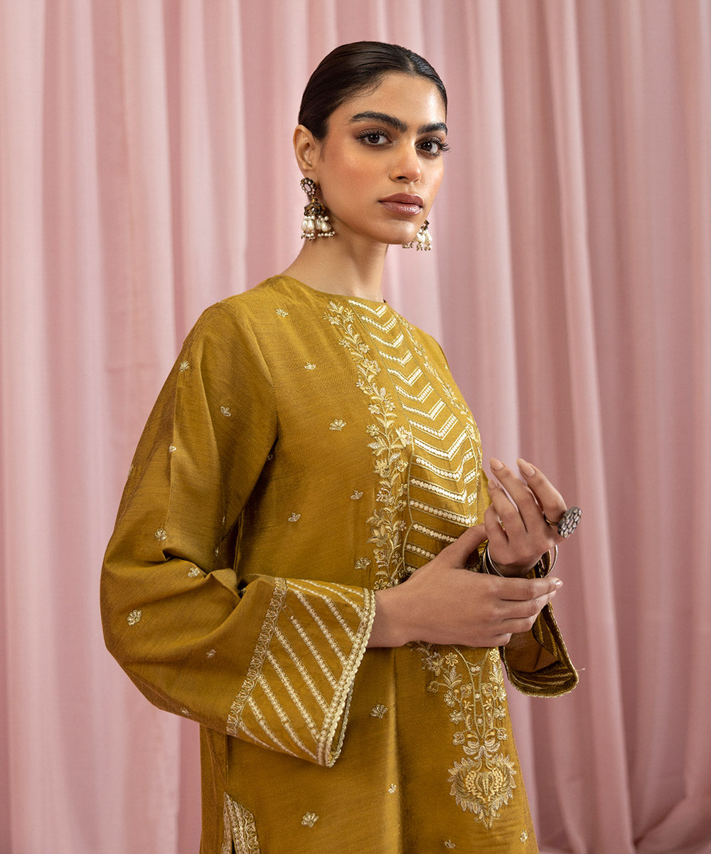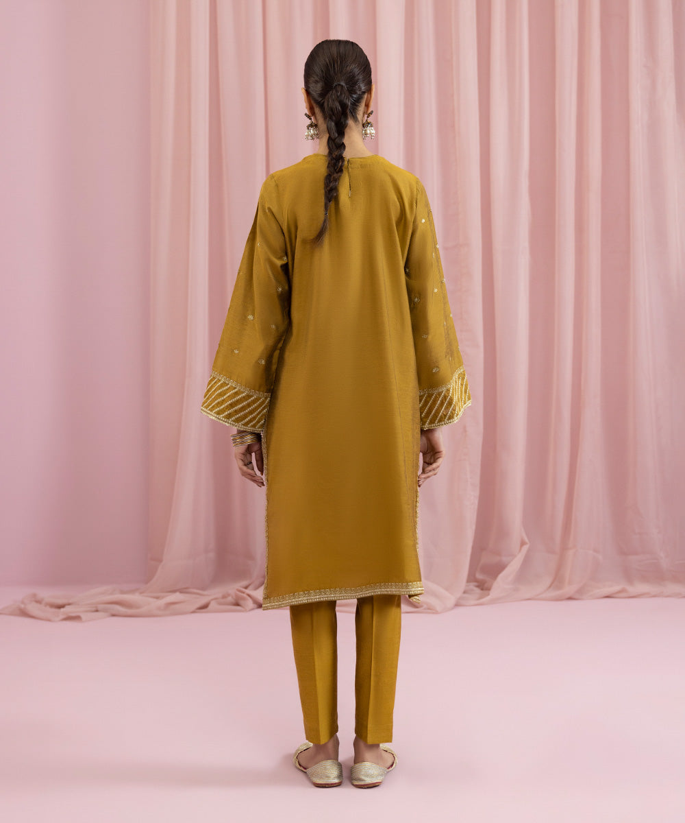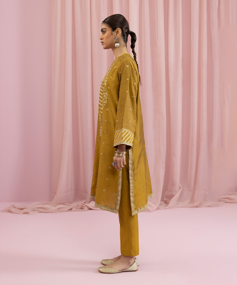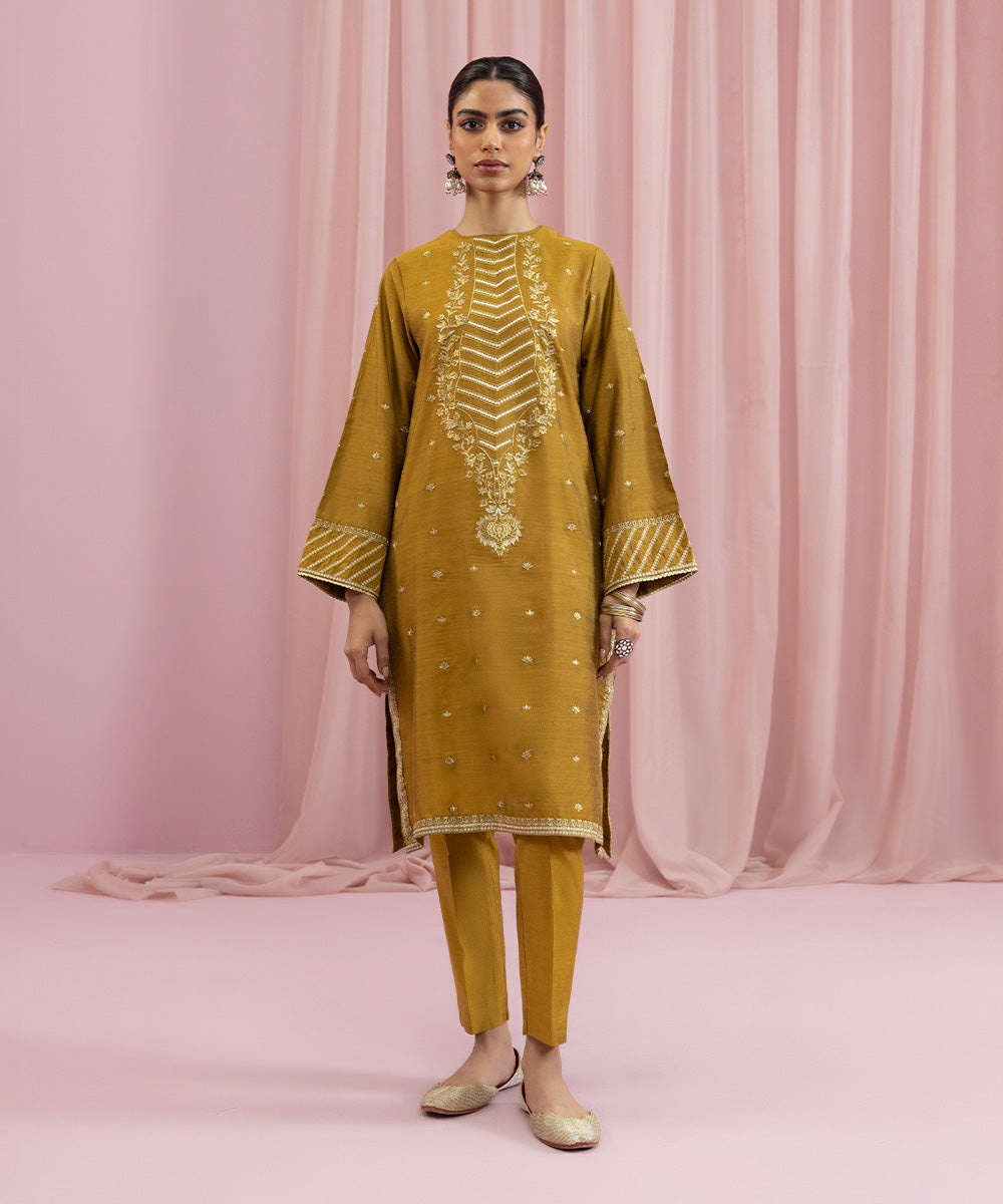 Make a fashionable statement in yellow straight silhouette featuring intricate embroidery and cigarette pants.