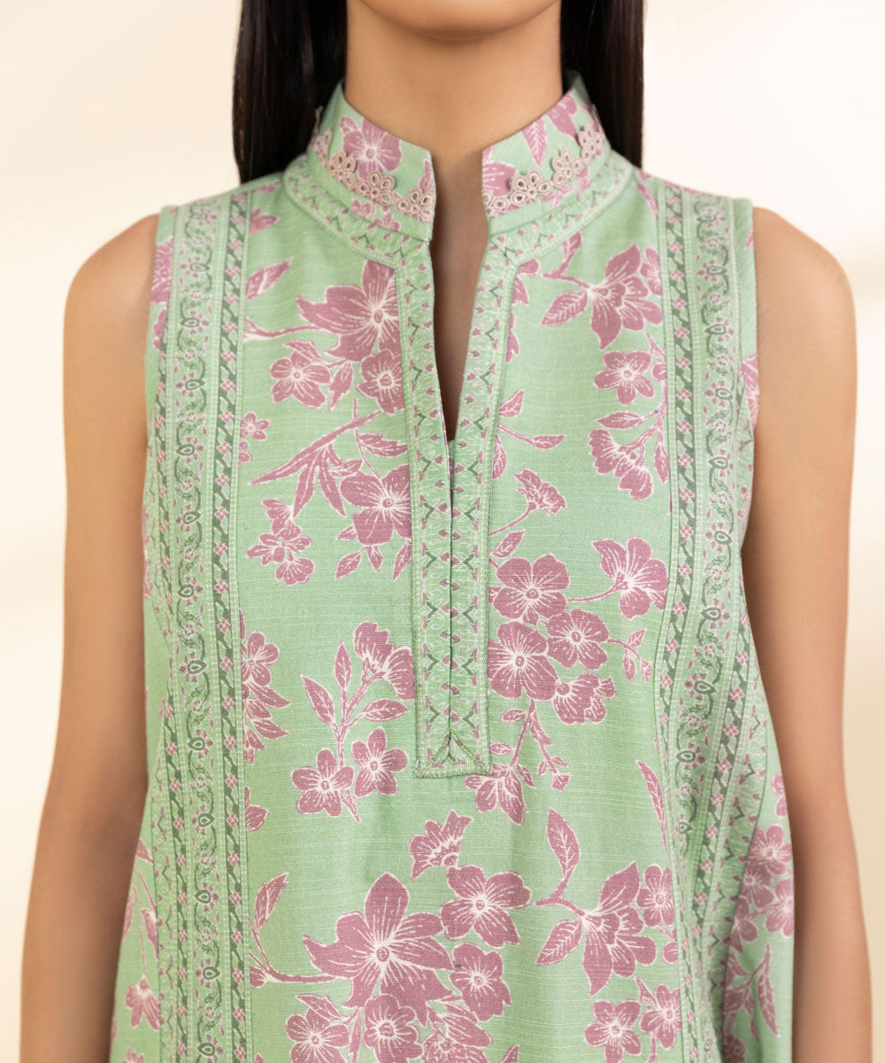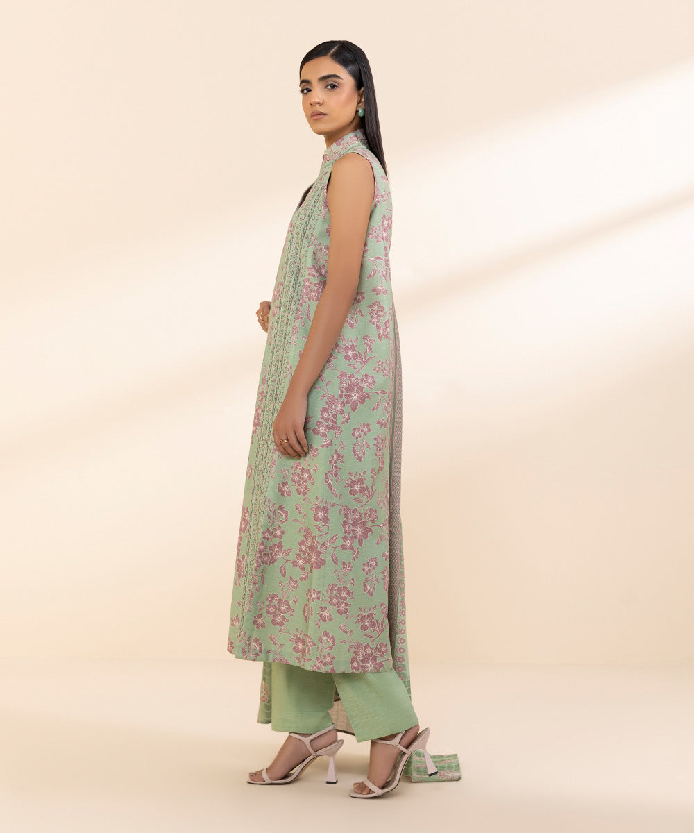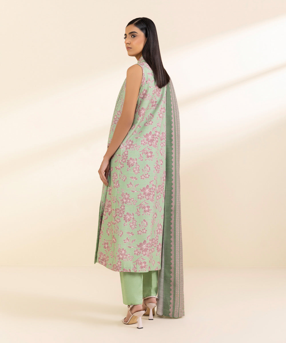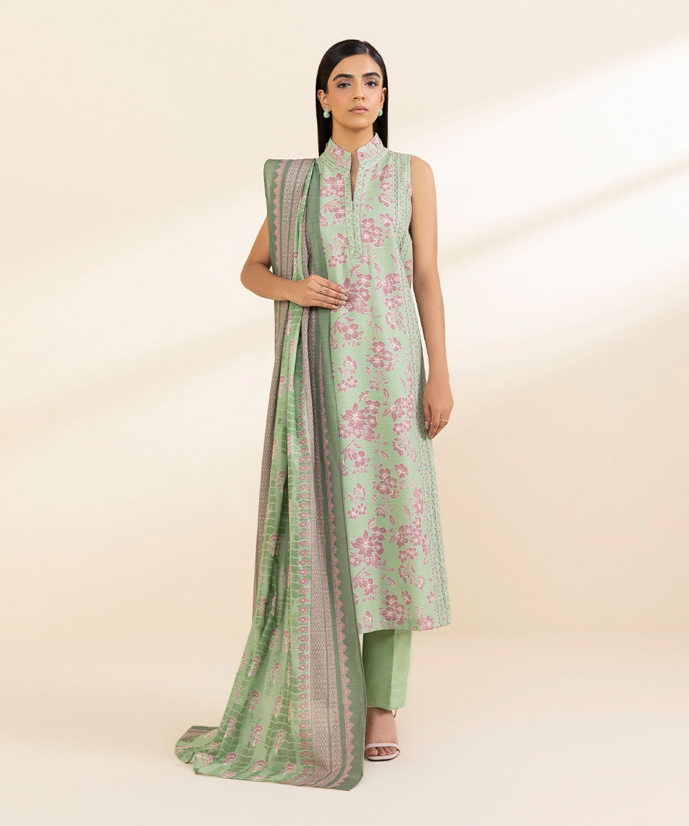 Experience classic floral prints in our mint green three-piece featuring light khaddar shirt, trousers and dupatta.