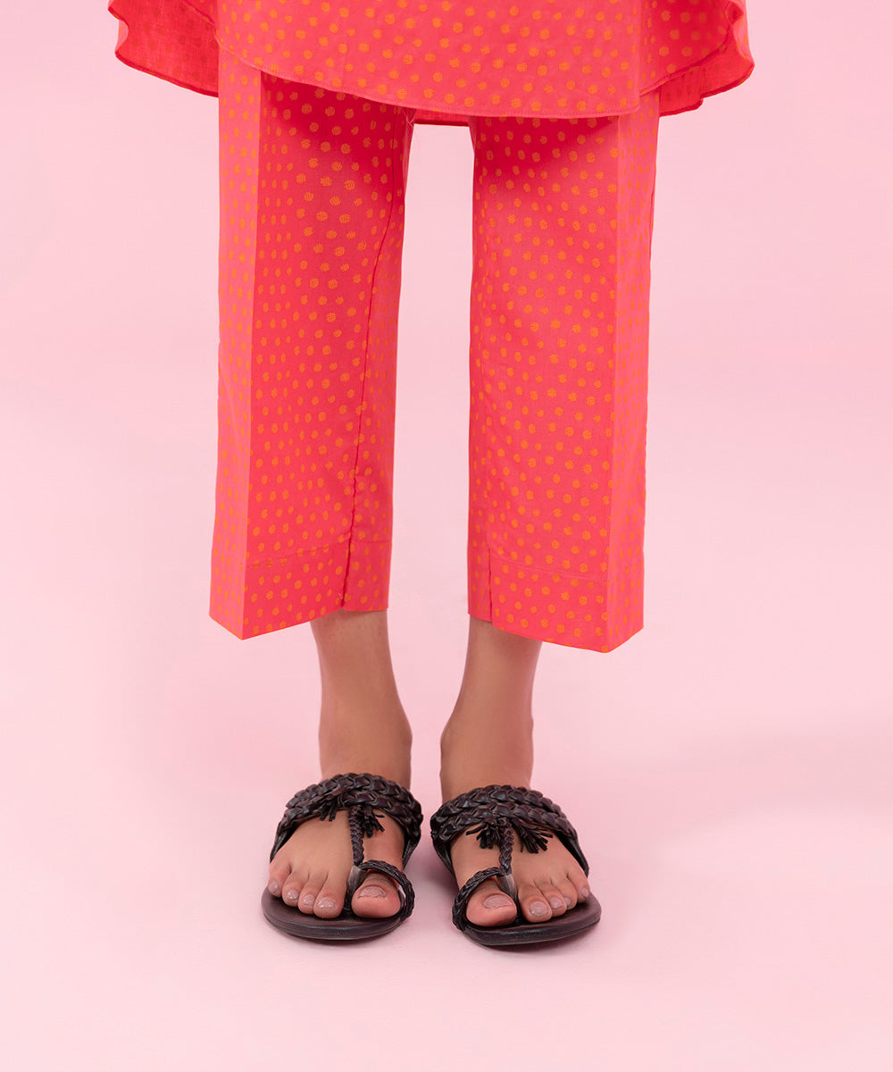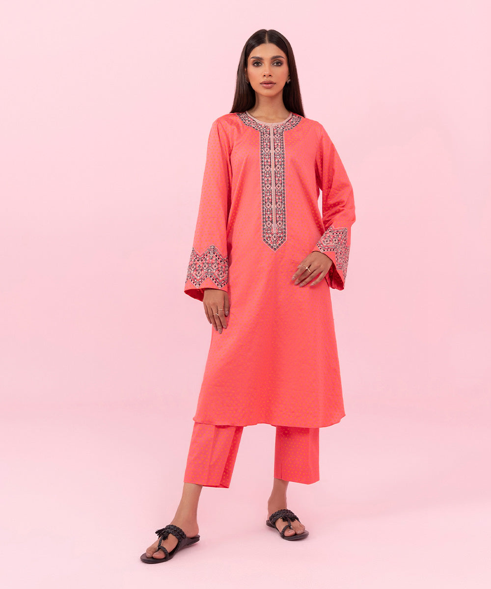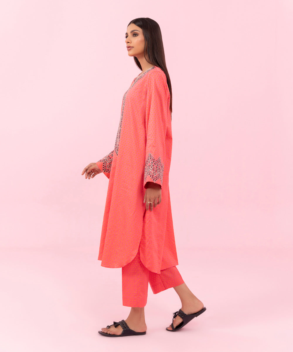 Guided by the essence of Kashmiri influence, our pink A-line printed ensemble has come to life through meticulous embroidery and is paired with straight pants tailored specifically to elevate your festive occasions.