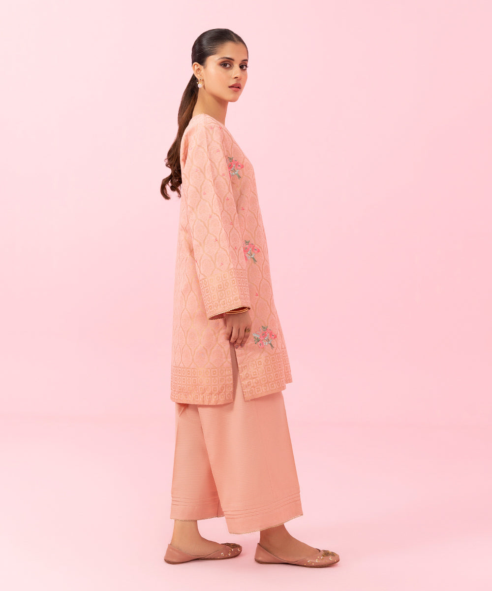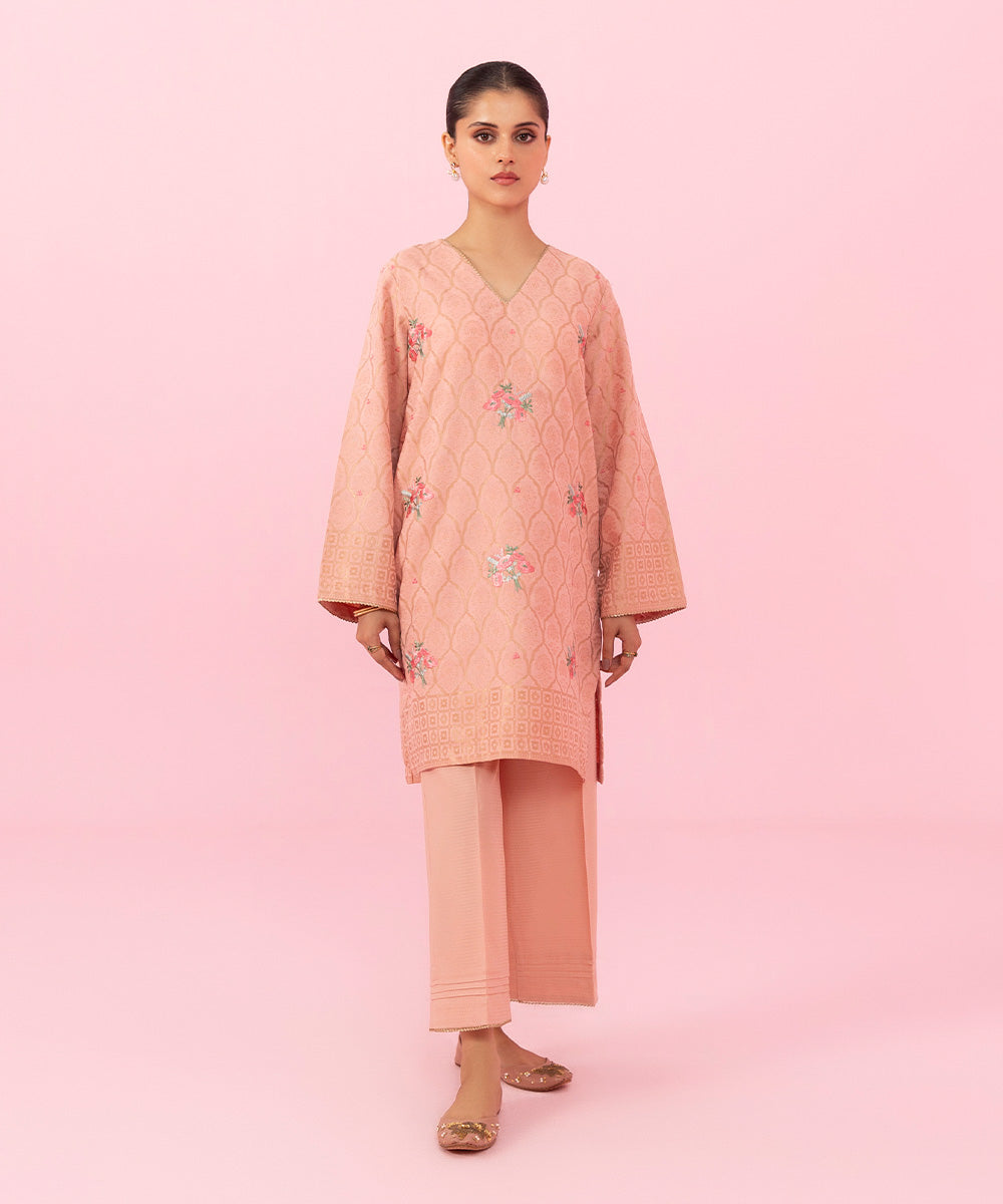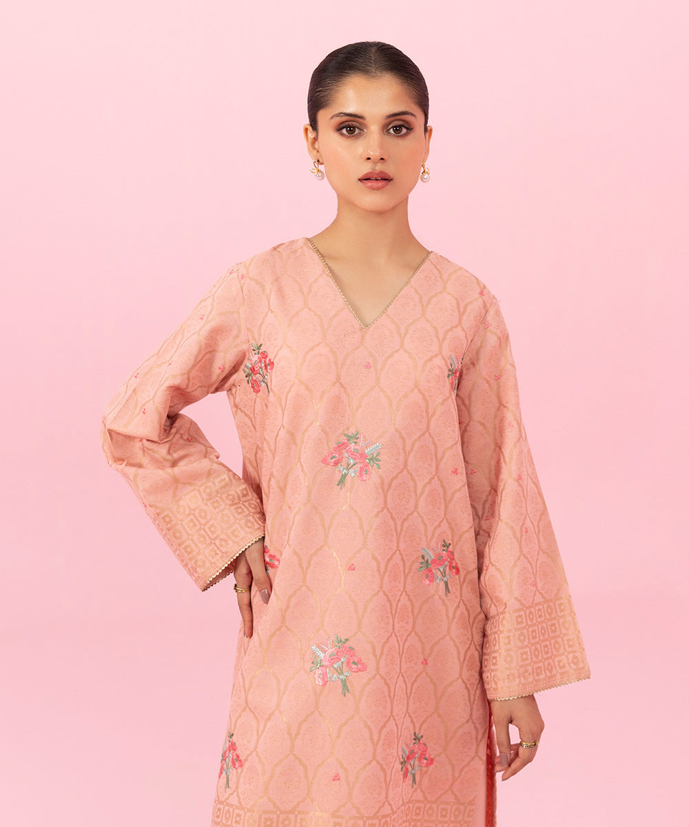 Exude grace in our pink jacquard straight ensemble accented with intricate embroidery patterns paired with pleated culottes.