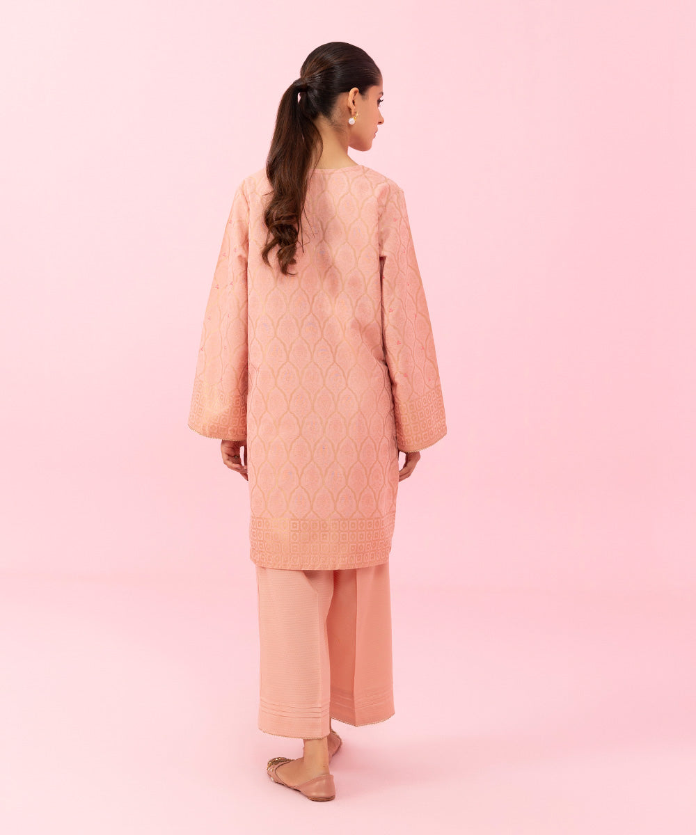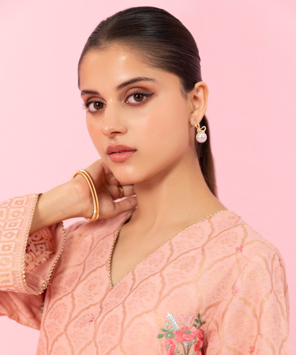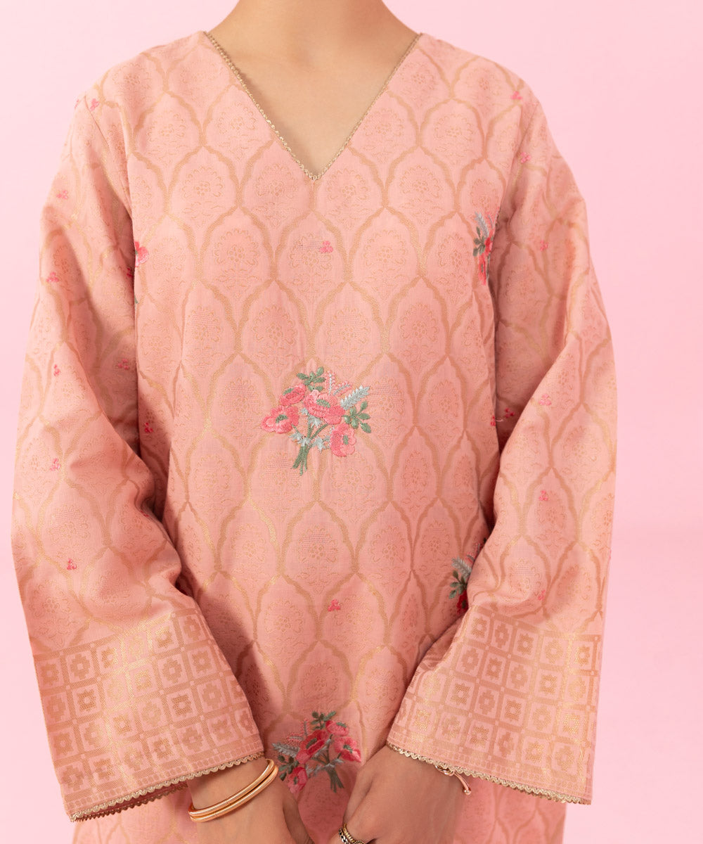 Exude grace in our pink jacquard straight ensemble accented with intricate embroidery patterns paired with pleated culottes.
