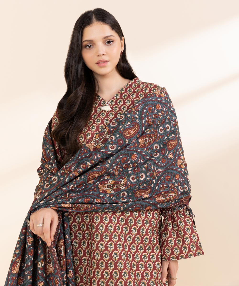 Embrace subtle elegance this season in our printed two-piece featuring a light khaddar maroon shirt and multi coloured dupatta.