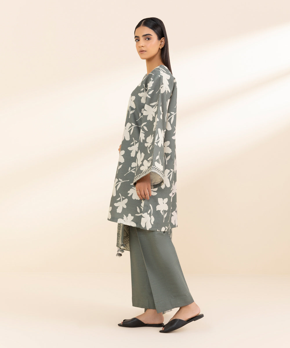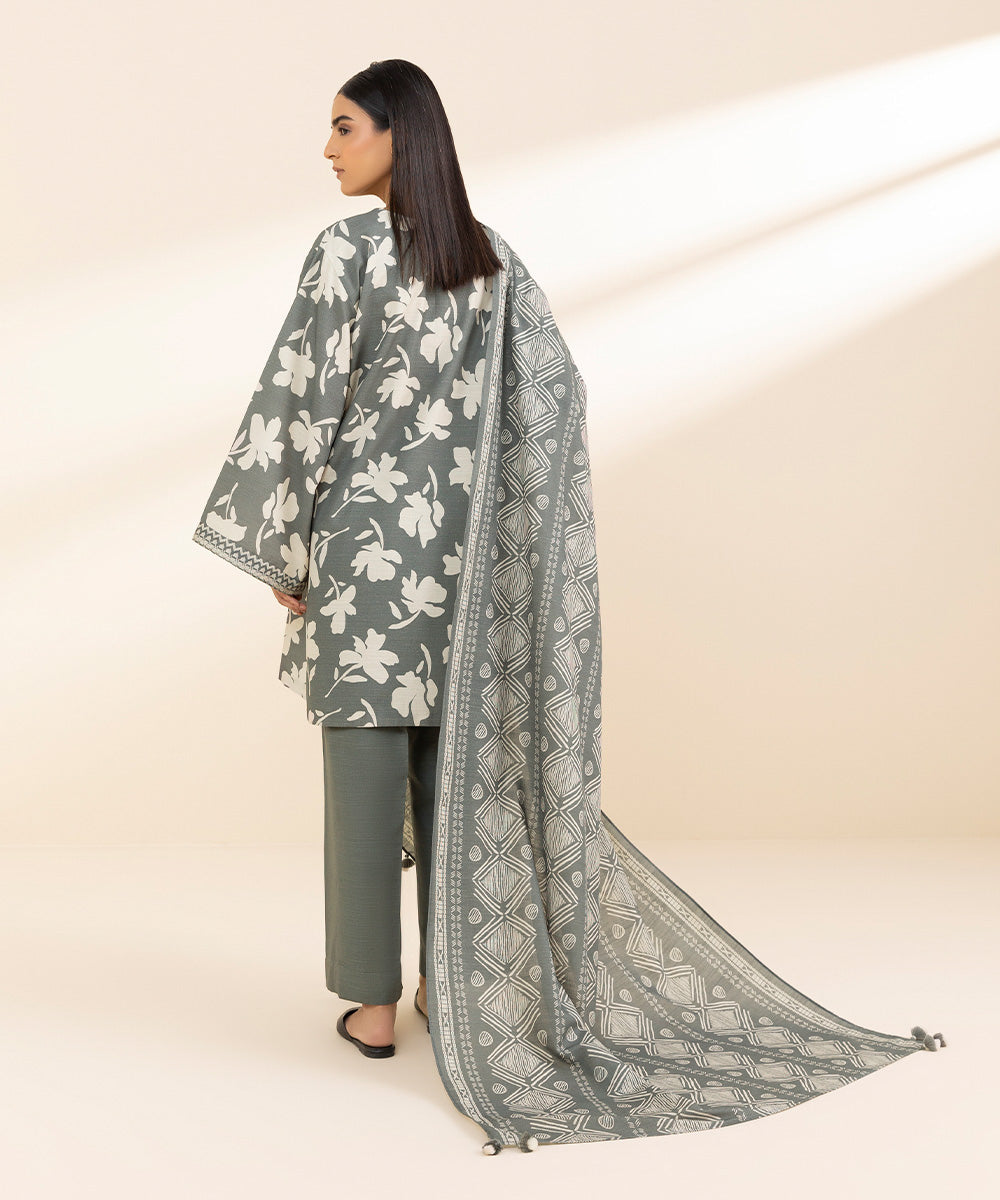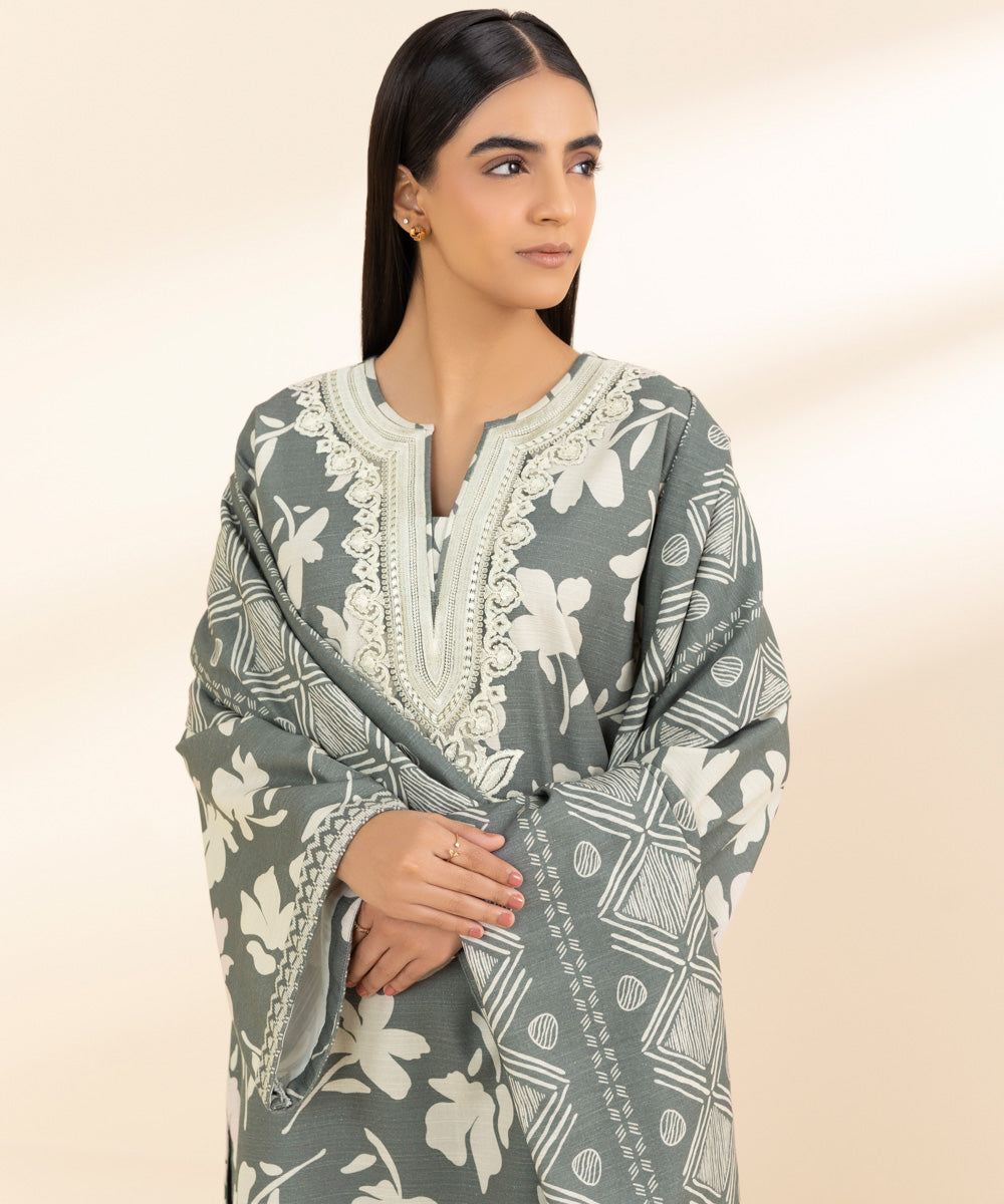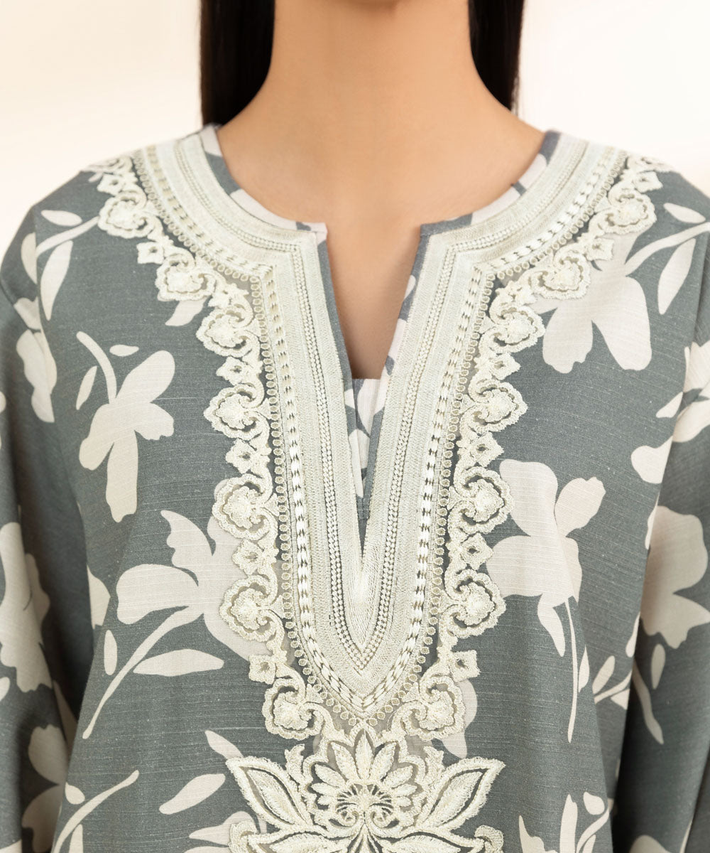 Make a monochromatic statement with our embroidered grey khaddar two-piece shirt and dupatta.