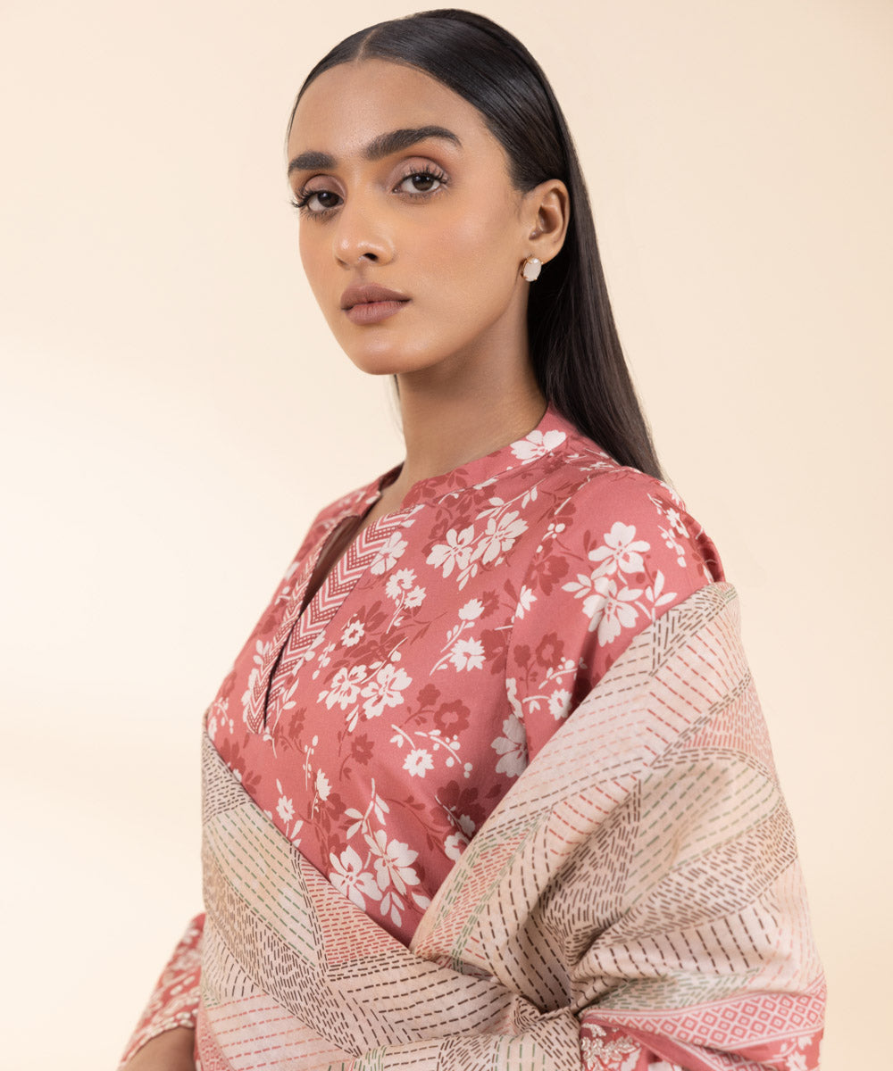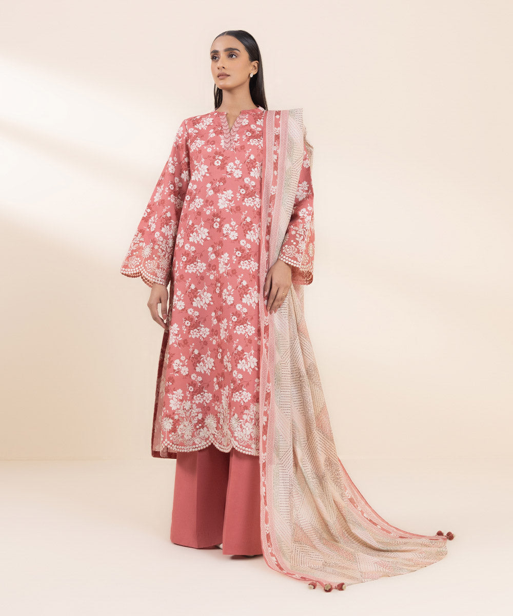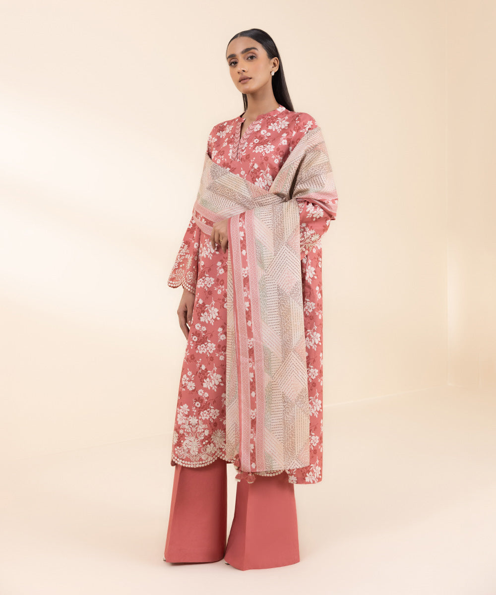 Make a statement this season with our two-piece embroidered ensemble in deep coral featuring a cambric shirt paired with a multicoloured voile dupatta.