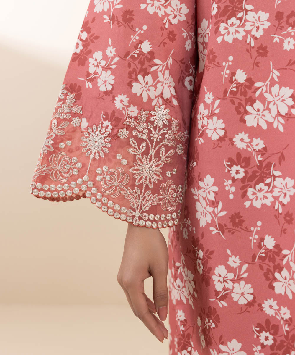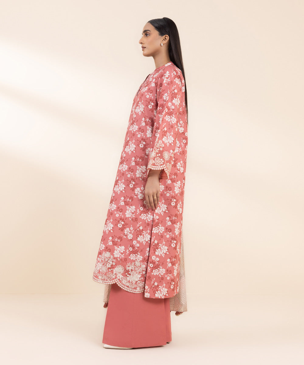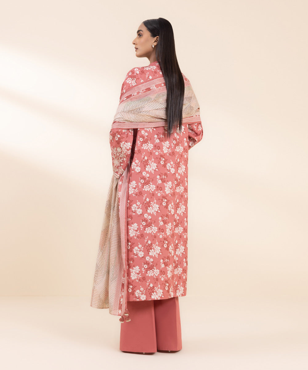 Make a statement this season with our two-piece embroidered ensemble in deep coral featuring a cambric shirt paired with a multicoloured voile dupatta.