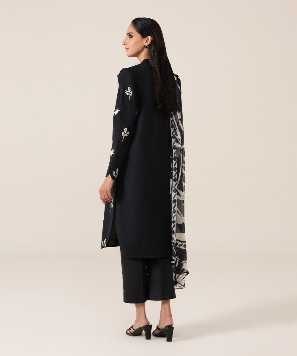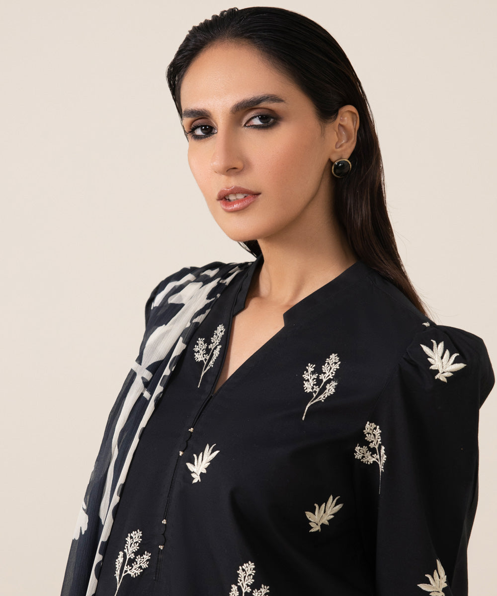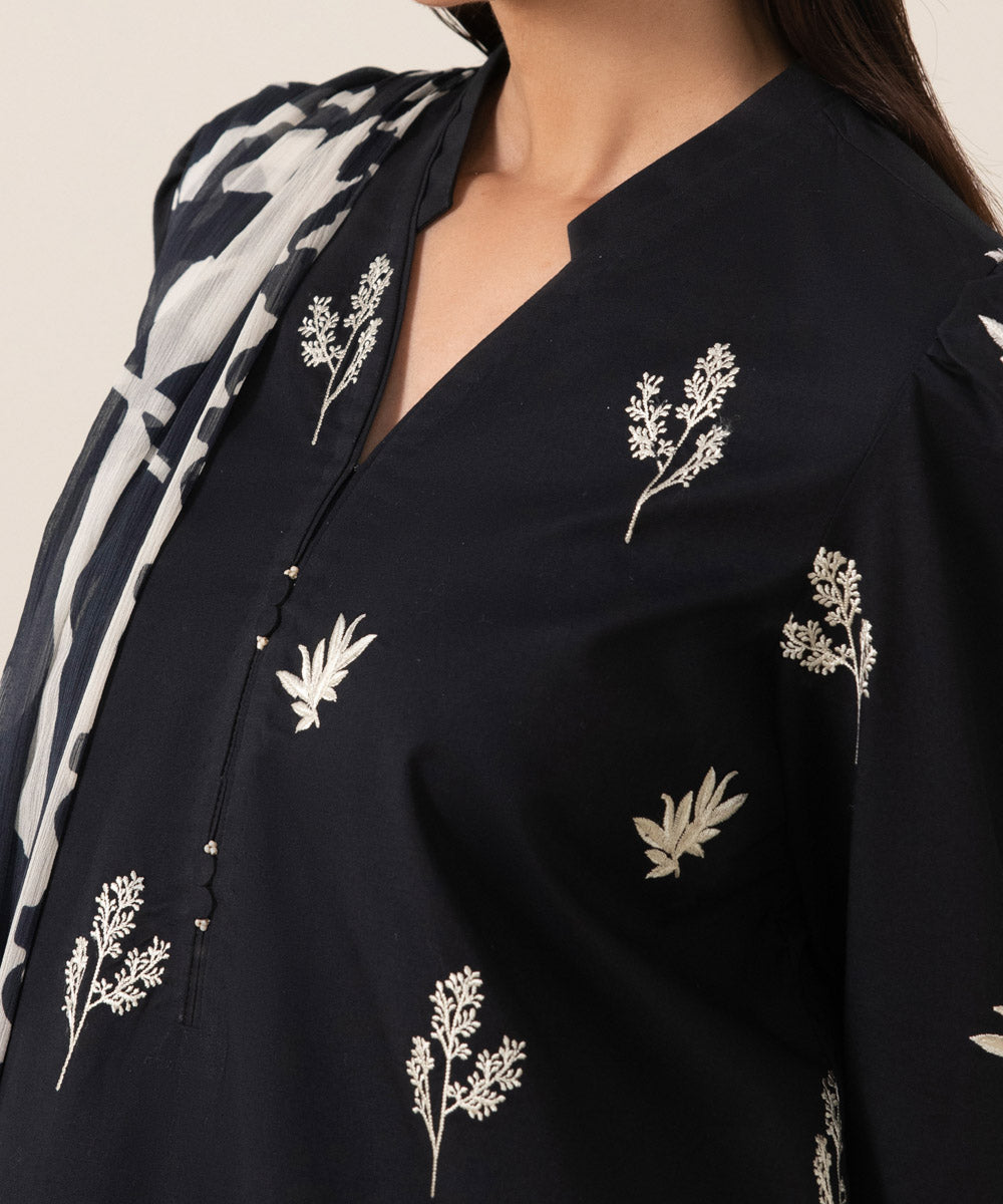 Immerse yourself in our two-piece suit- a mesmerizing medley of patterns, where striking floral and geometric motifs intertwine with the everlasting allure of timeless prints on a breezy lawn fabric paired with a chiffon dupatta.