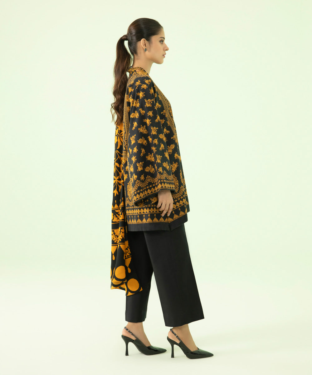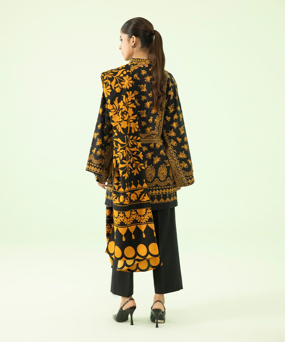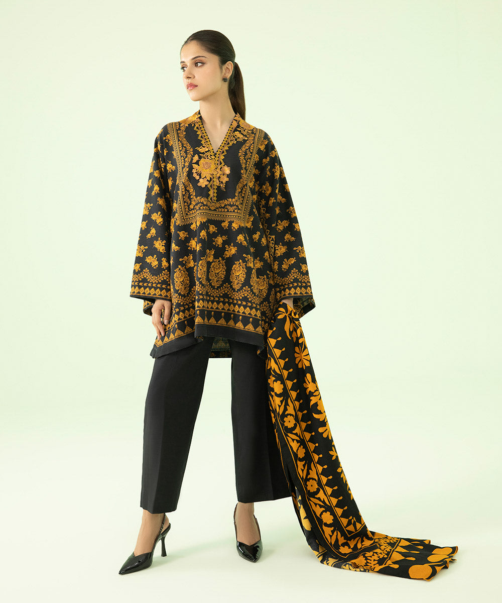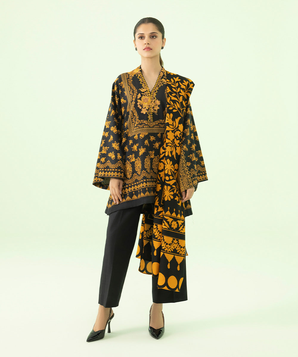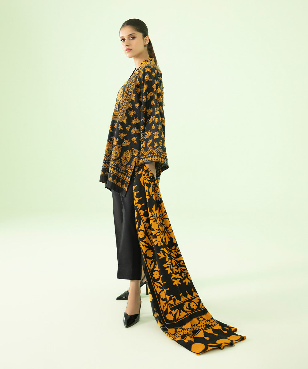 For a dynamic statement this season, opt for our black and mustard intricately detailed two-piece ensemble paired with a poly shawl.