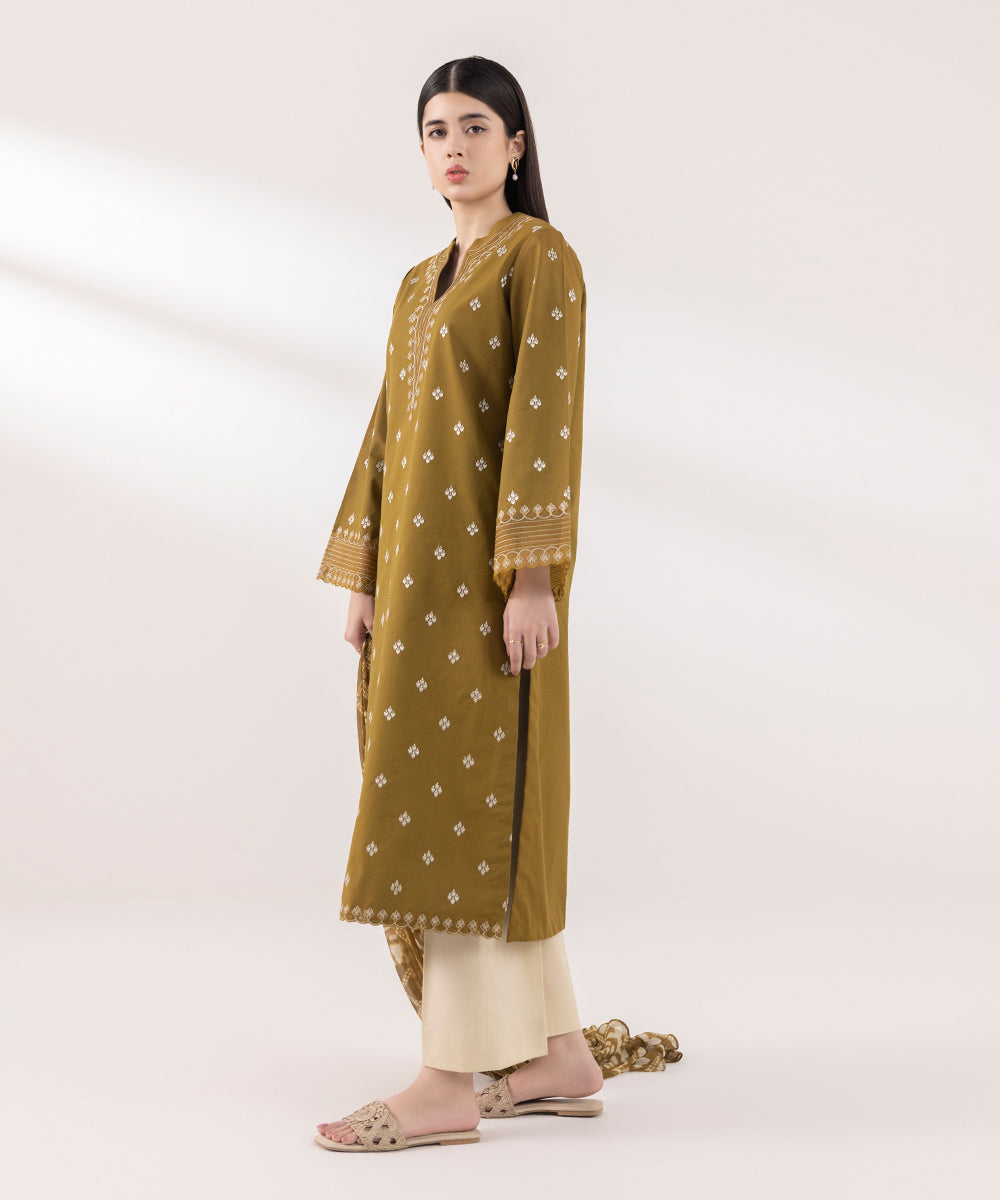 Opt for traditional designs with our two-piece featuring an embroidered cambric shirt and a printed blended chiffon dupatta in mustard.