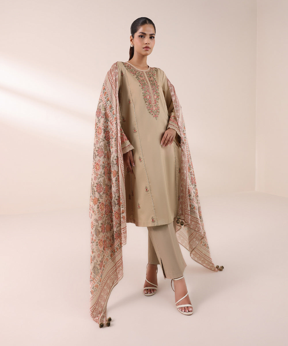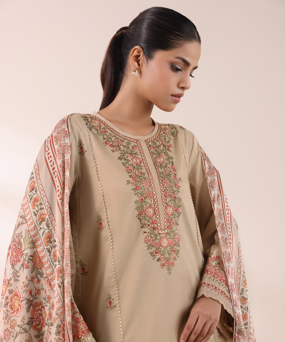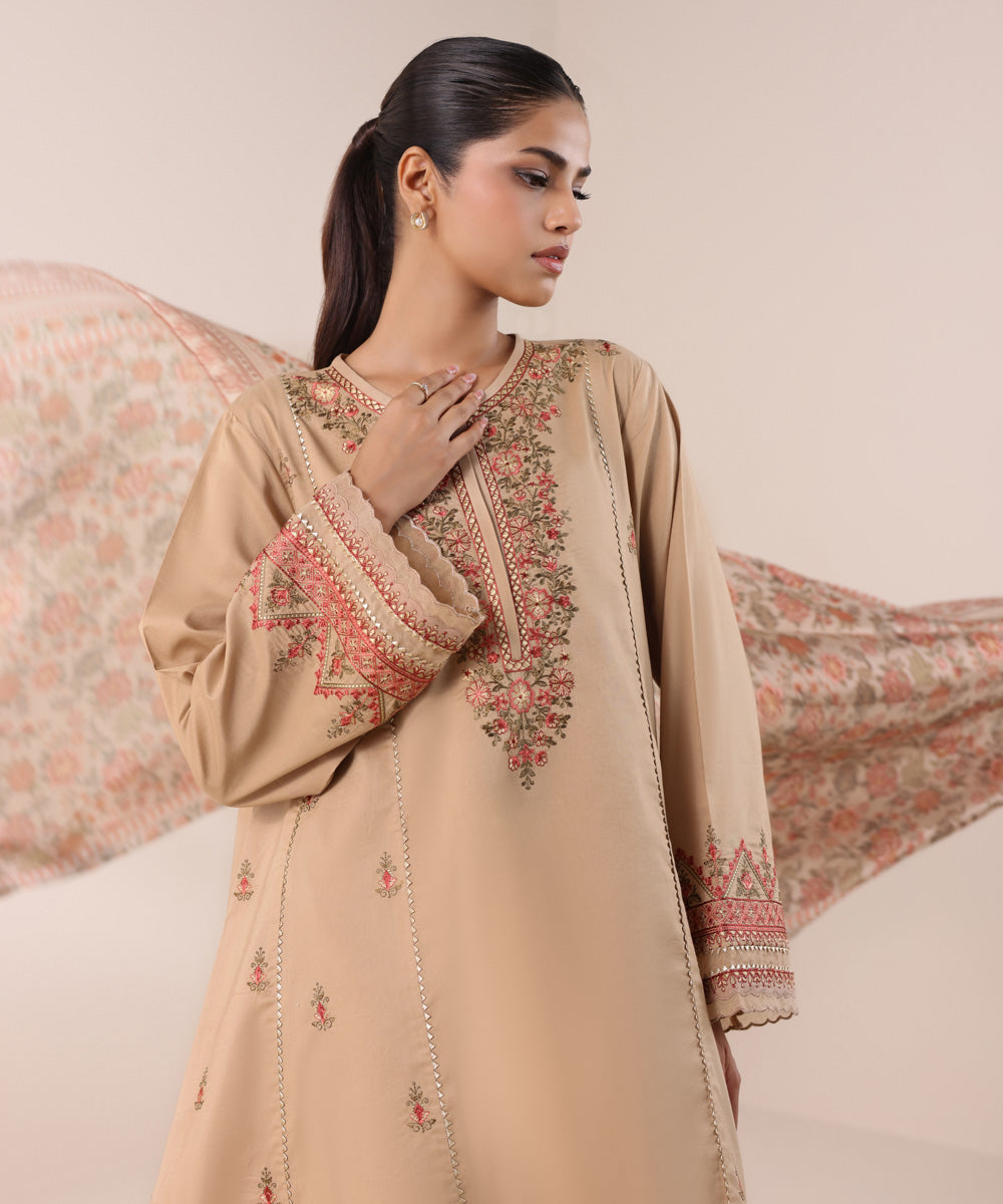 Opt for a traditional look in our embroidered two-piece featuring a beige cambric shirt and matching blended tissue dupatta.
