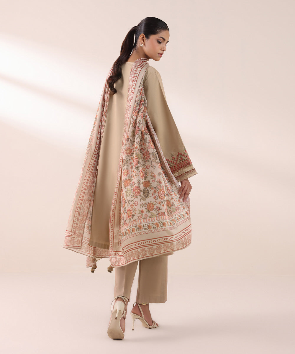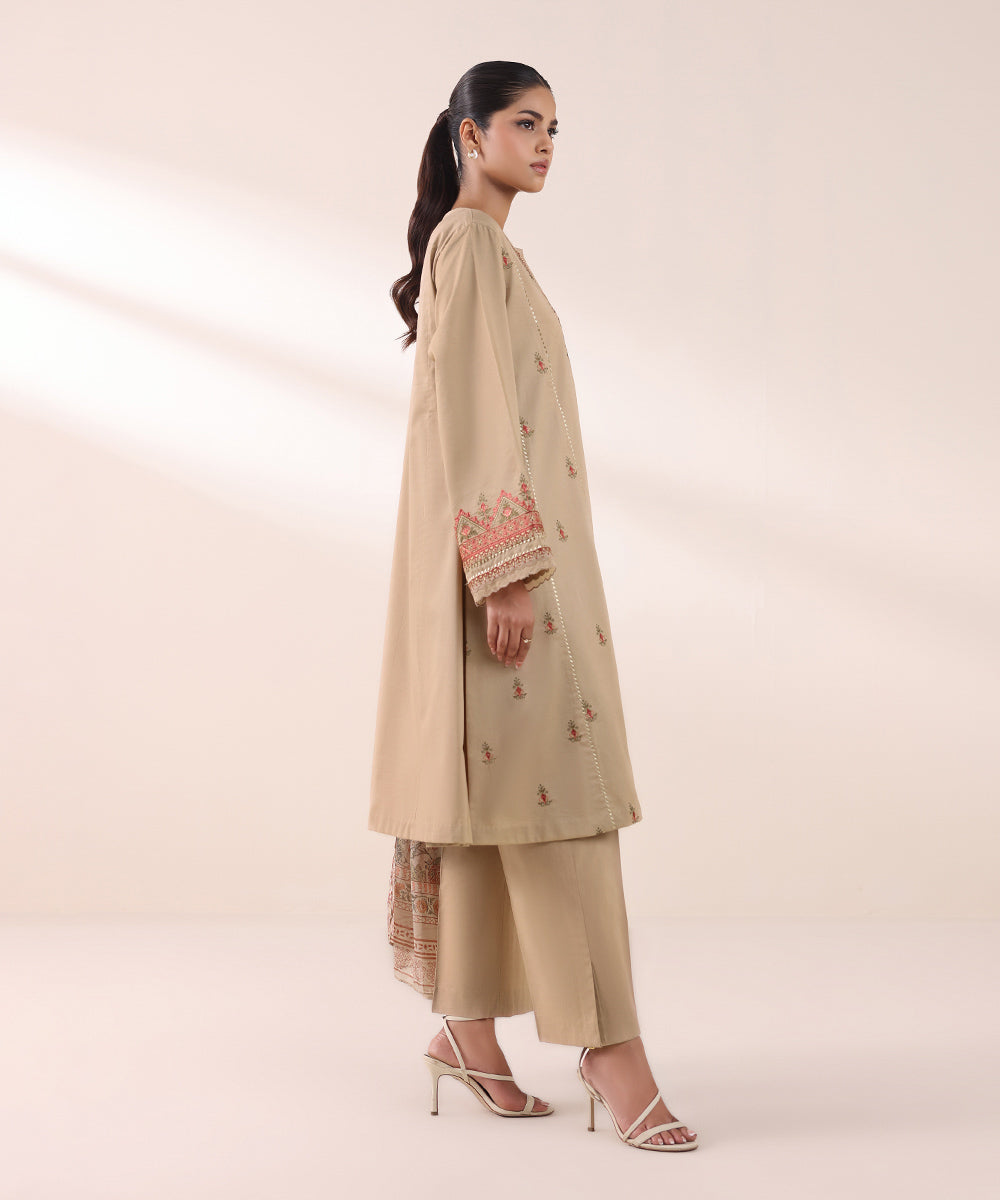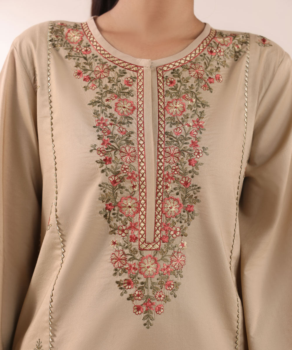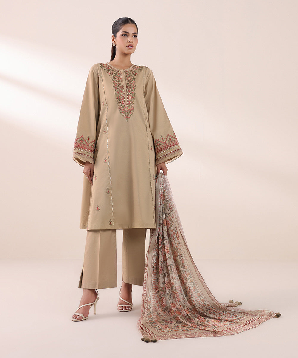 Opt for a traditional look in our embroidered two-piece featuring a beige cambric shirt and matching blended tissue dupatta.