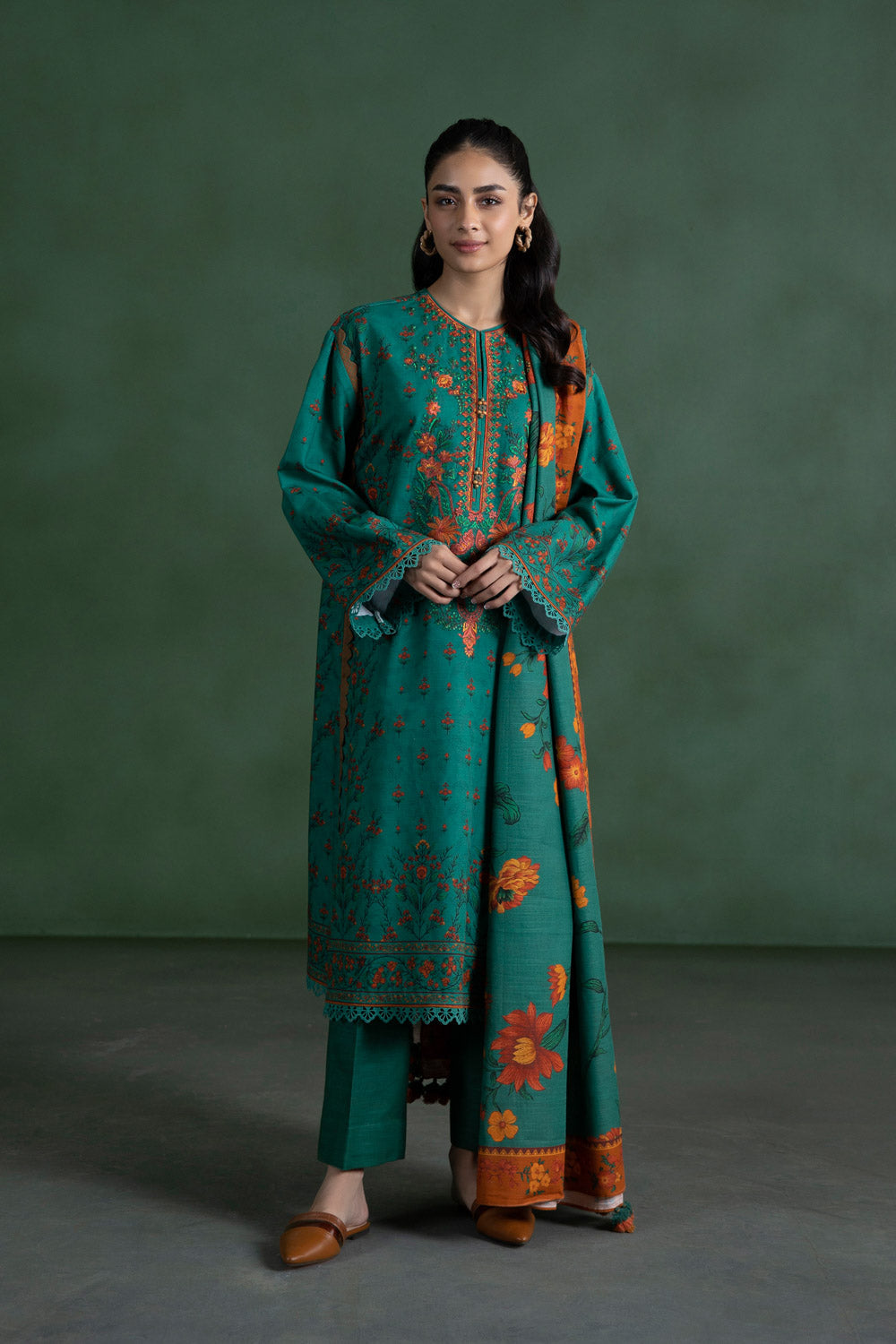 Immerse yourself in the essence of nature with this green toned printed embroidered khaddar ensemble paired with a printed dupatta.