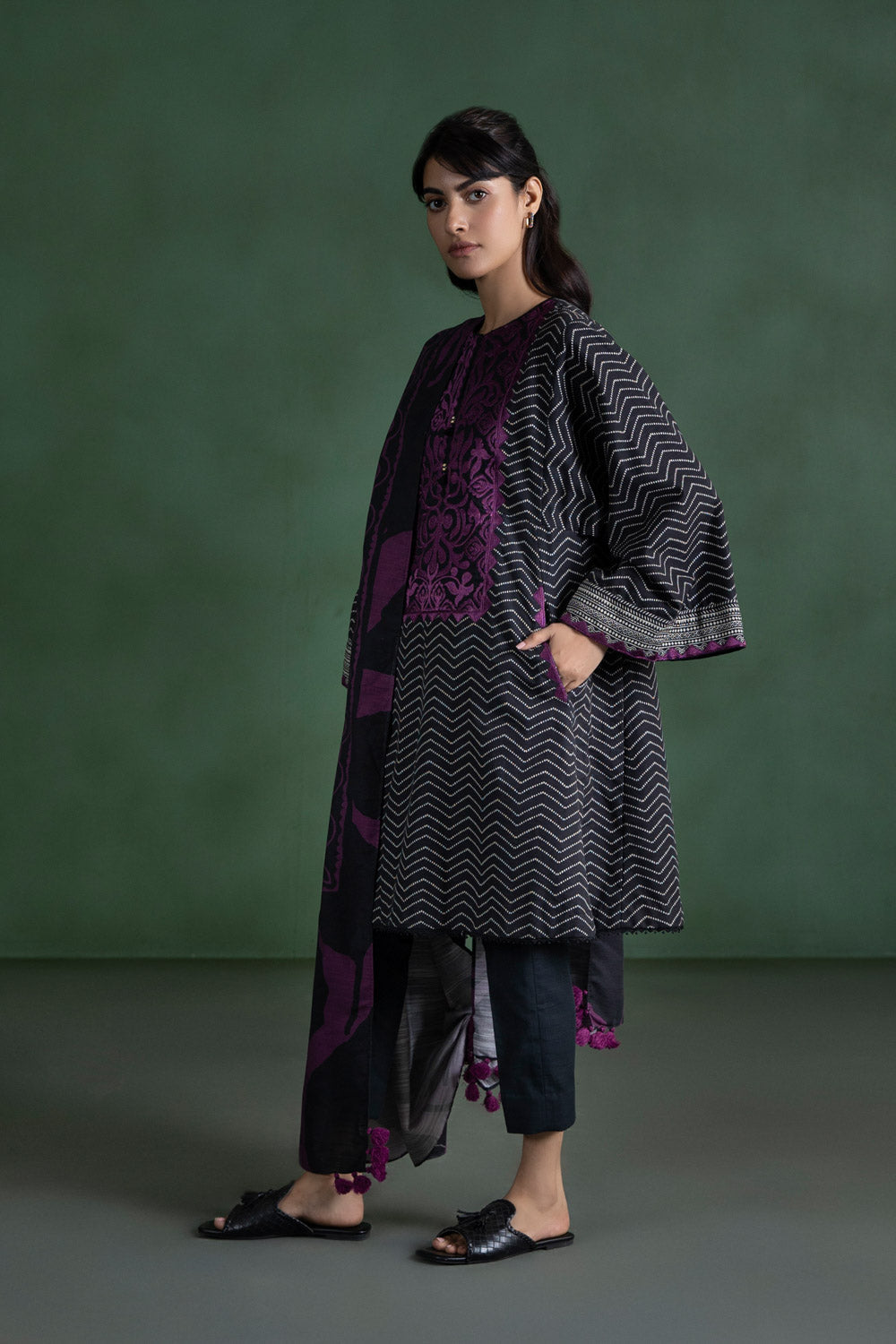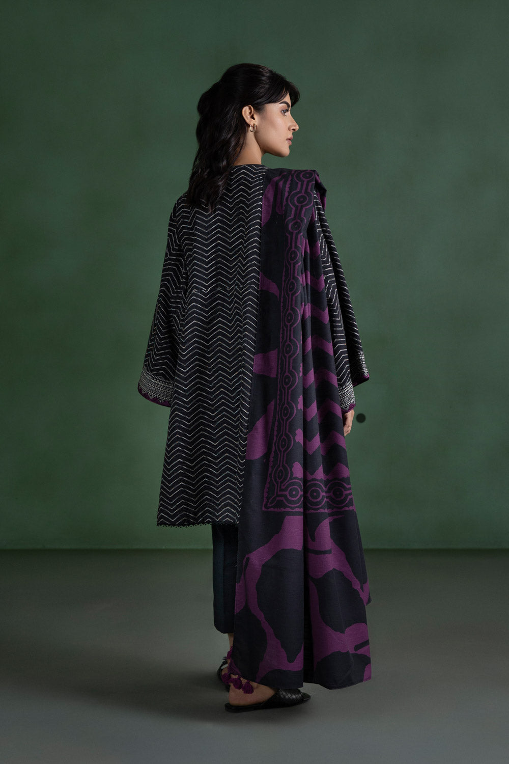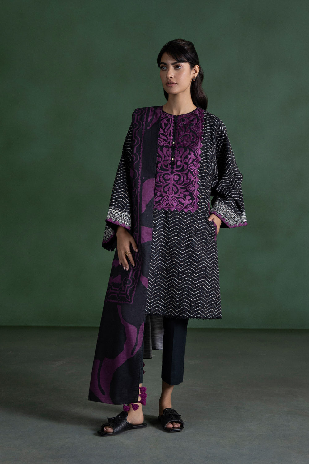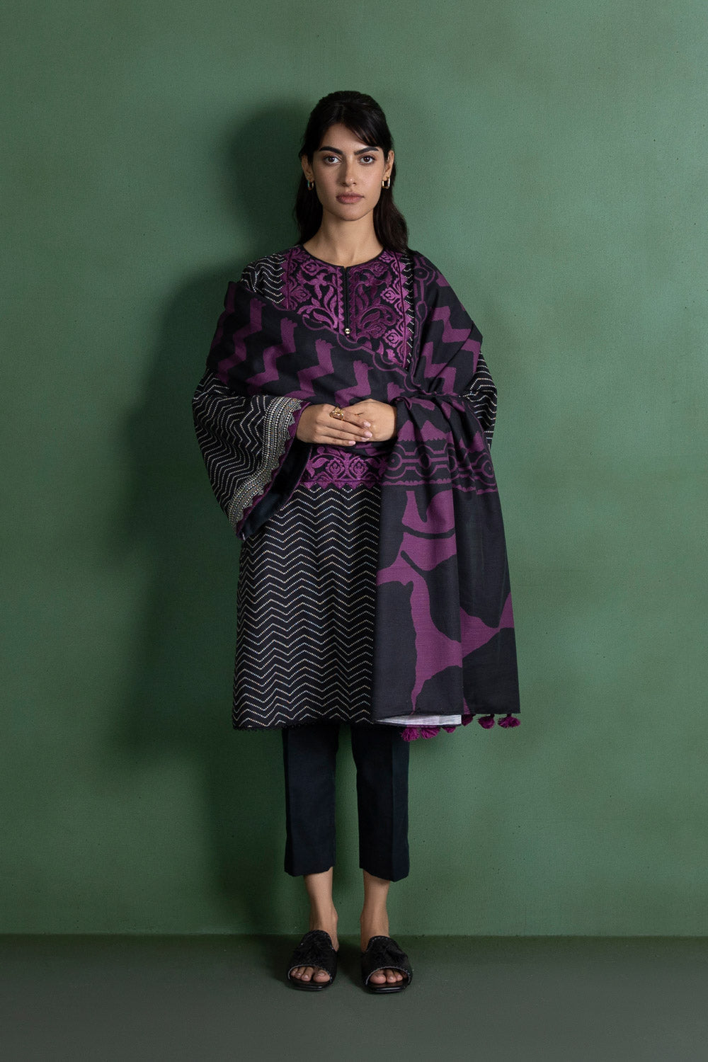 Exude grace with this dazzling black hued two-piece khaddar ensemble featuring intricate embroidered neckline & borders paired with black & purple shawl.