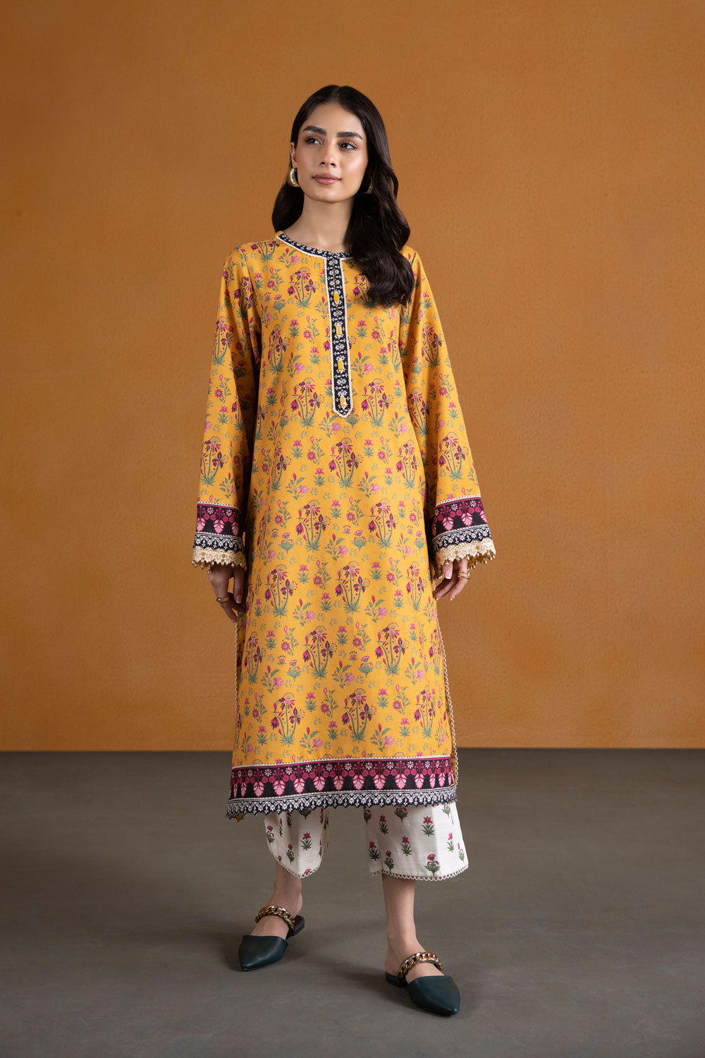 Immerse yourself in warm hues of yellow this winter with this dazzling khaddar ensemble featuring intricate embroidered detailing paired with off white printed trouser.