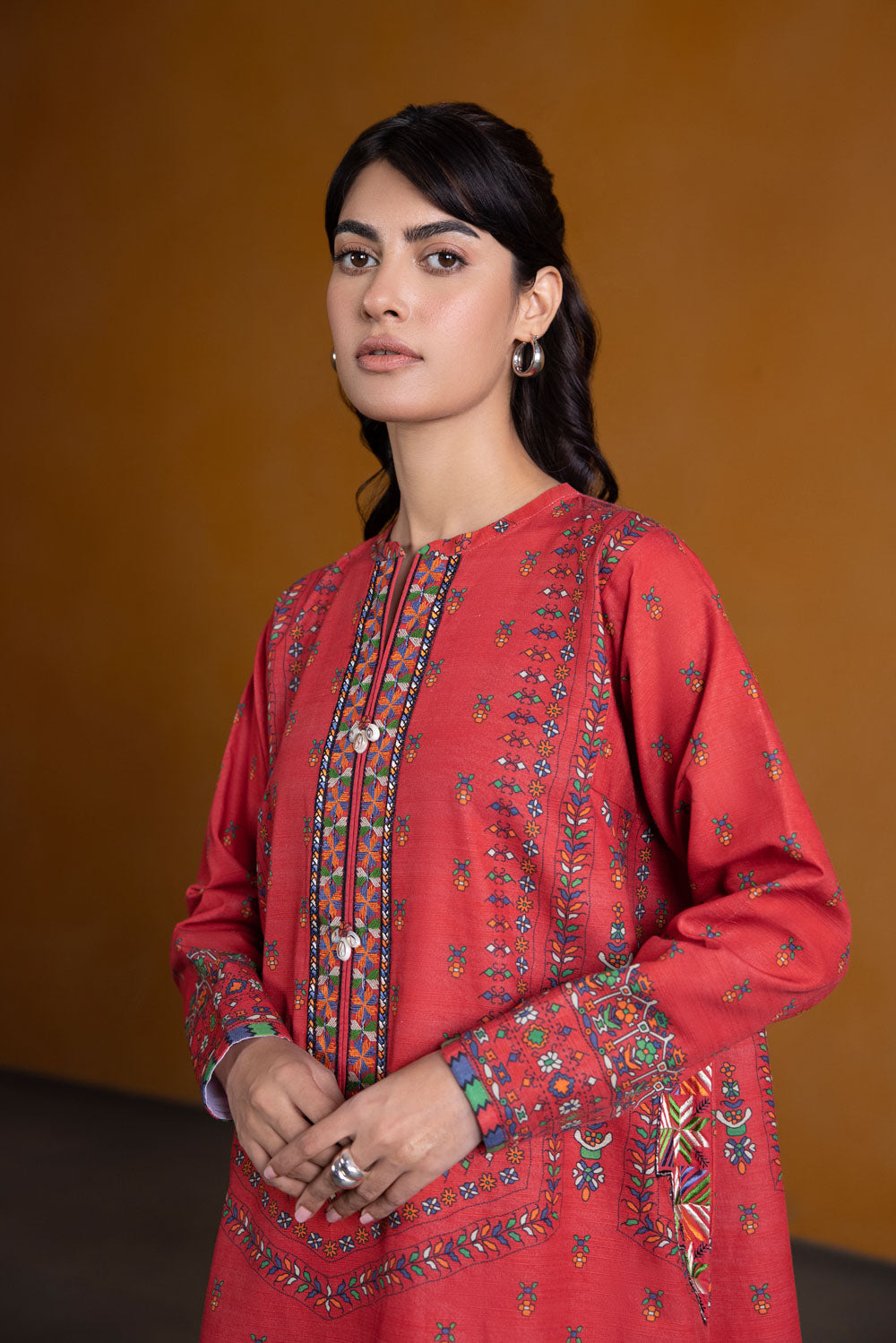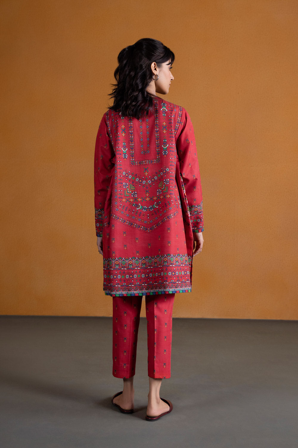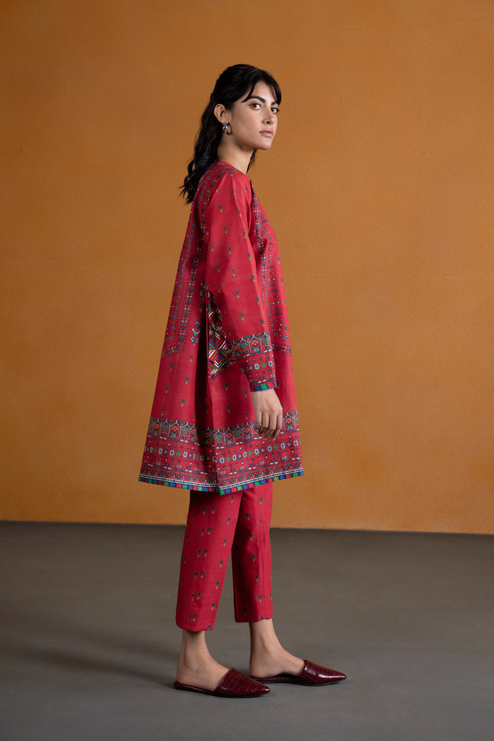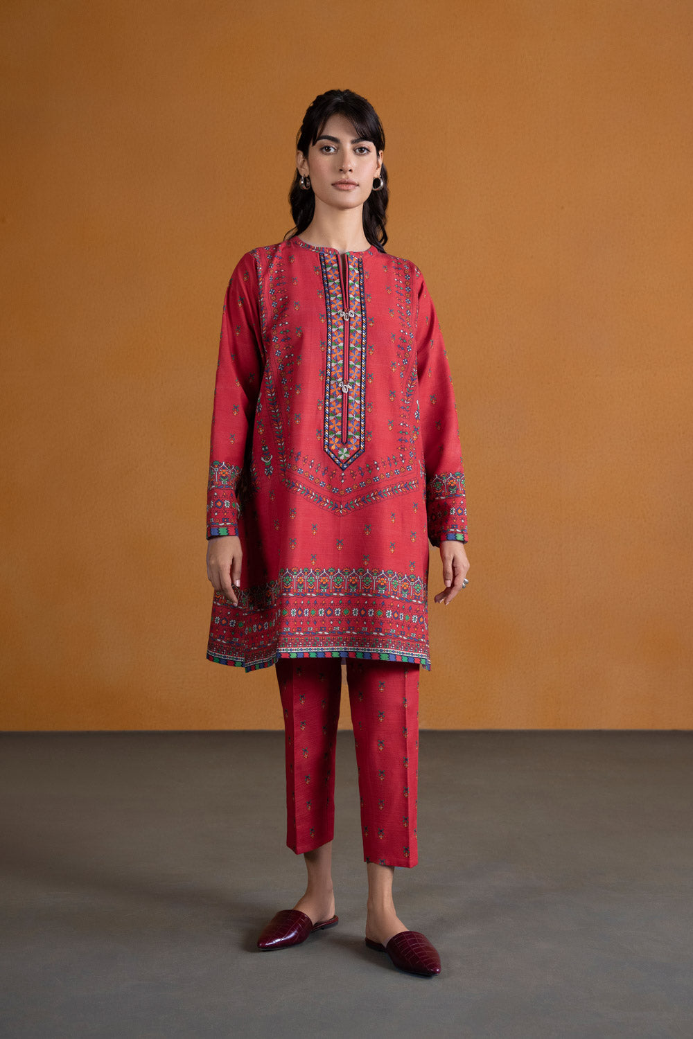 Indulge in a ruby affair with this red hued printed khaddar ensemble featuring embroidered pocket motifs paired with printed trouser.