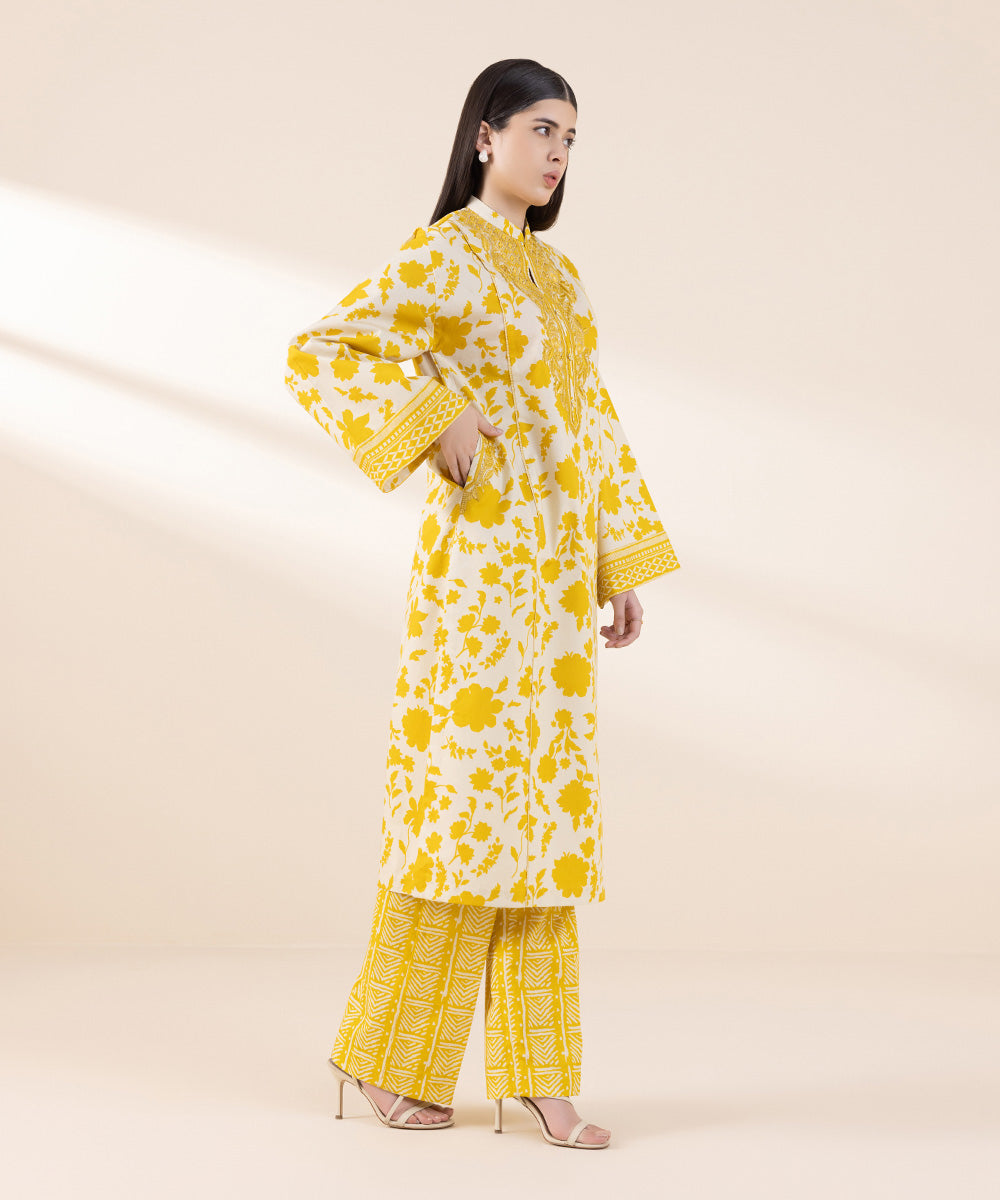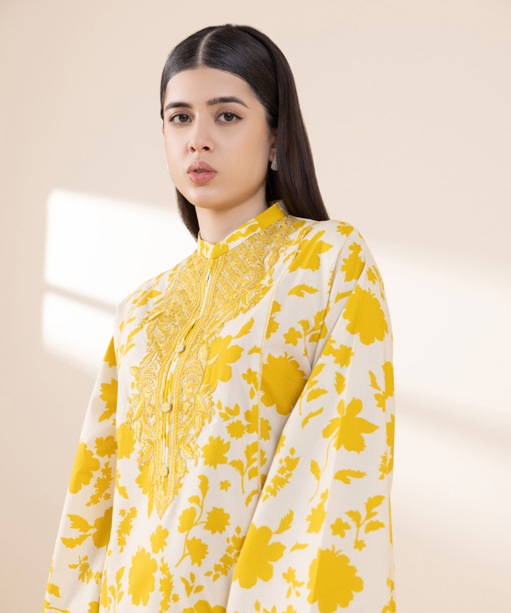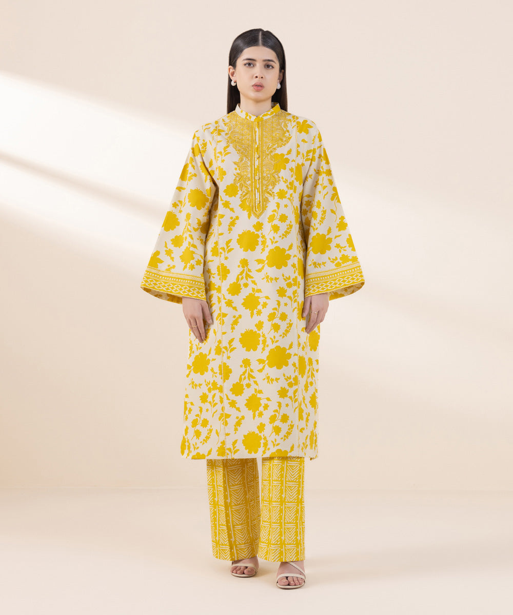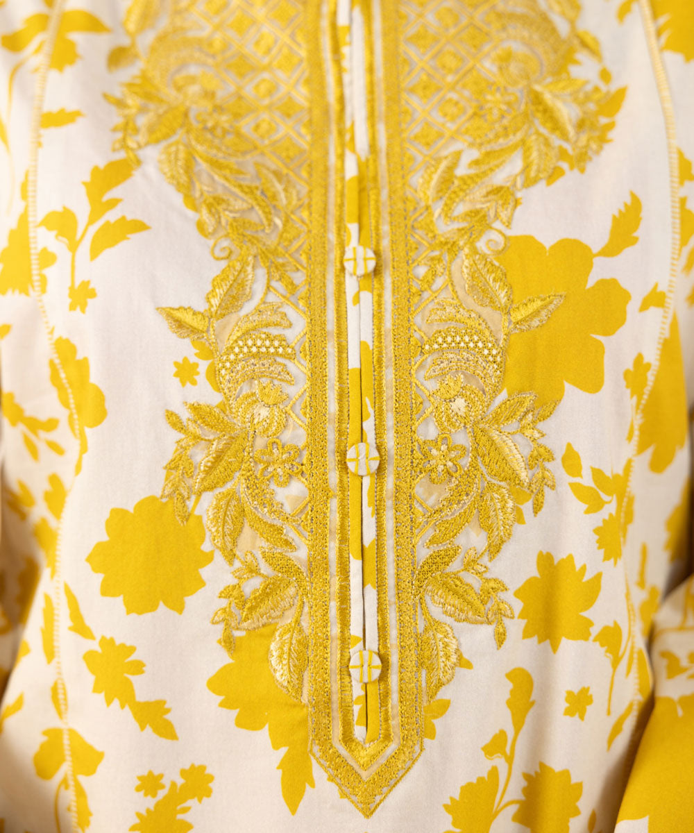 Make a statement this season with our embroidered two-piece suit featuring an ivory and yellow cambric shirt and trouser.