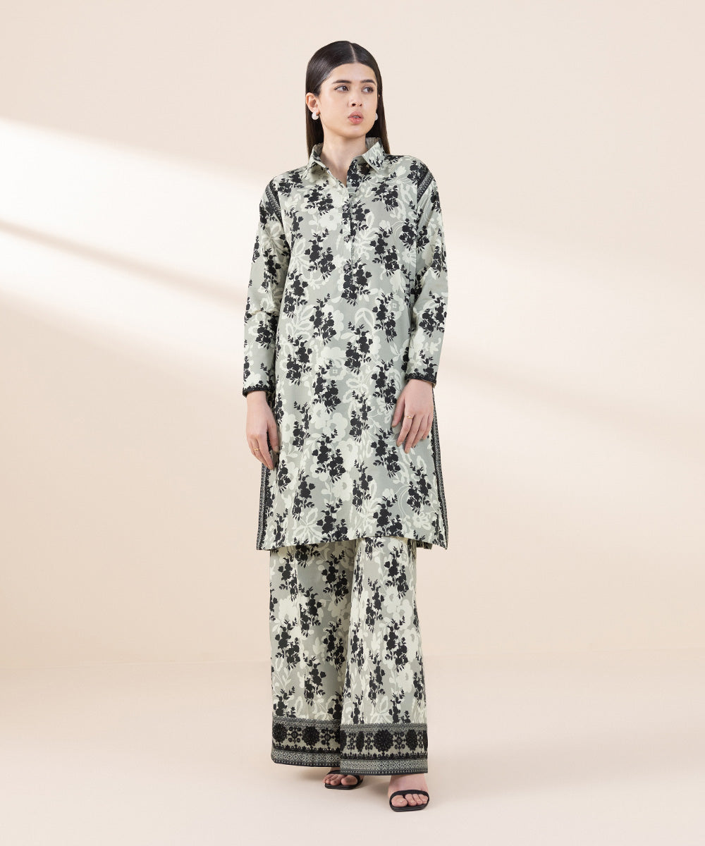 Elevate your seasonal style with our embroidered two-piece suit featuring a beige and black shirt and trouser.