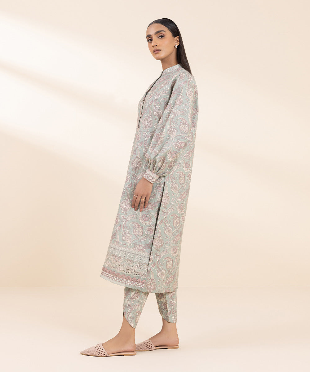 Elevate your style with our two-piece embroidered ensemble in laurel green featuring a cambric shirt paired with matching trousers.