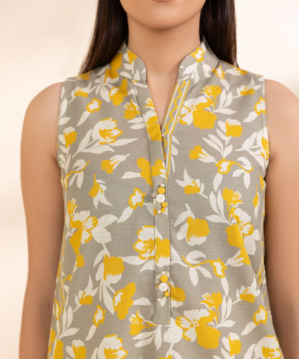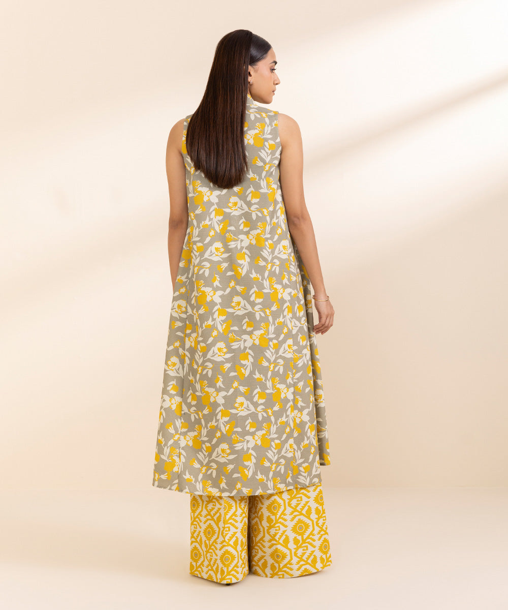 Elevate your winter style with our two-piece grey, yellow and ivory light khaddar suit featuring printed shirt and trousers.