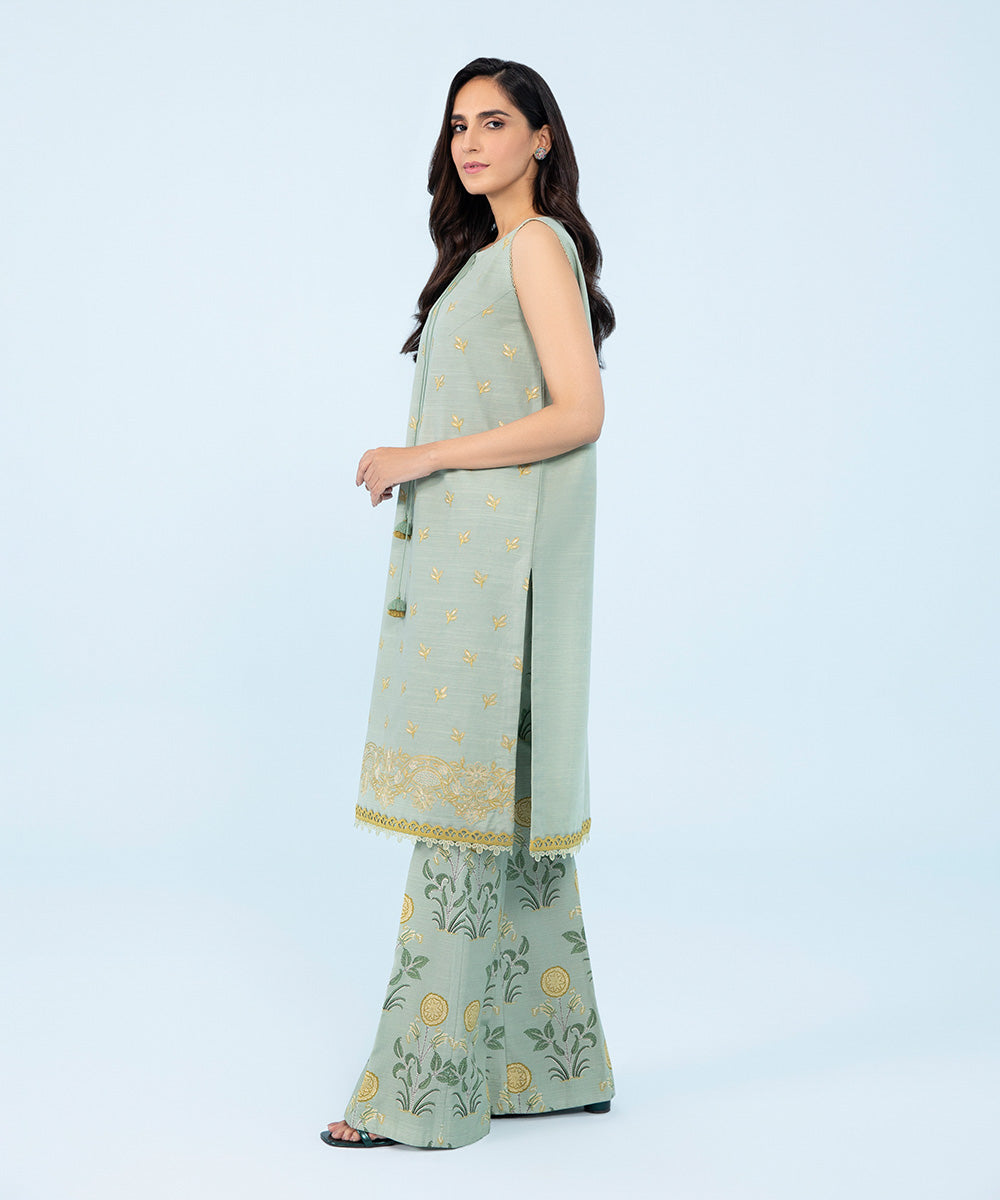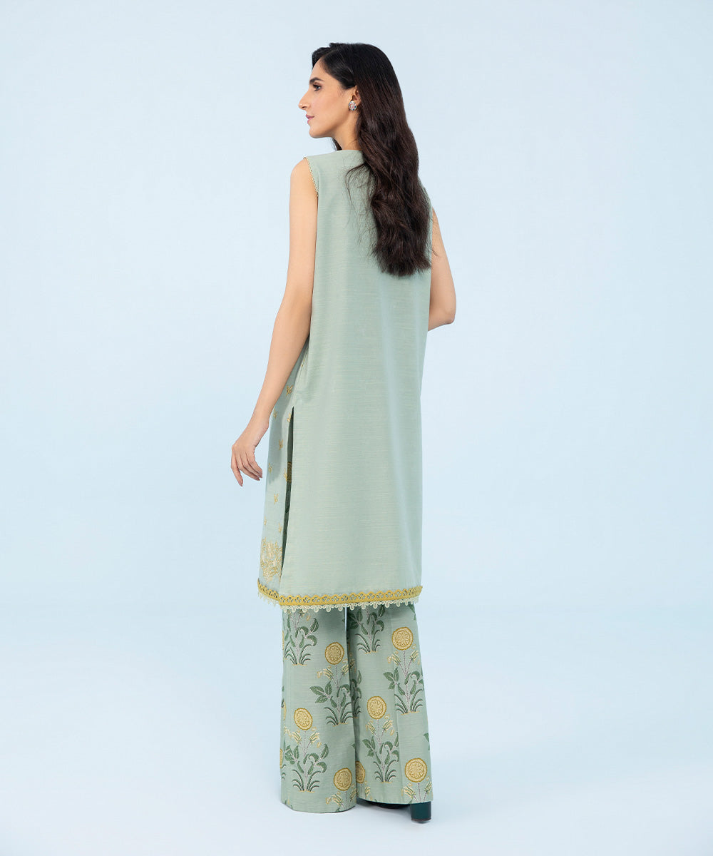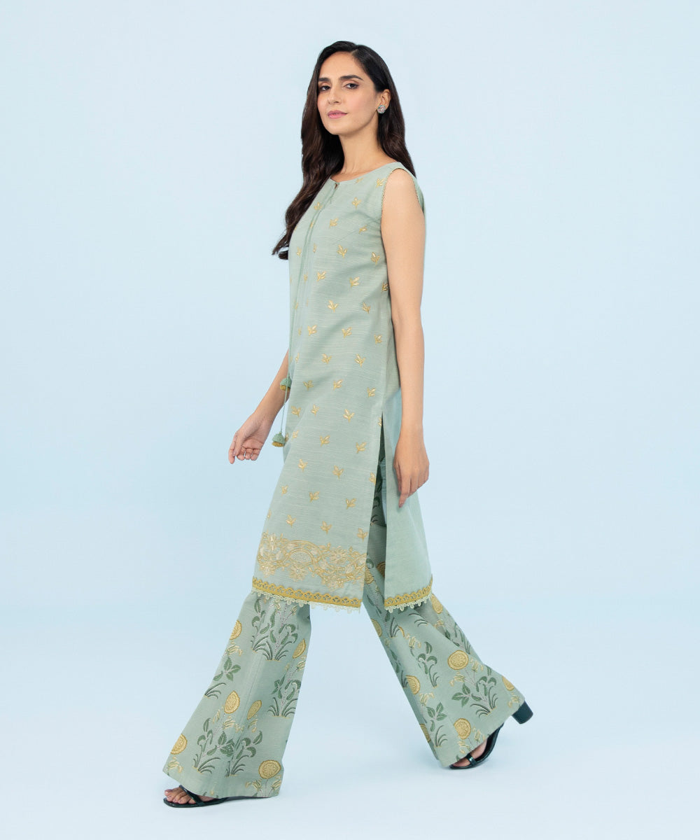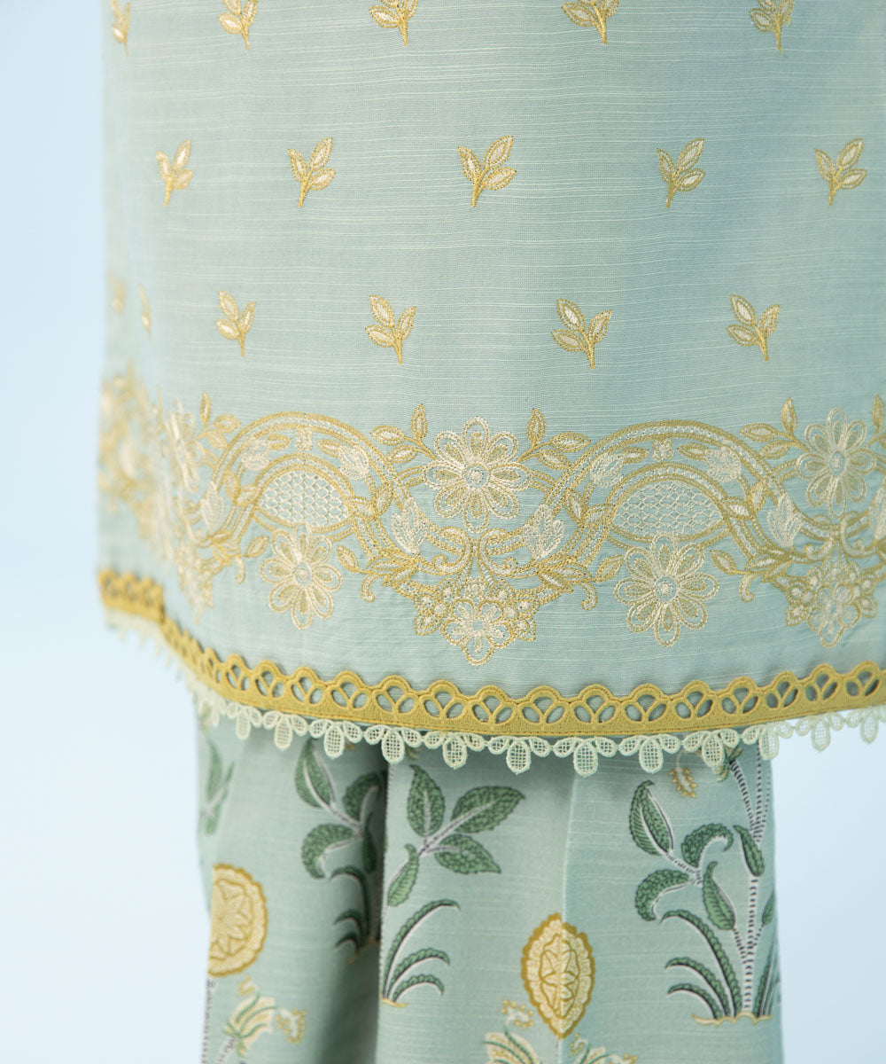 Captivate in our mint green two-piece ensemble accented with intricate floral patterns paired with pants.