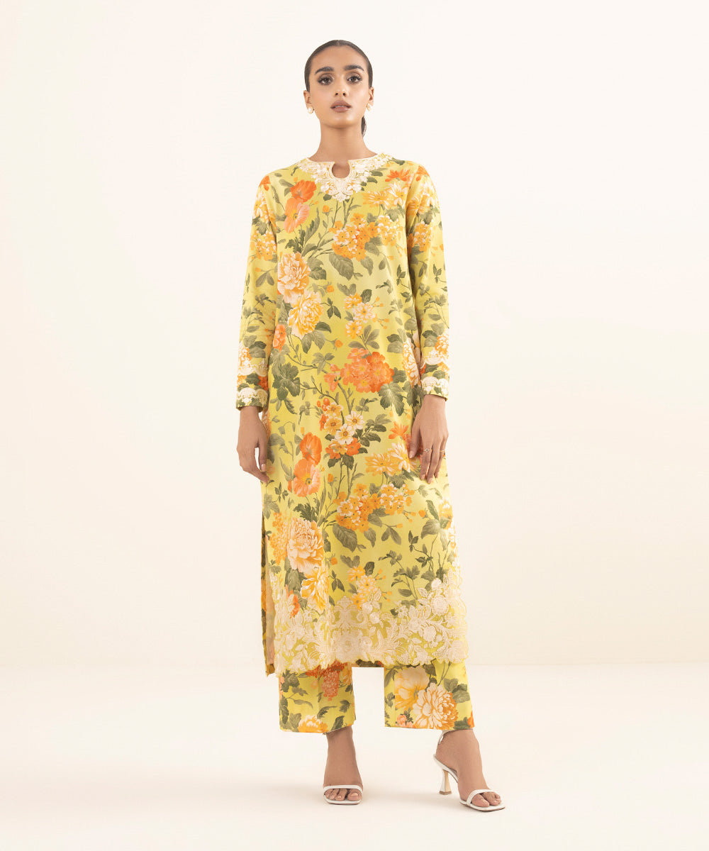 Indulge in a floral fantasy with our corn yellow & multicoloured two-piece.
