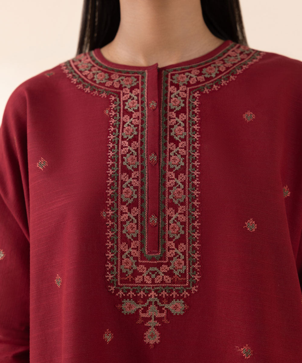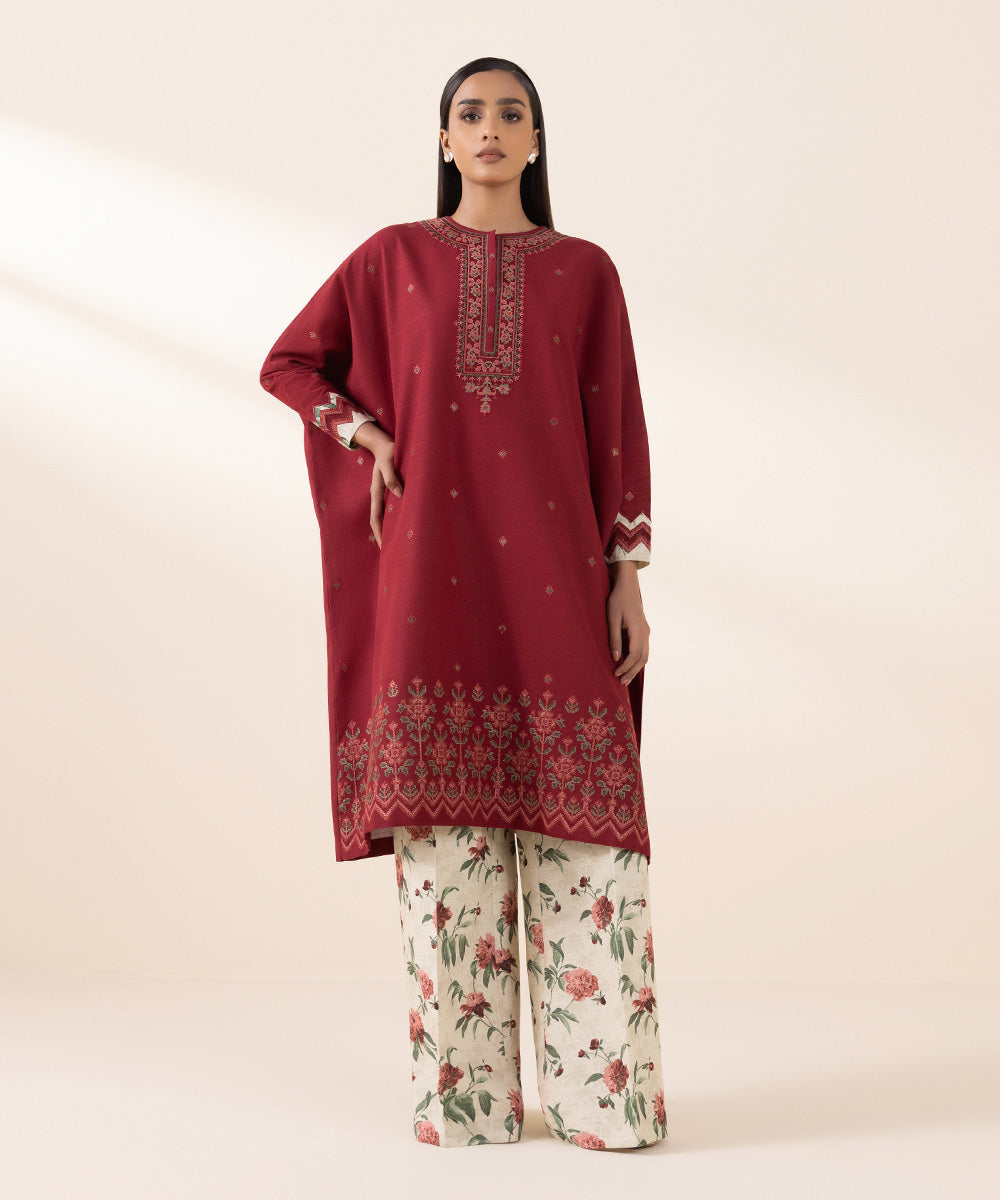 Nail the trendy winter look with our khaddar scarlet red and off-white two-piece featuring embroidered shirt and printed trousers.