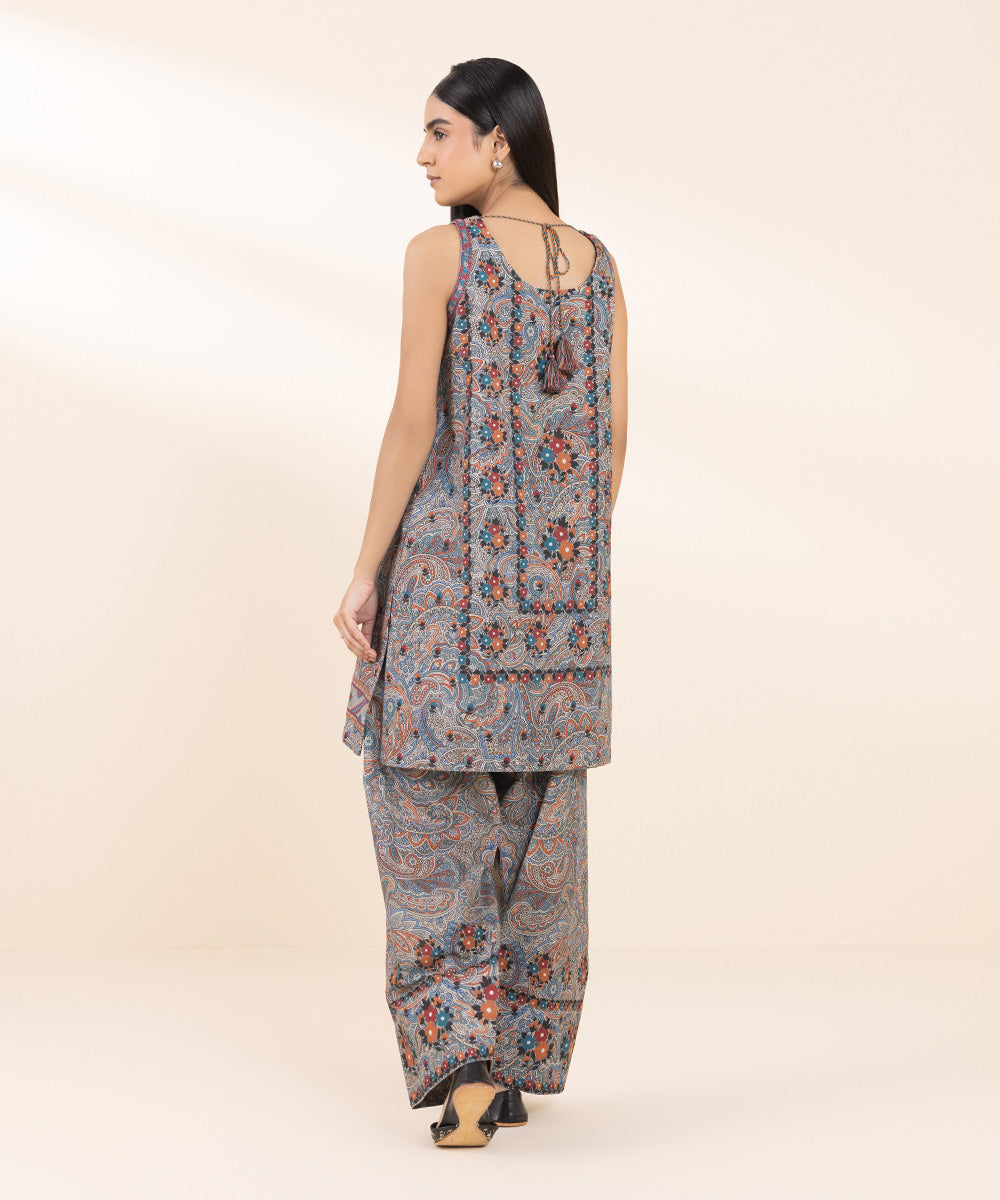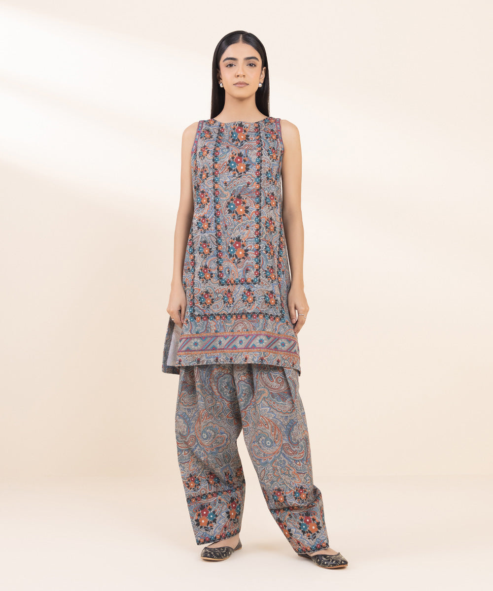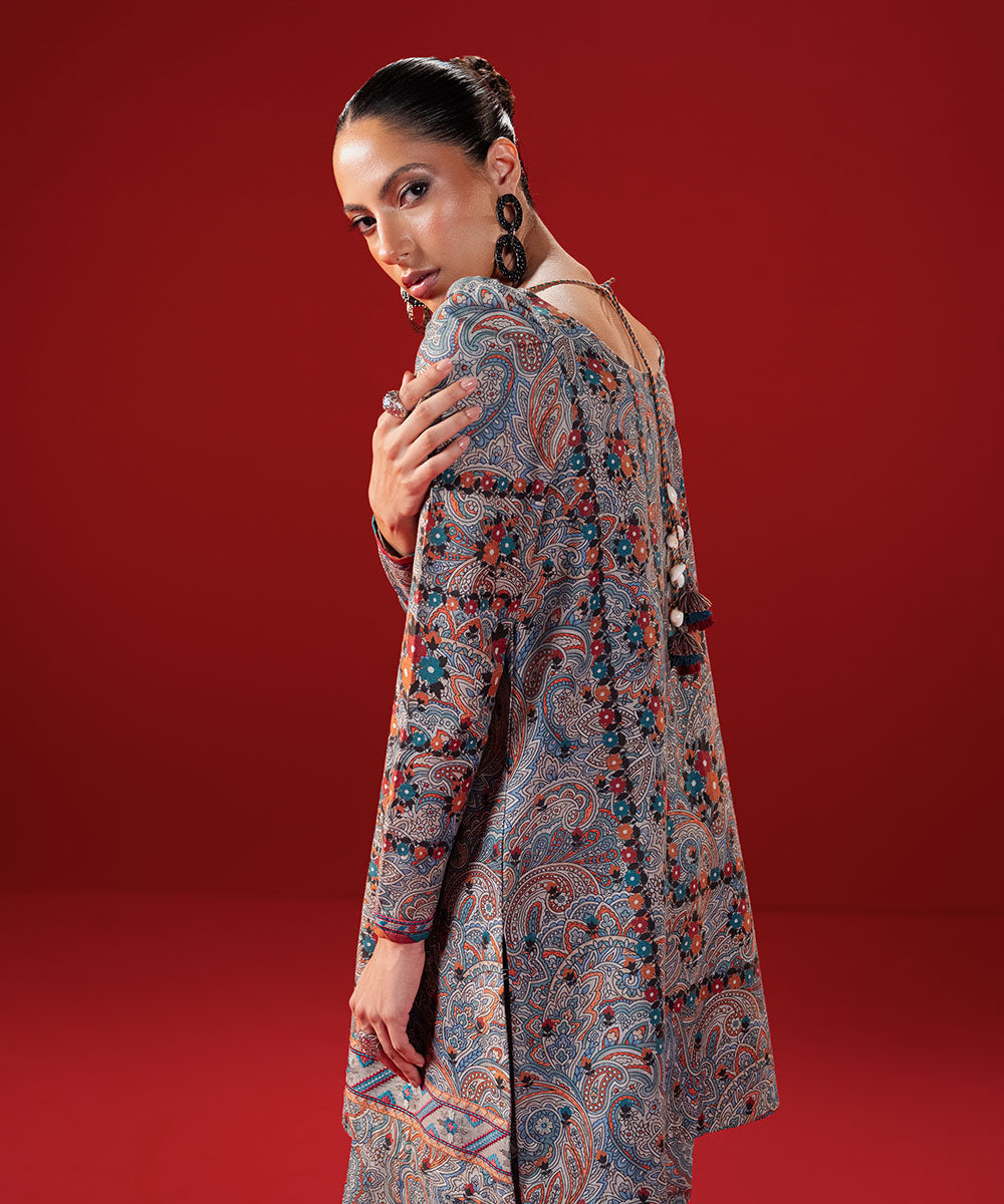 Enhance your winter aesthetic with our two-piece embroidered multicoloured and light grey khaddar shirt and trousers.