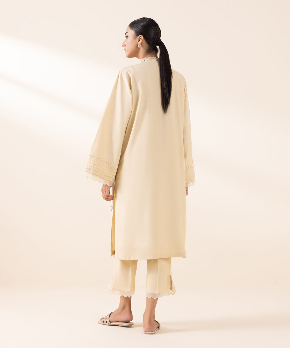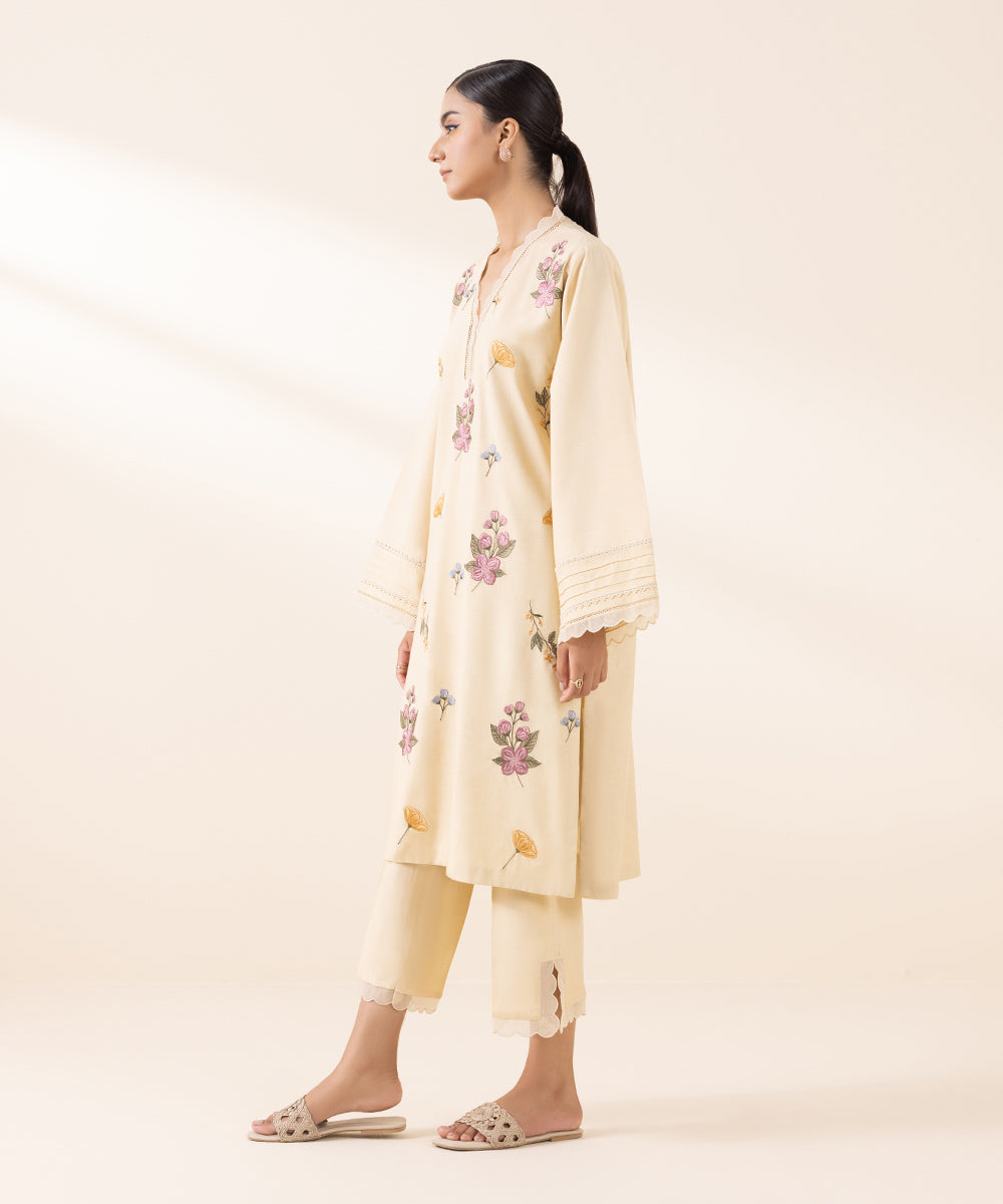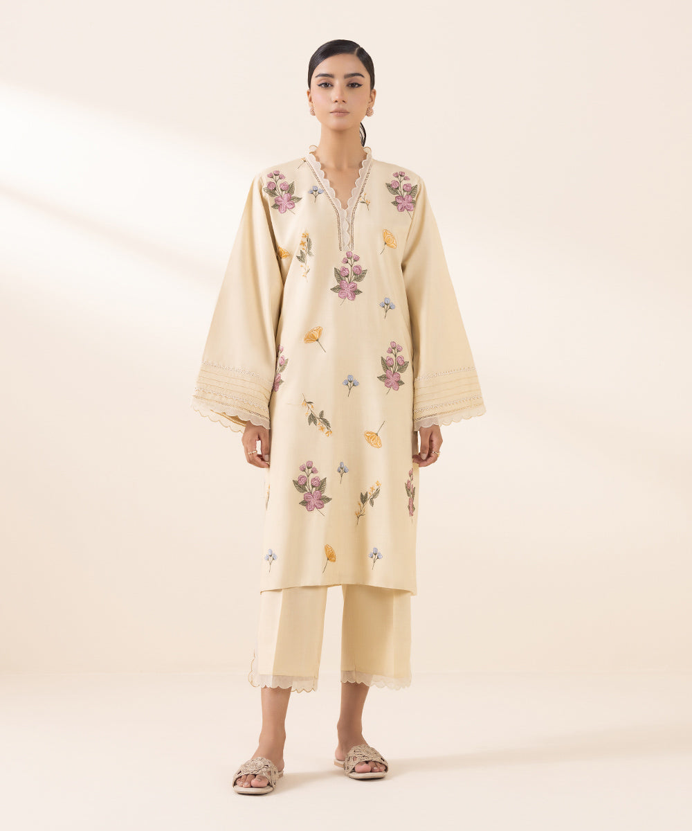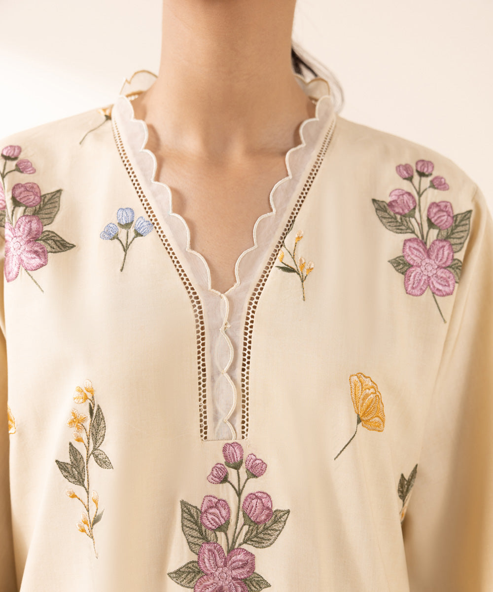 Experience blooming florals in our beige, embroidered two-piece featuring an arabic lawn shirt and cambric trousers.