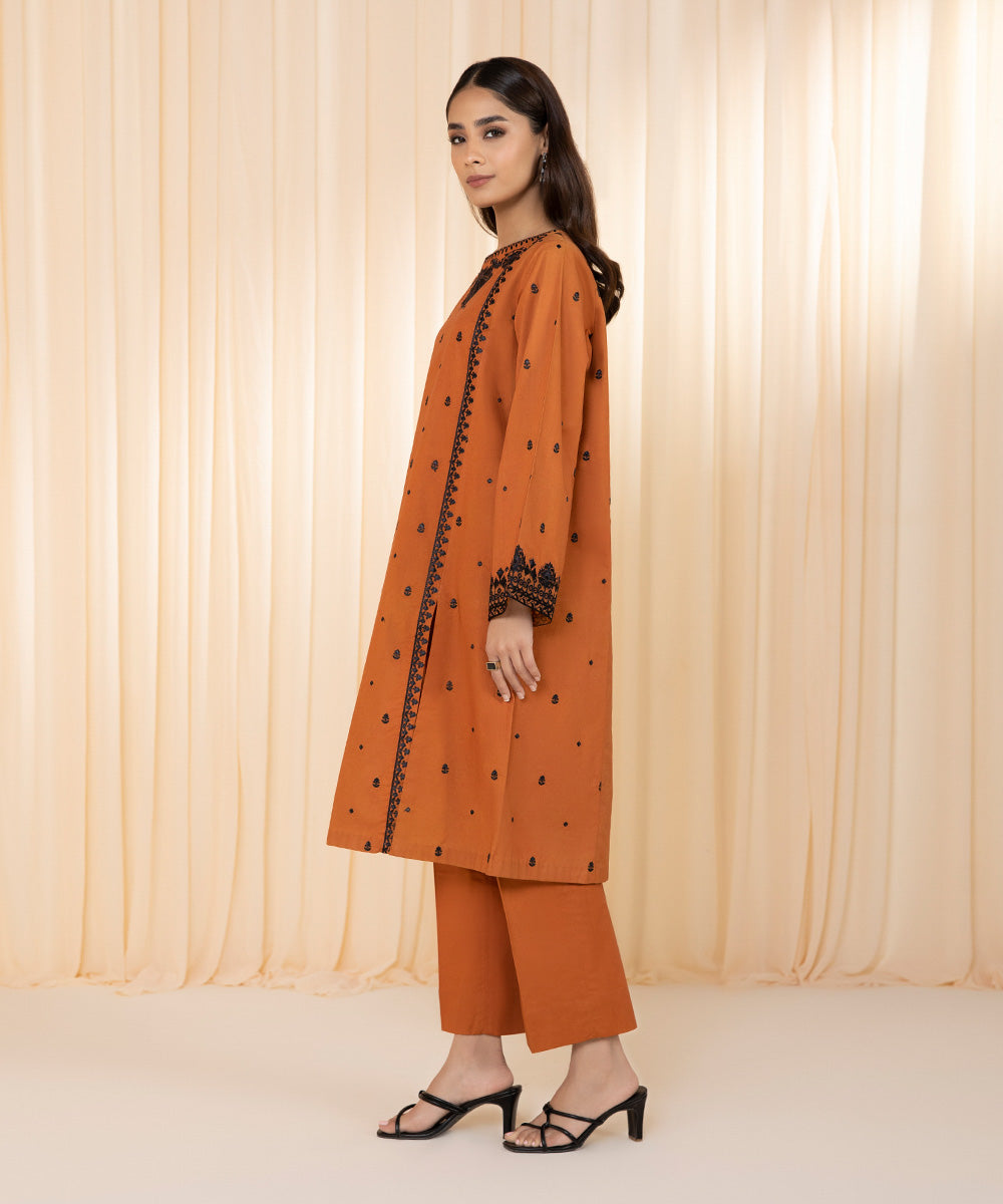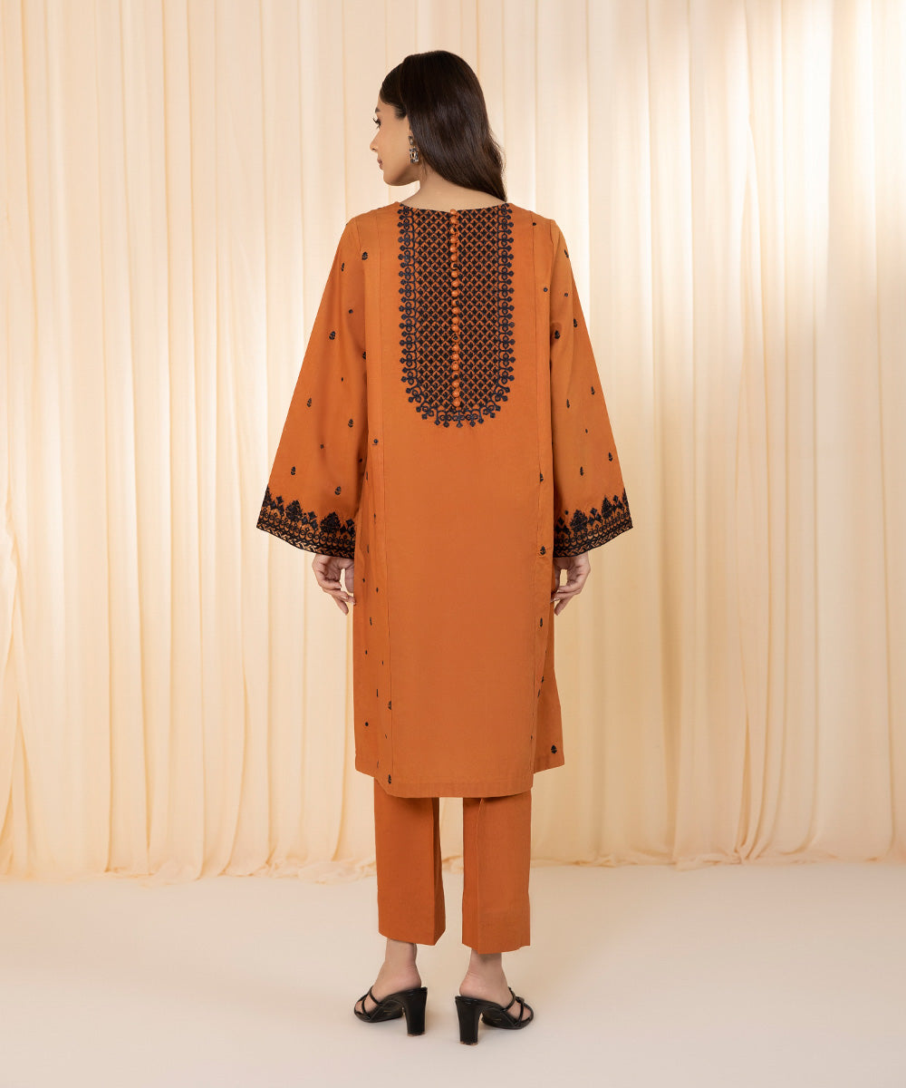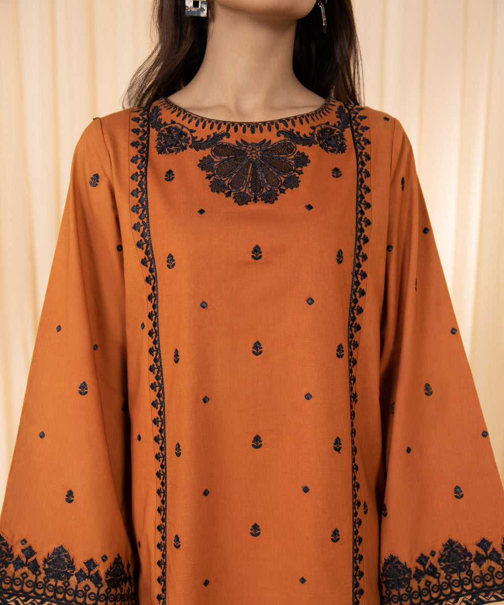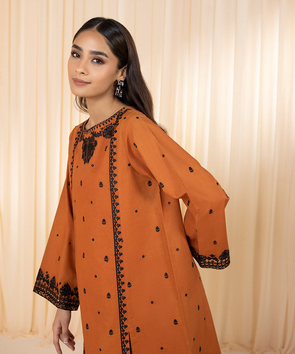 For a timeless allure adorn our rust hued two-piece featuring intricate detailing on neckline, front and sleeves.