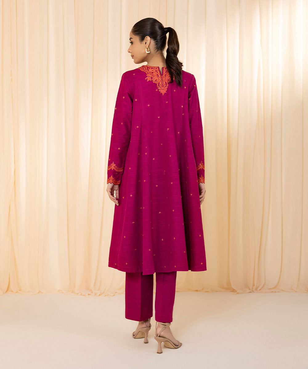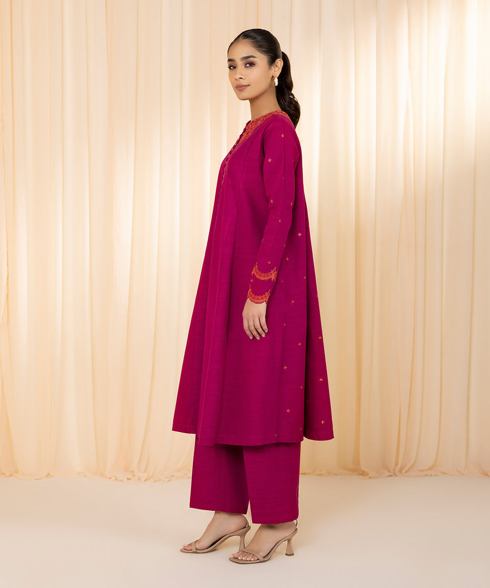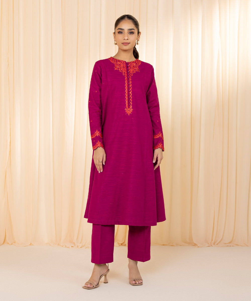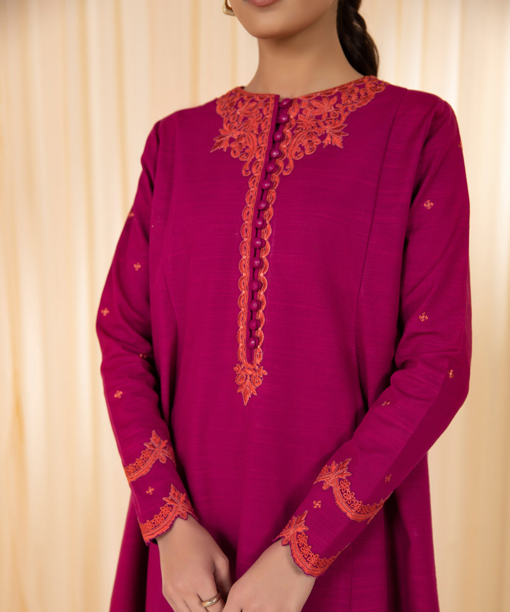 There is nothing like a pop of magenta! Adorn our khaddar two-piece accented with intricate neckline for an elevated style!