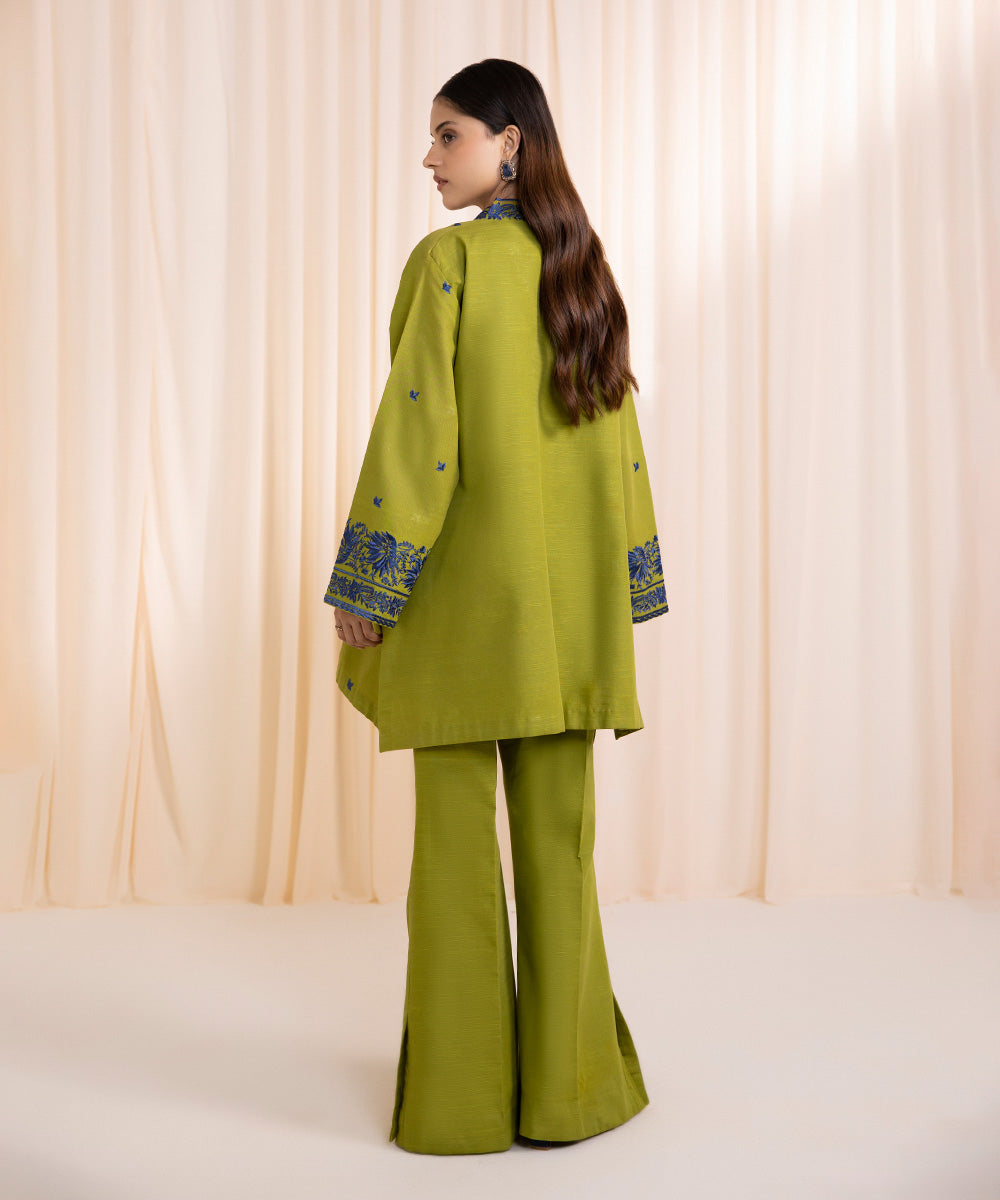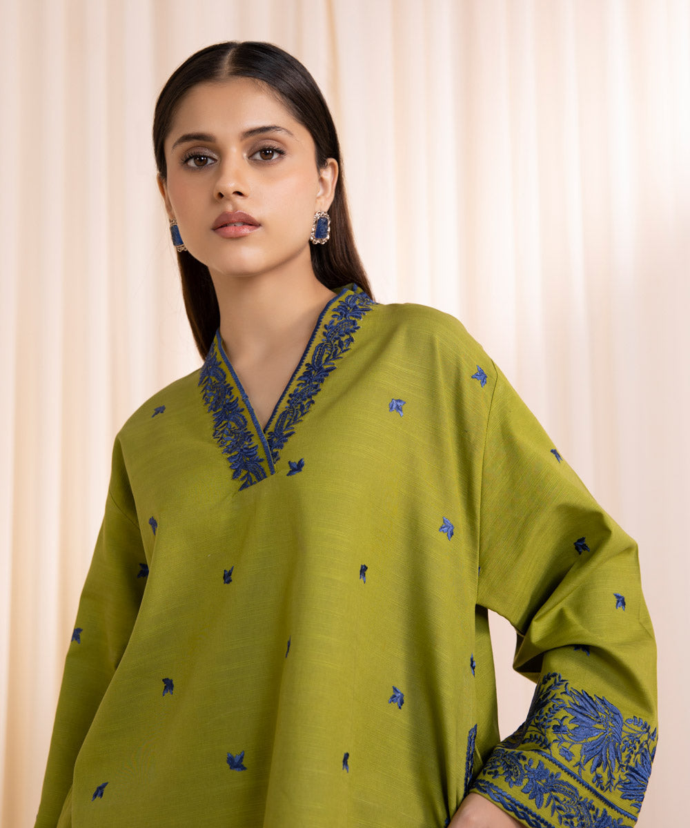 Upgrade your wardrobe with our olive green khaddar two-piece featuring intricate detailing.