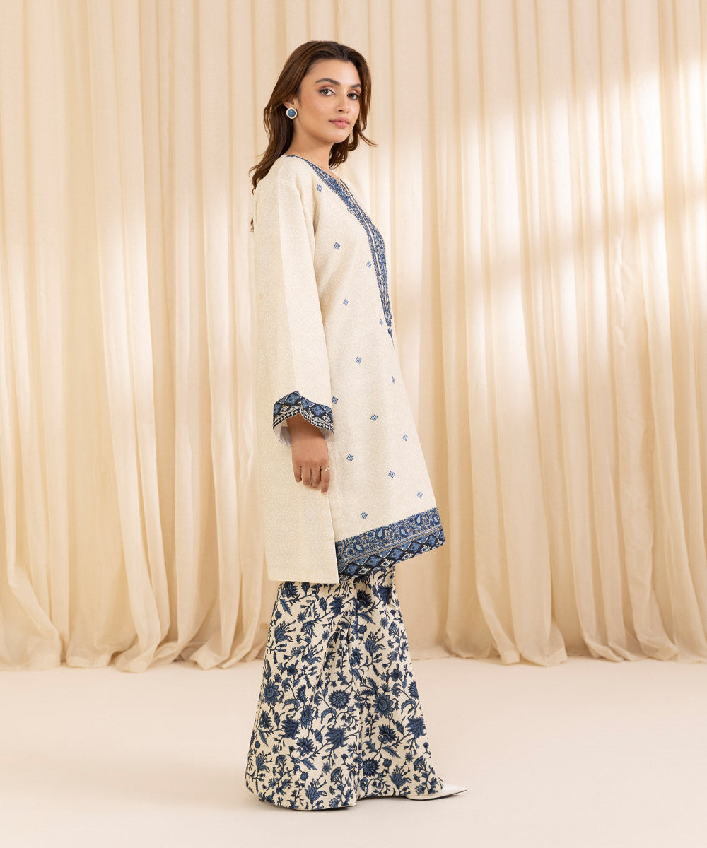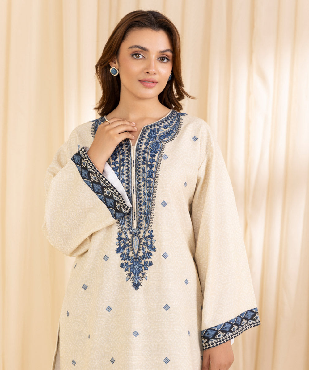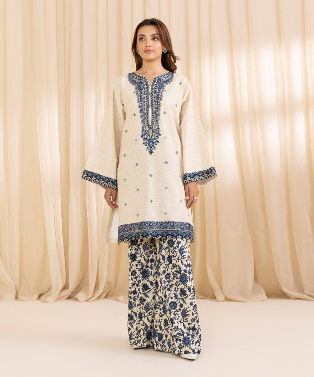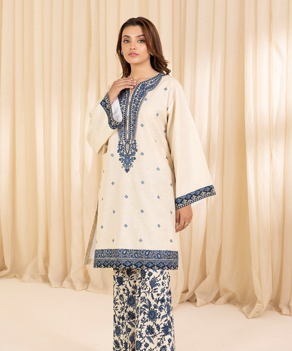 Elevate your style with our two-piece embroidered ensemble in ivory and blue featuring a floral khaddar shirt paired with printed trousers.