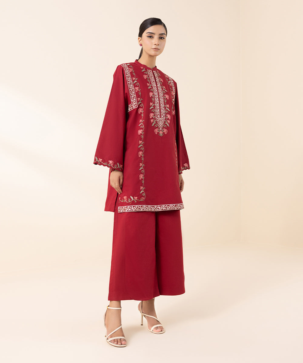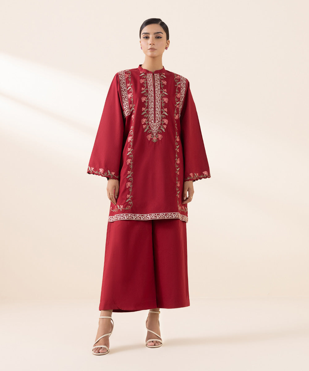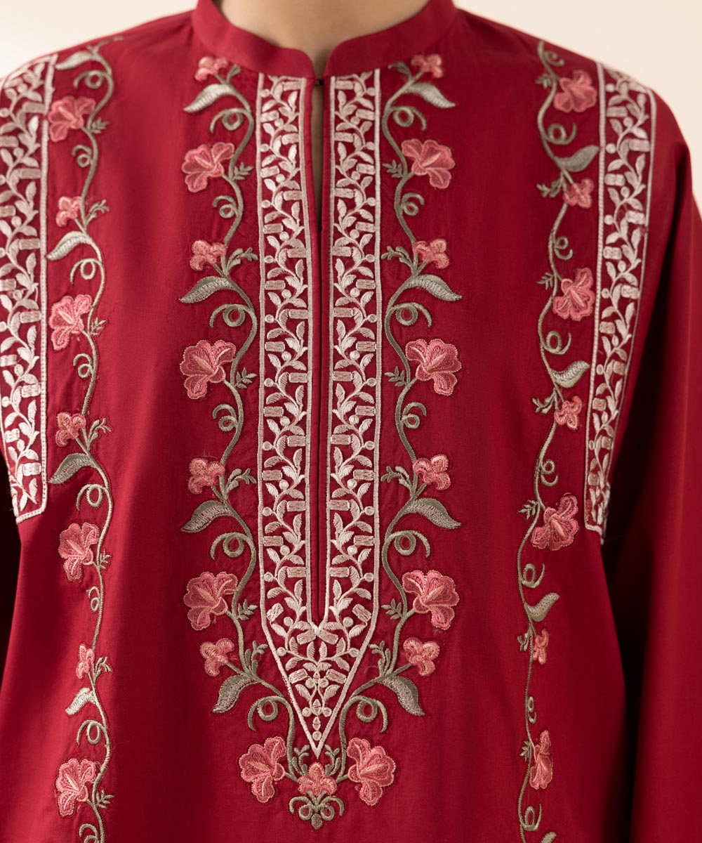 Experience blooming florals in our scarlet red, embroidered cambric two-piece featuring shirt and trousers.
