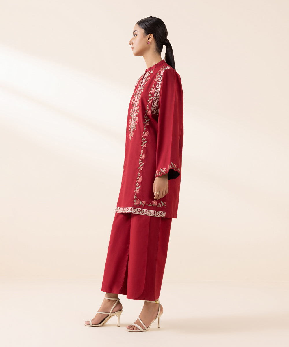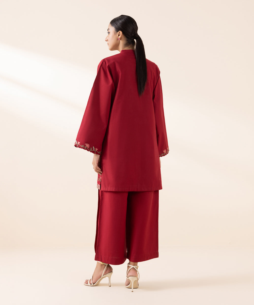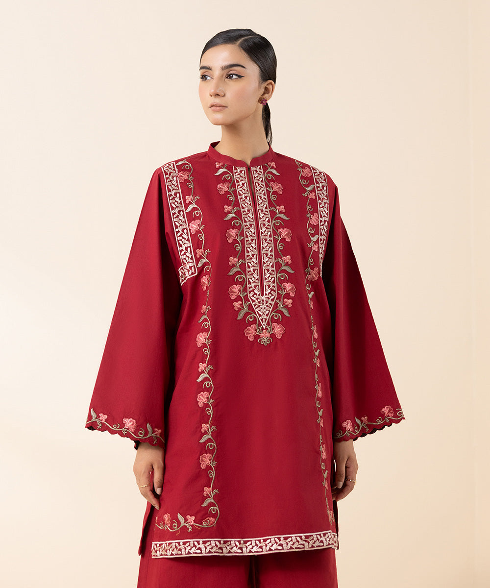 Experience blooming florals in our scarlet red, embroidered cambric two-piece featuring shirt and trousers.