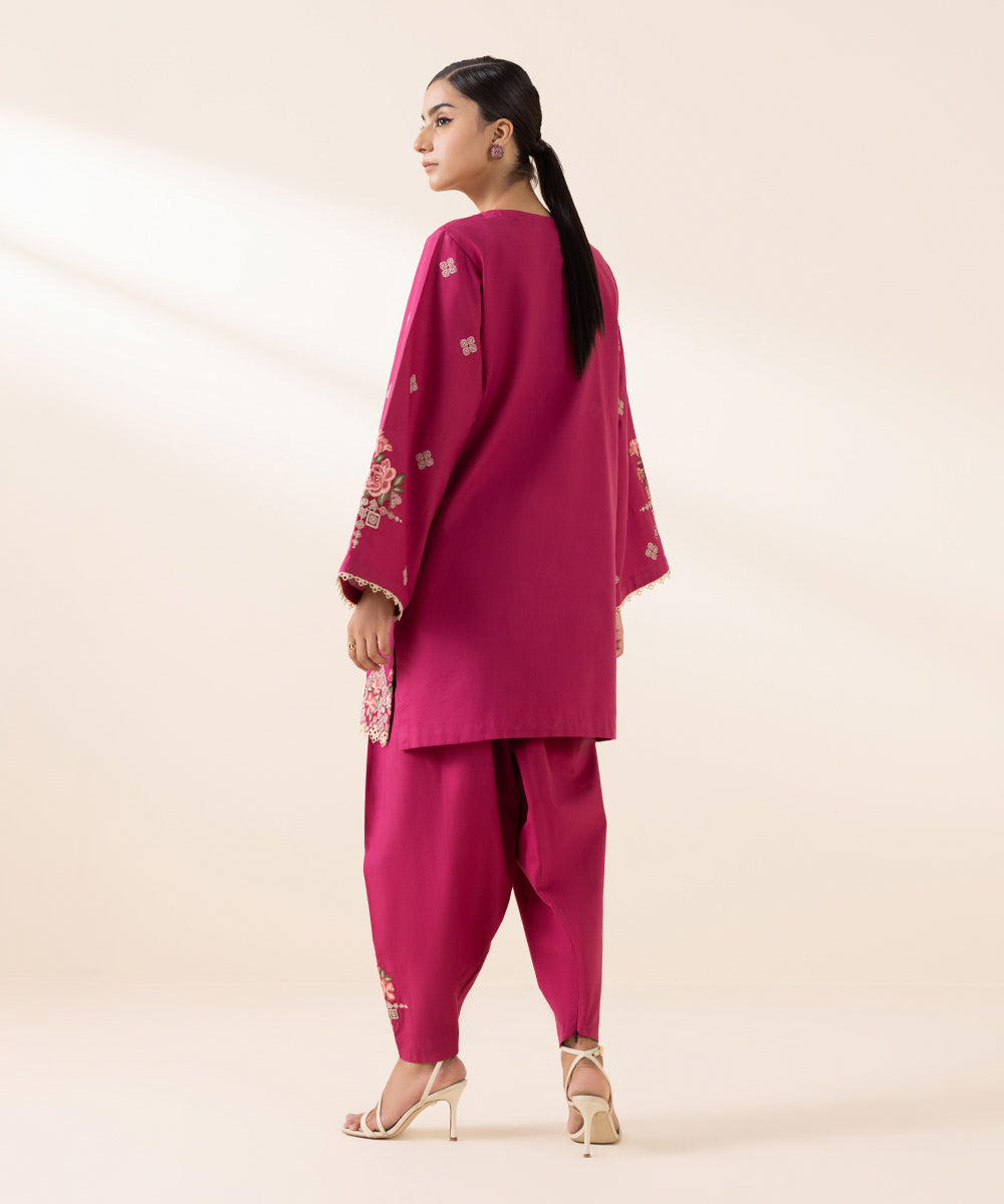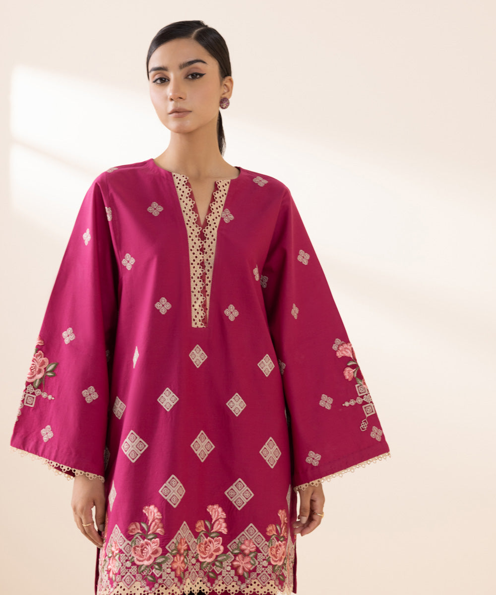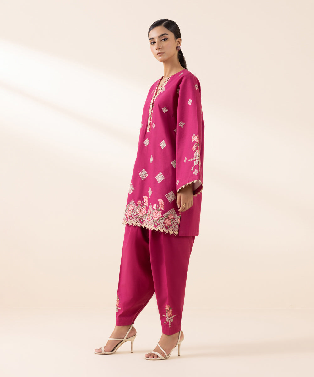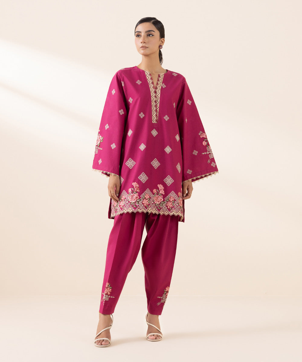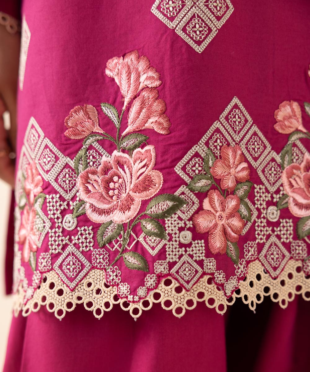 Experience blooming florals in our crimson, embroidered cambric two-piece featuring shirt and trousers.