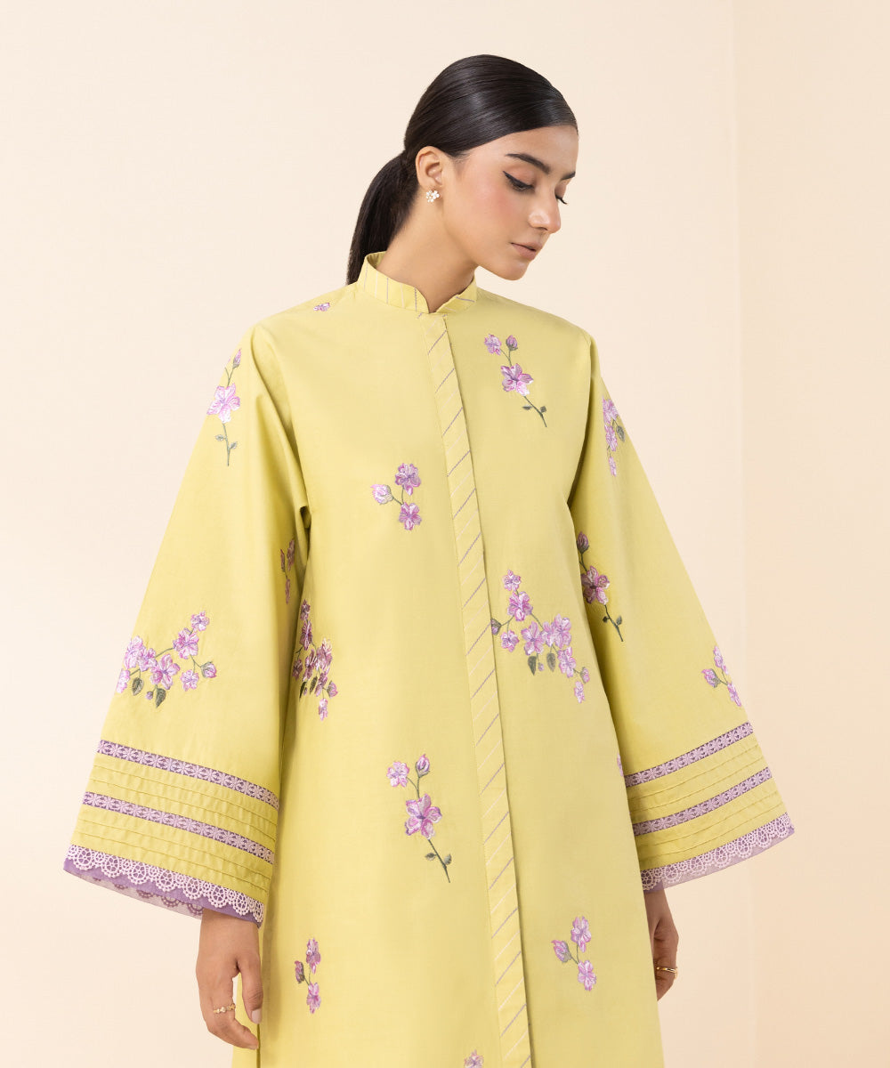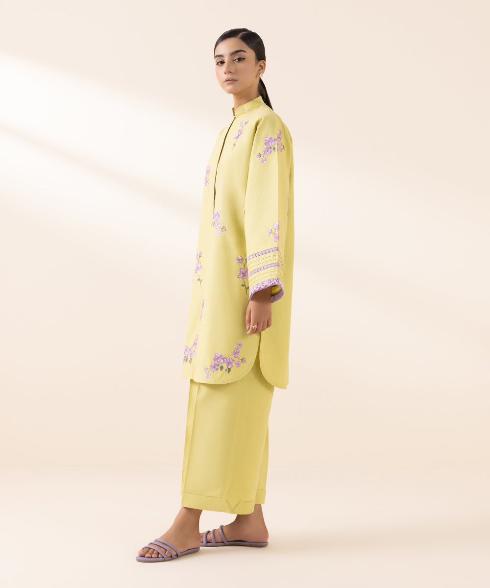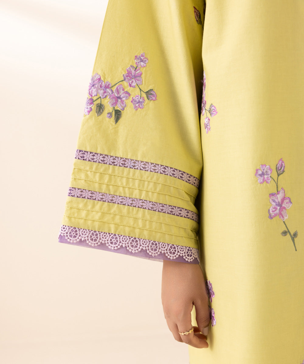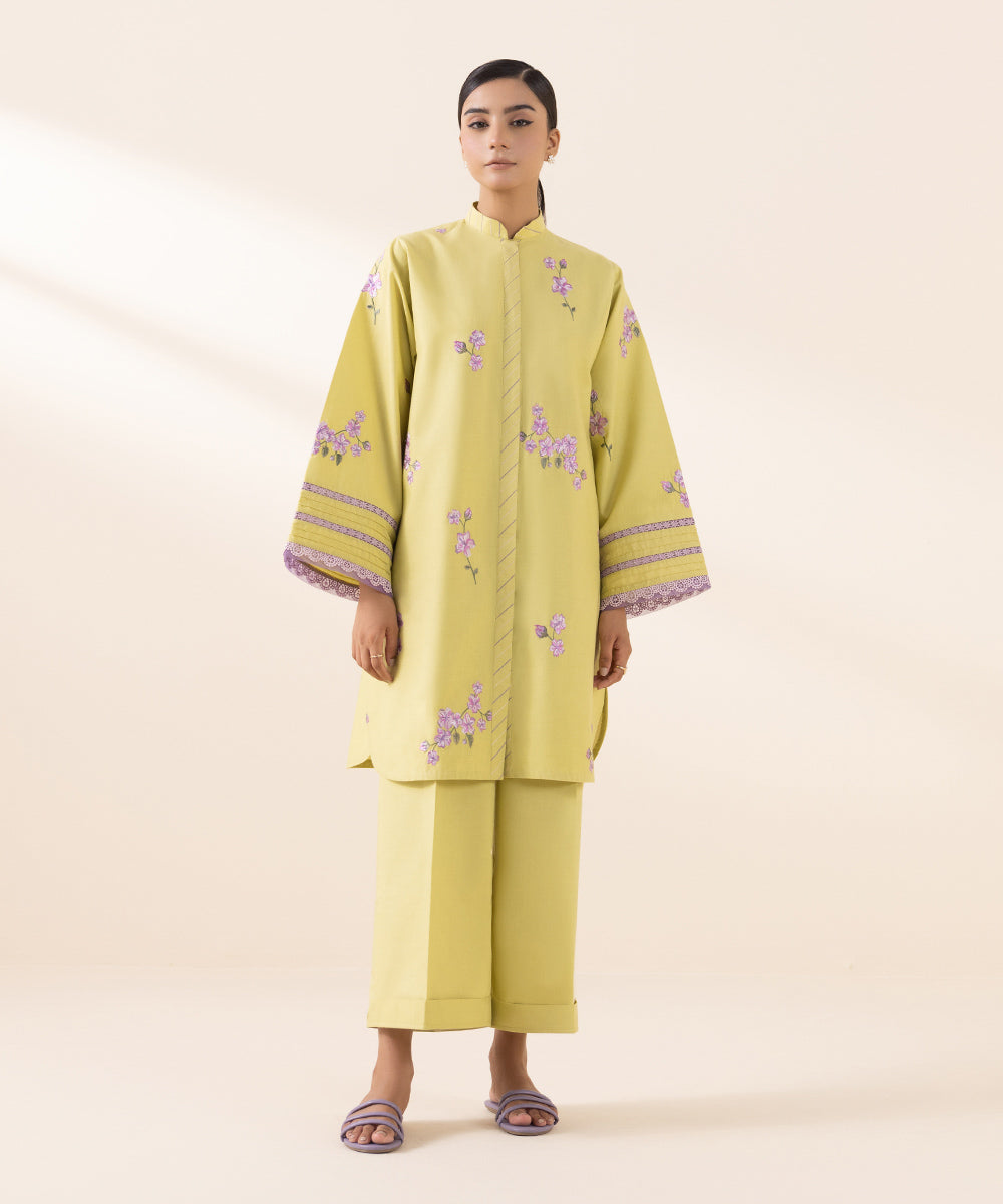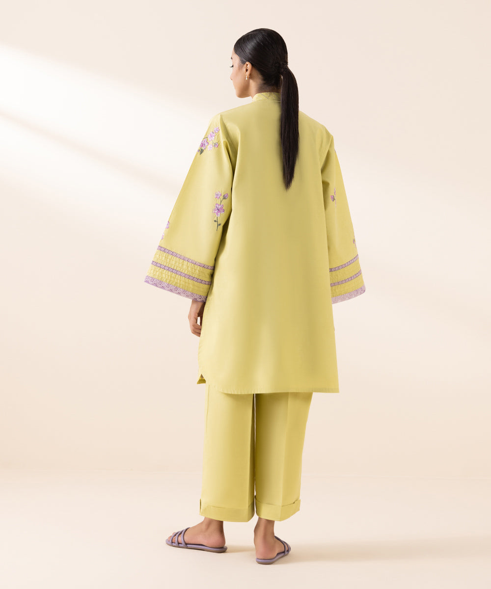 Experience blooming florals in our lime yellow, embroidered cambric two-piece featuring shirt and trousers.