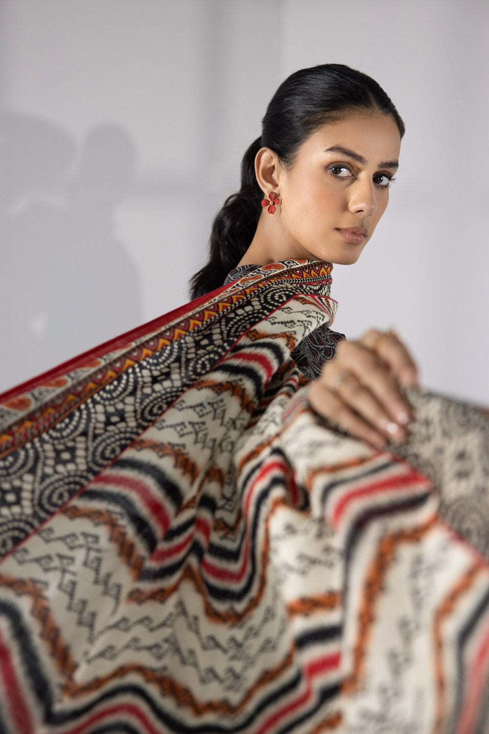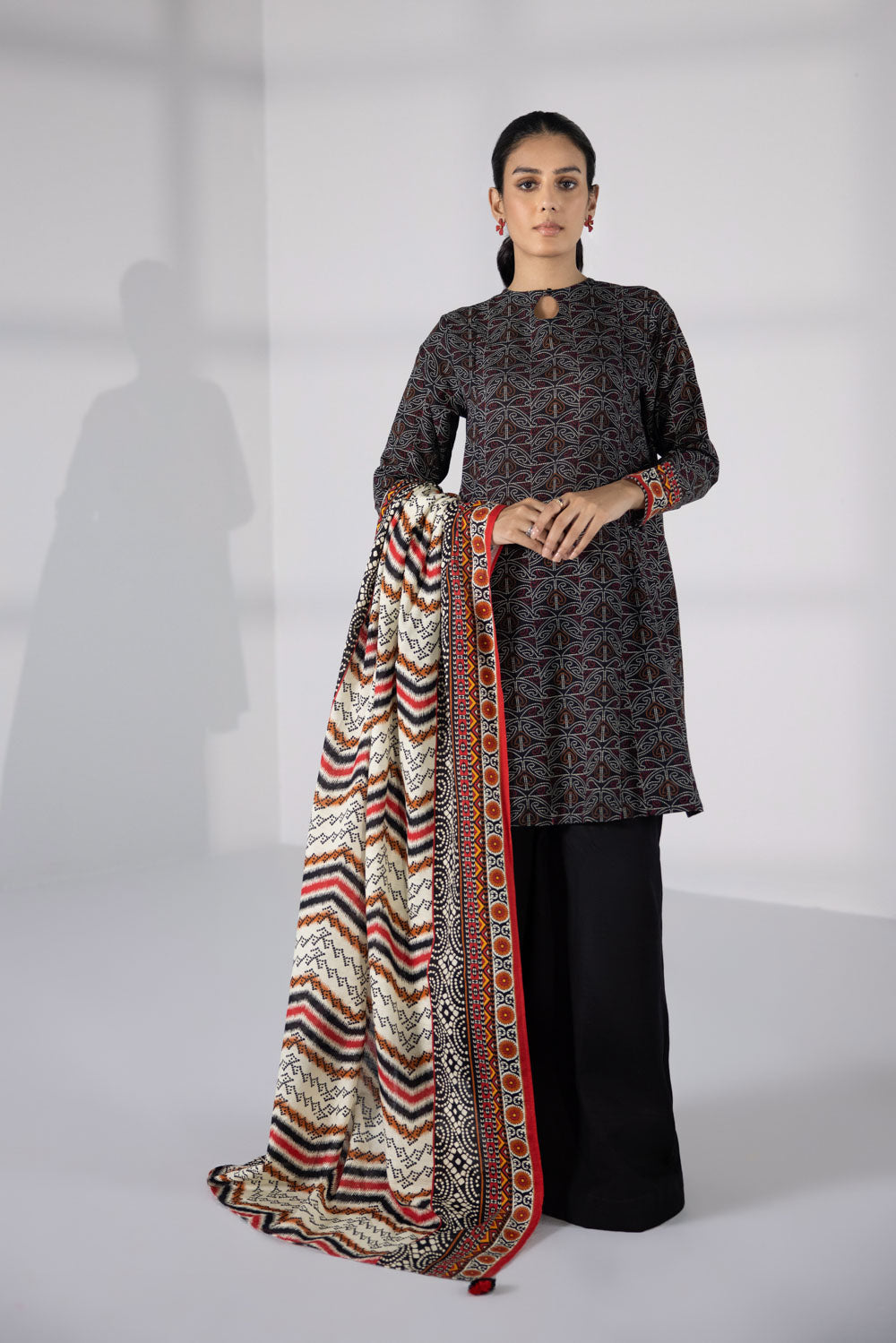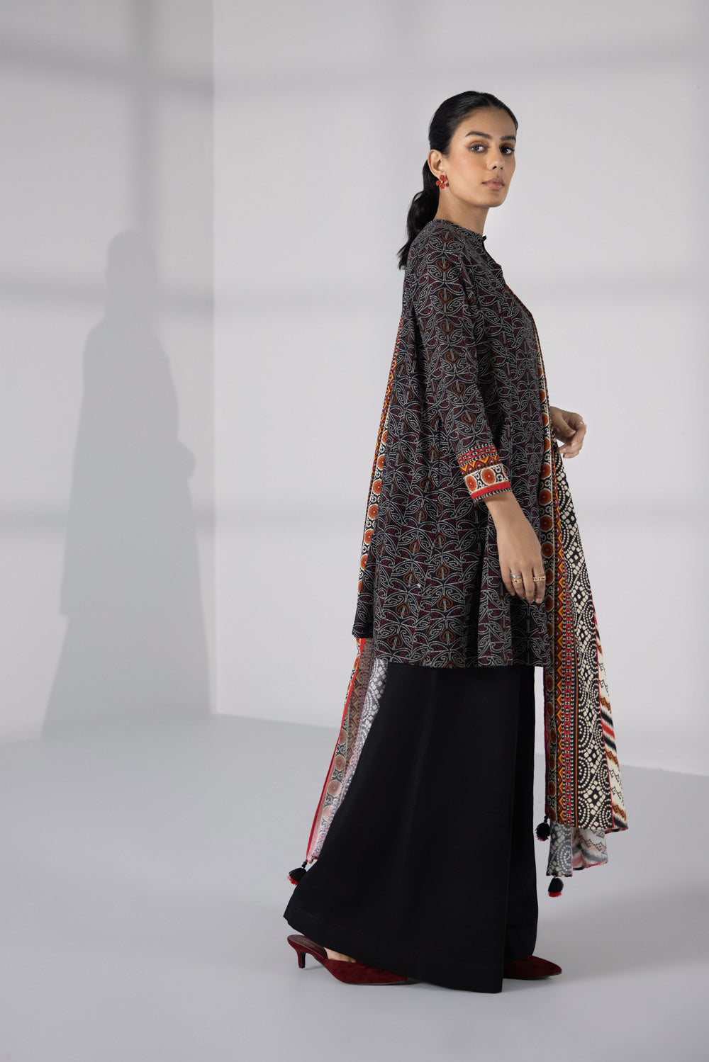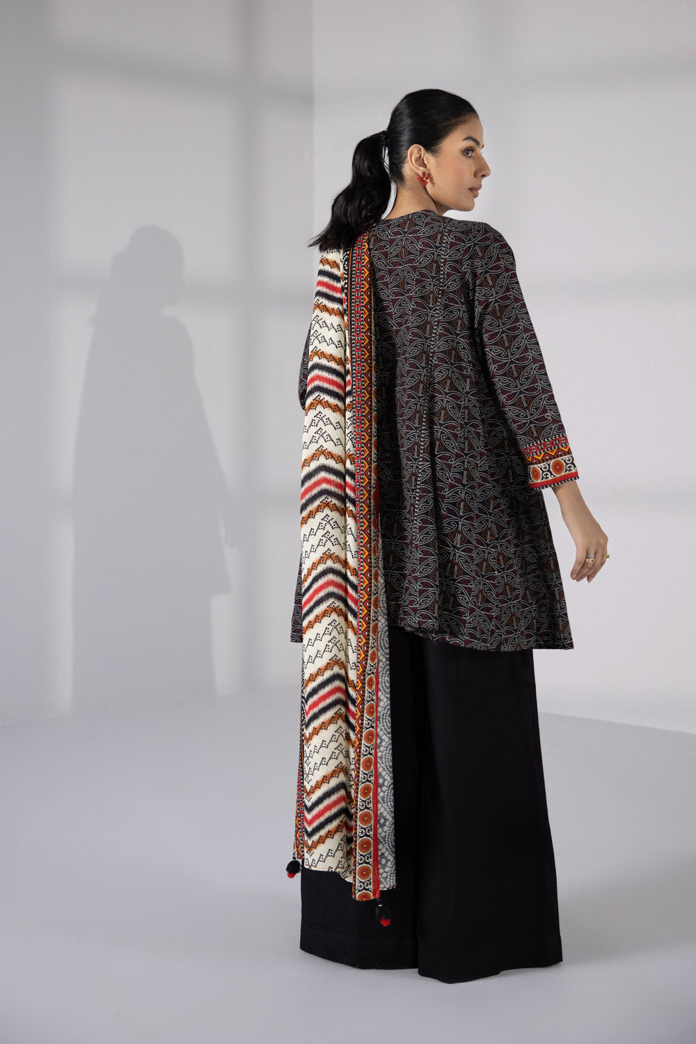 Exude grace with this abstract patterned black hued three-piece Lawn ensemble paired with multihued dupatta.